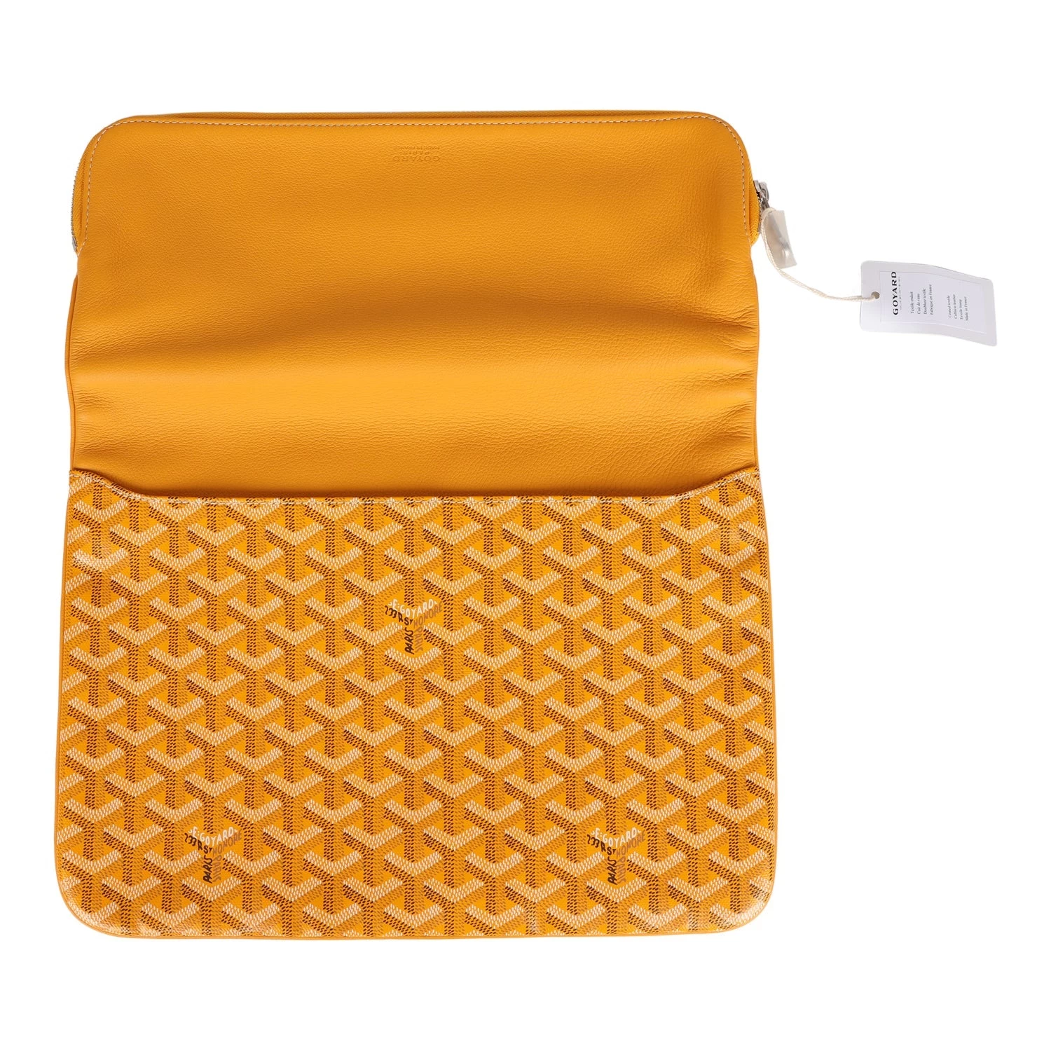 This Sainte-Marie GM Clutch is of Yellow Goyardine canvas and Chevroches Calfskin leather with Palladium hardware, zipper closure, one slip pocket on each side, and contrast stitching.Â