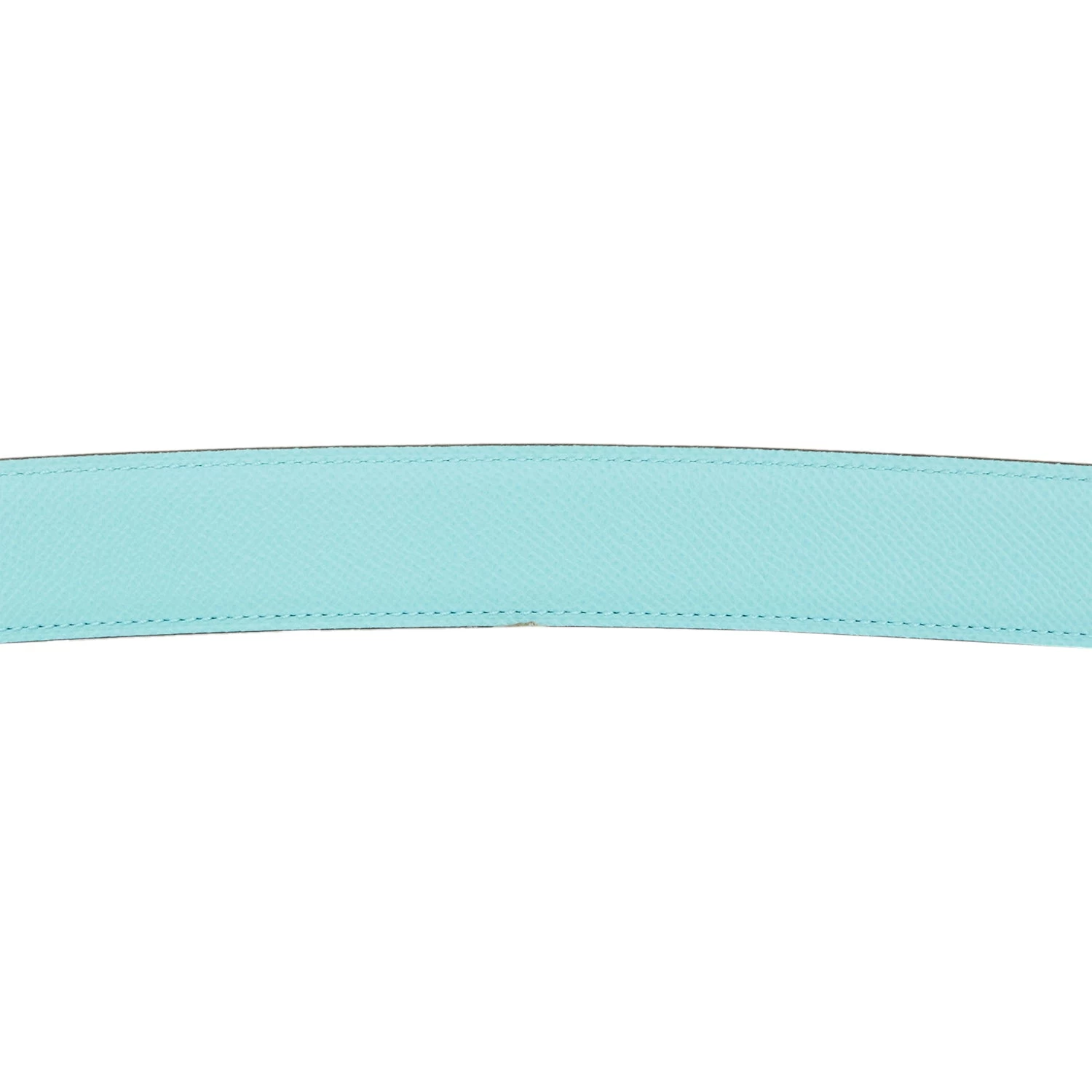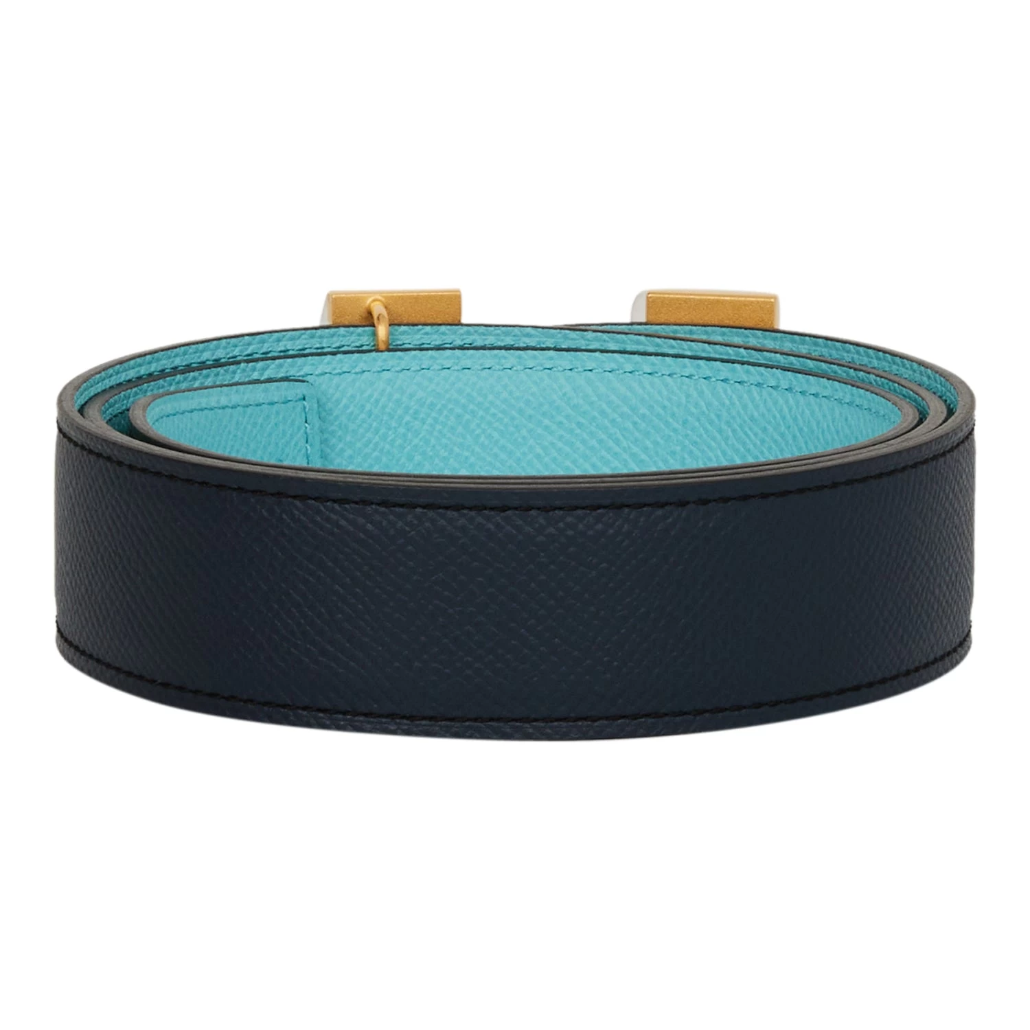 This Constance Belt kit has a wide belt strap in Bleu Indigo epsom leather reversing to Bleu Atoll epsom leather accompanied by removable H buckle of gold plated hardware.