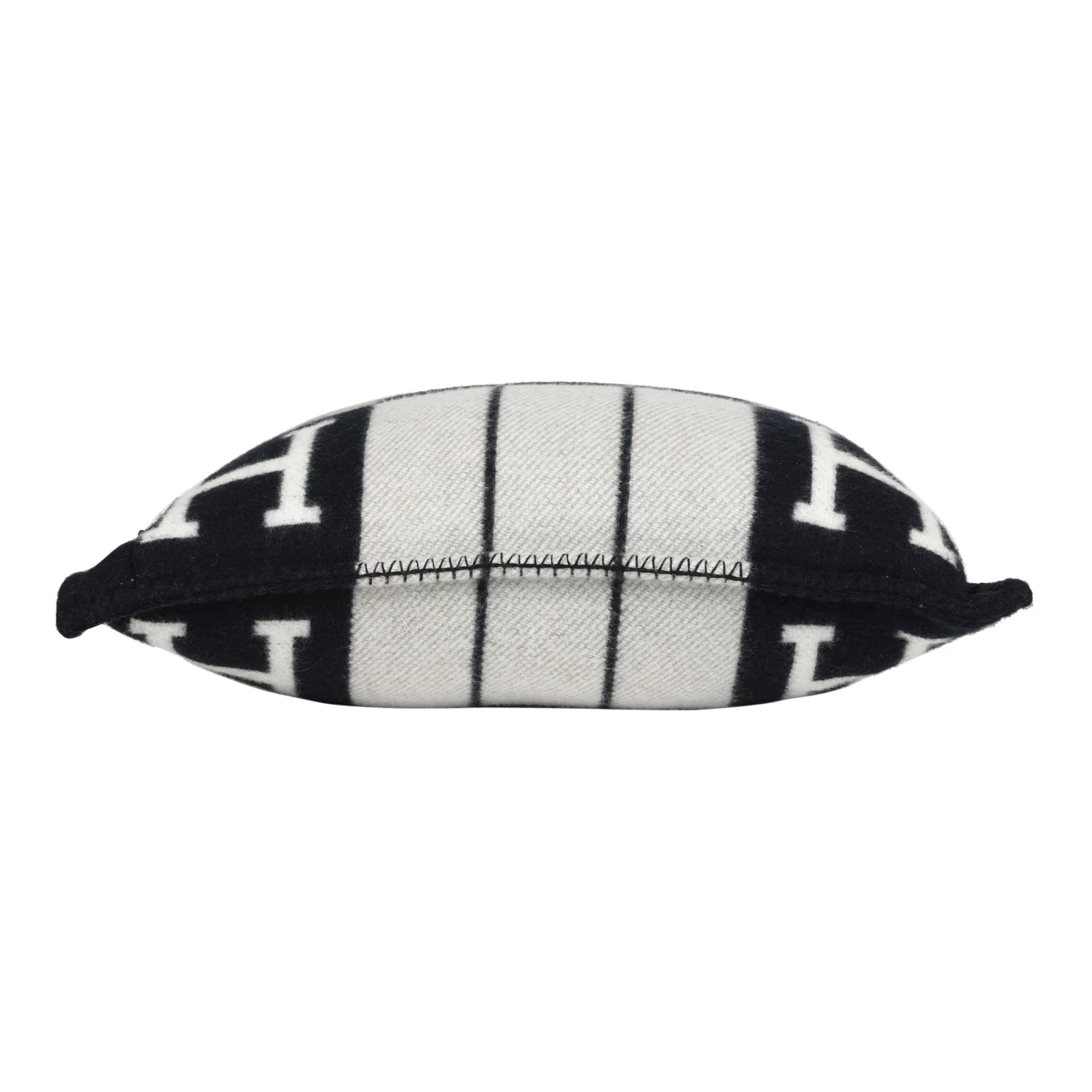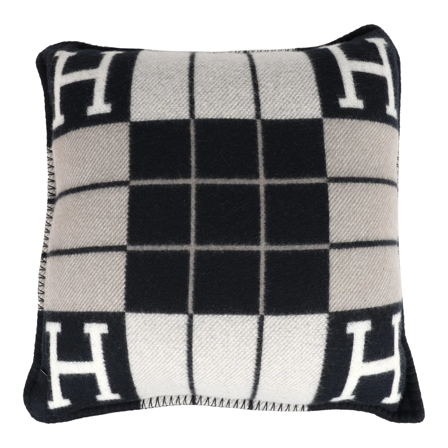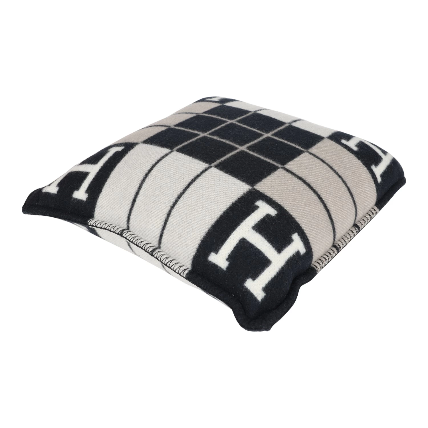 This Hermes “Avalon” III Signature H cushion PM in Ecru and Black is made of 90% Wool and 10% cashmere.