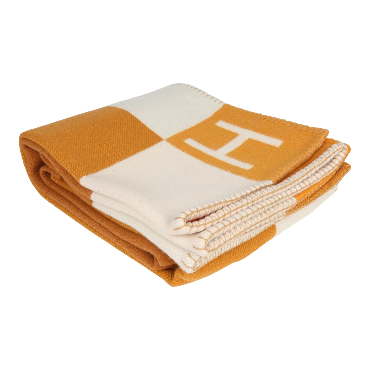 Hermes “Avalon Vibration” blanket in Ecru and Tisane made of 90% wool and 10% cashmere.