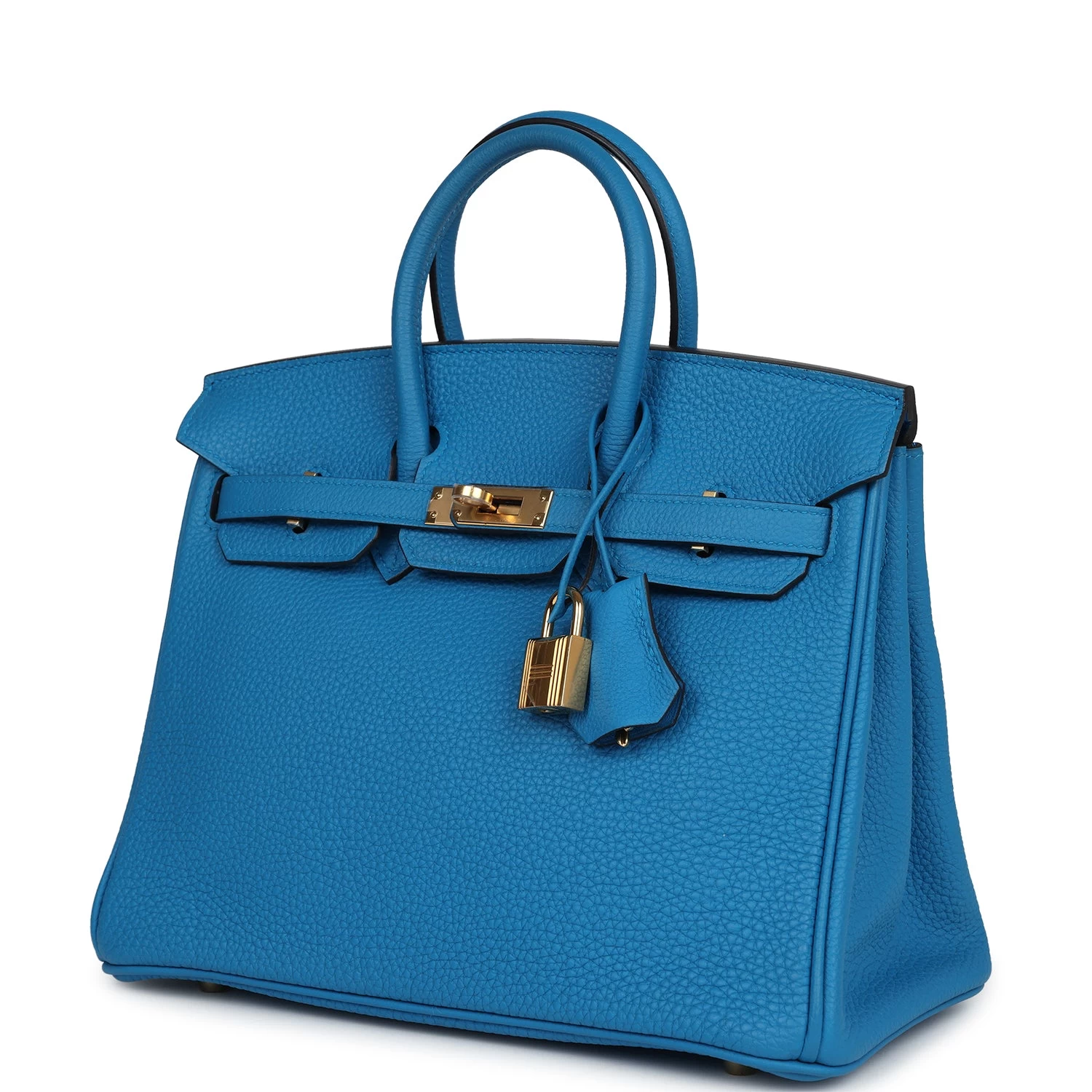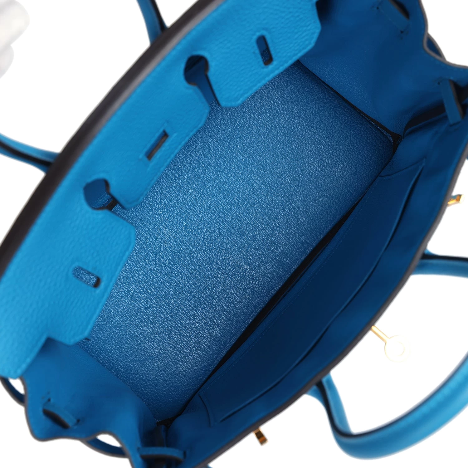 This Birkin is in Bleu Zanzibar Togo leather with gold hardware, tonal stitching, front flap with two straps, front toggle closure, clochette with lock and two keys, and double rolled handles.