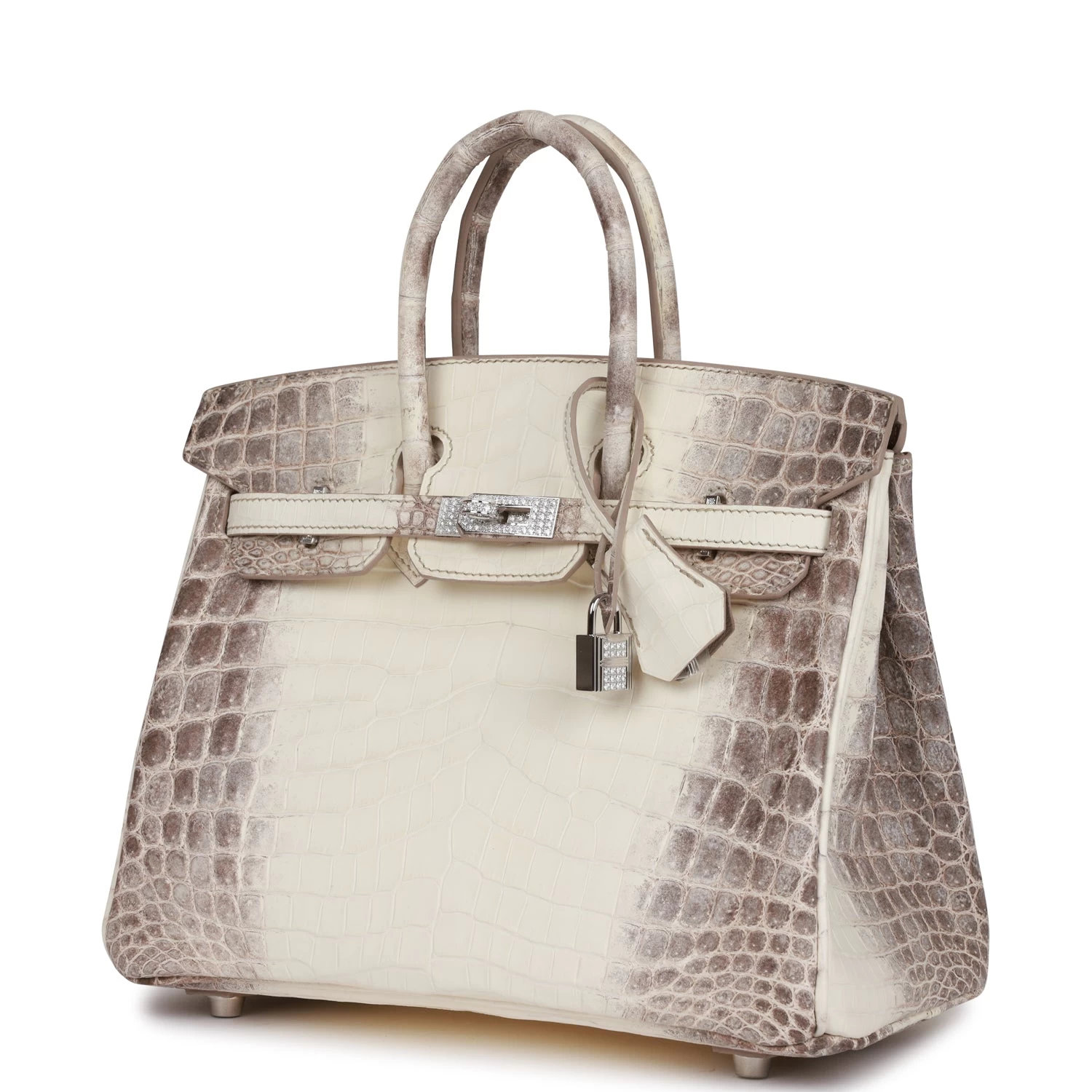 This rare Himalaya Birkin is in Niloticus crocodile with 18k white gold diamond encrusted hardware and has tonal stitching, front flap, two straps with center toggle closure, clochette with lock and two keys, and double rolled handles. This Himalayan features front toggle closure and clochette with lock and keys, encrusted with 18k white gold and 145 diamonds totaling 5.5 carats.