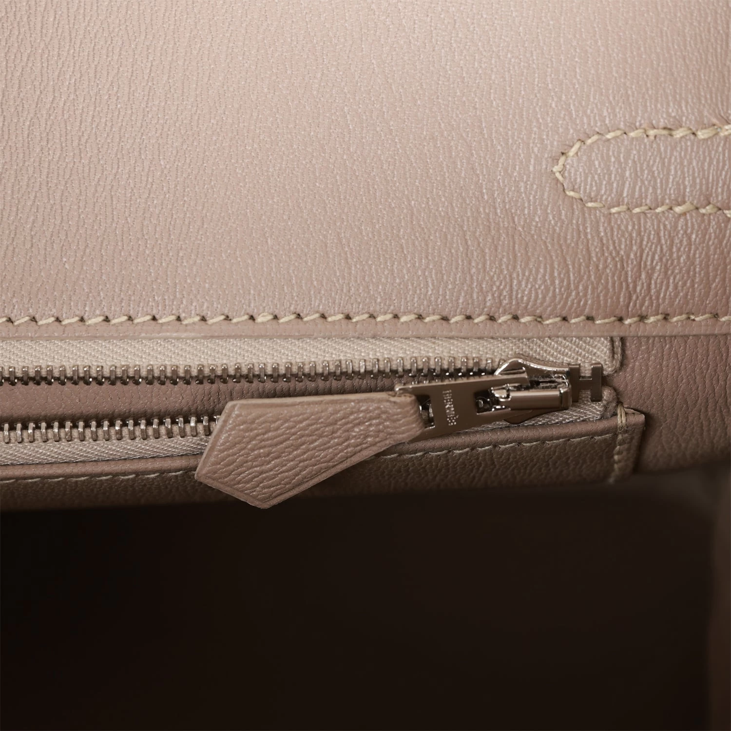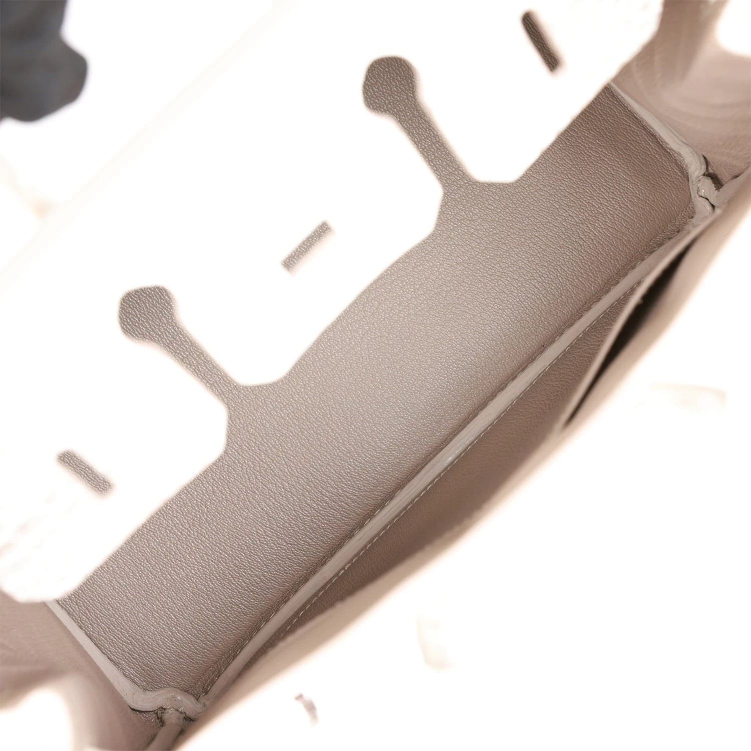 The interior is lined with Gris Perle chevre and has one zip pocket with an Hermes engraved zipper pull and an open pocket on the opposite side.