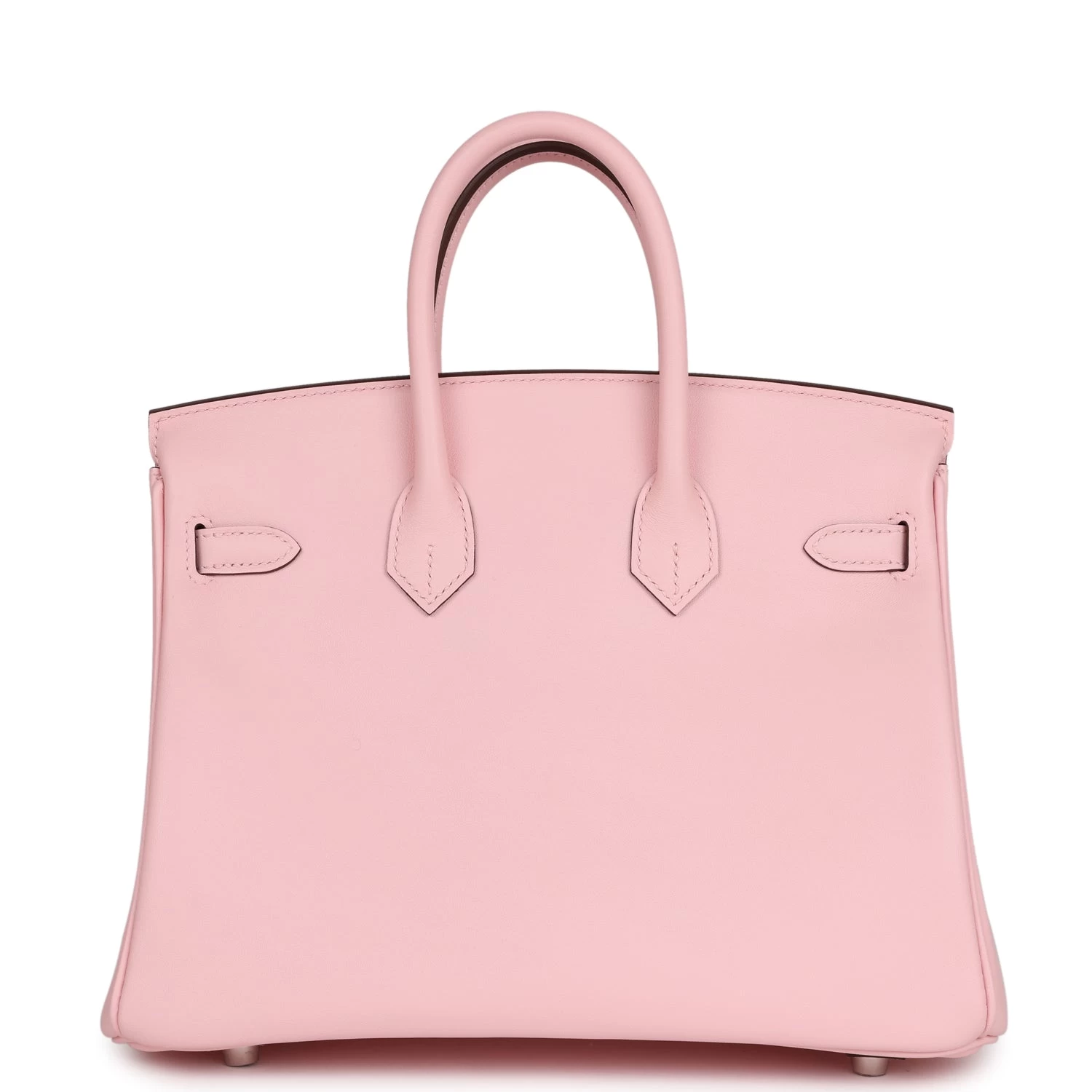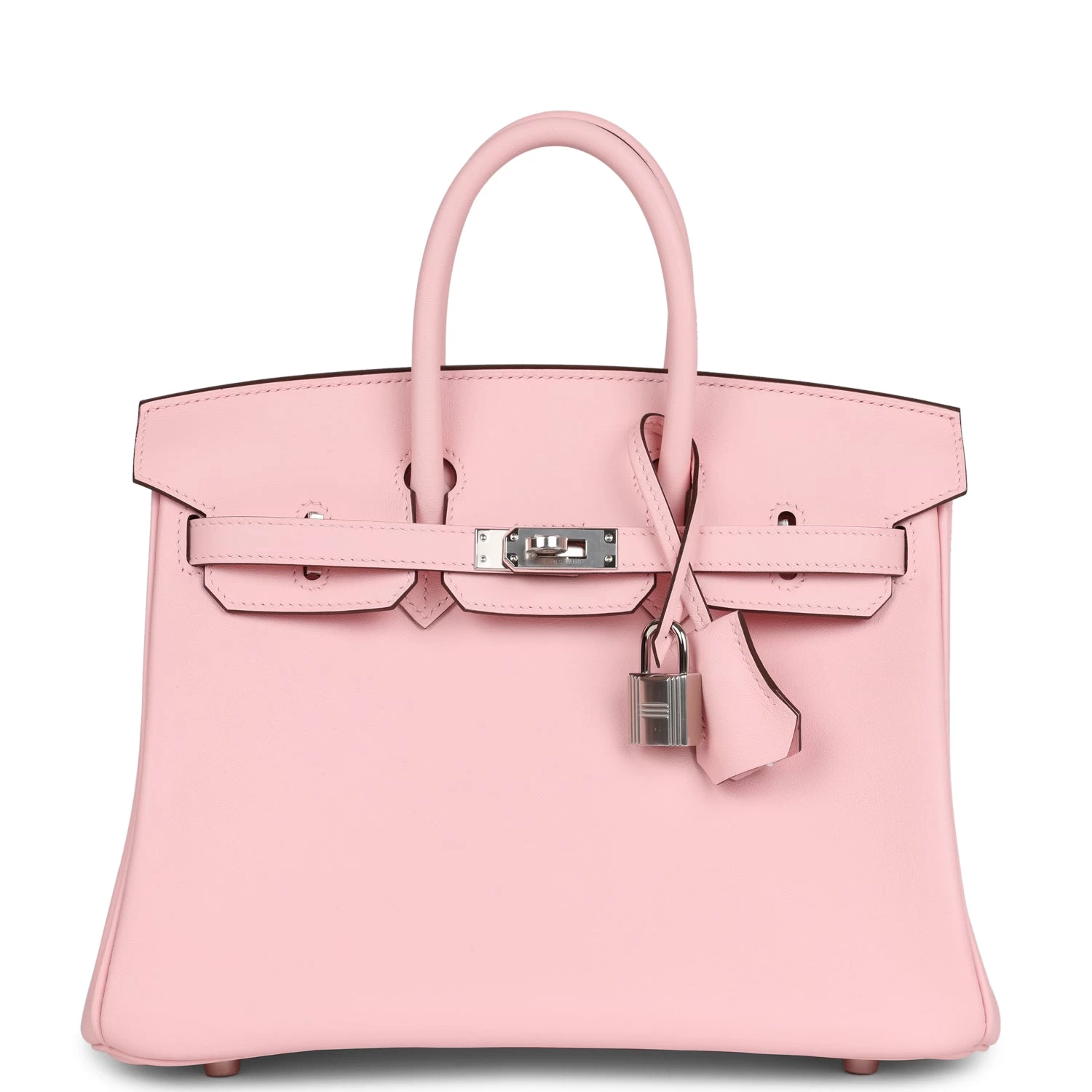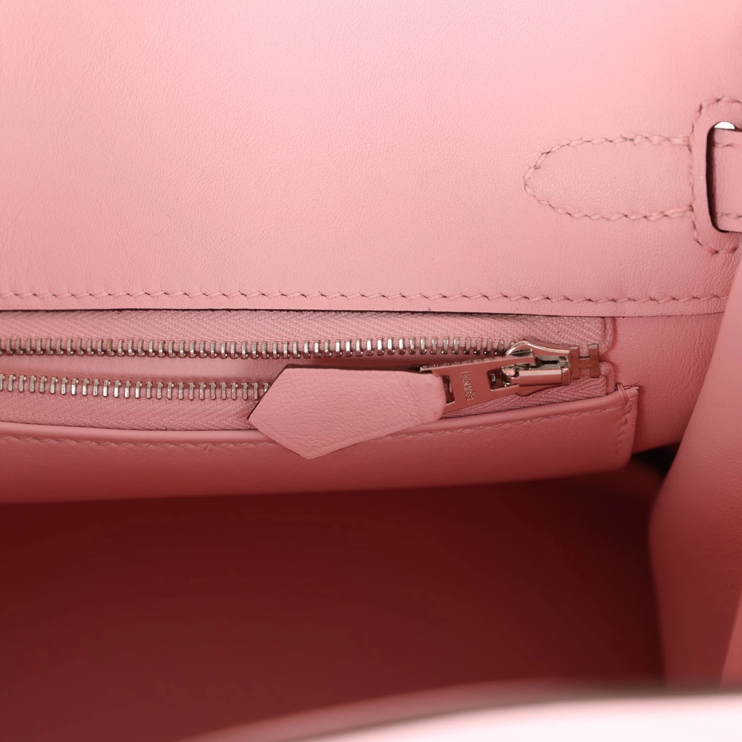 This Birkin is in Rose Sakura swift leather with palladium hardware and features tonal stitching, front flap, two straps with center toggle closure, clochette with lock and two keys, and double rolled handles.