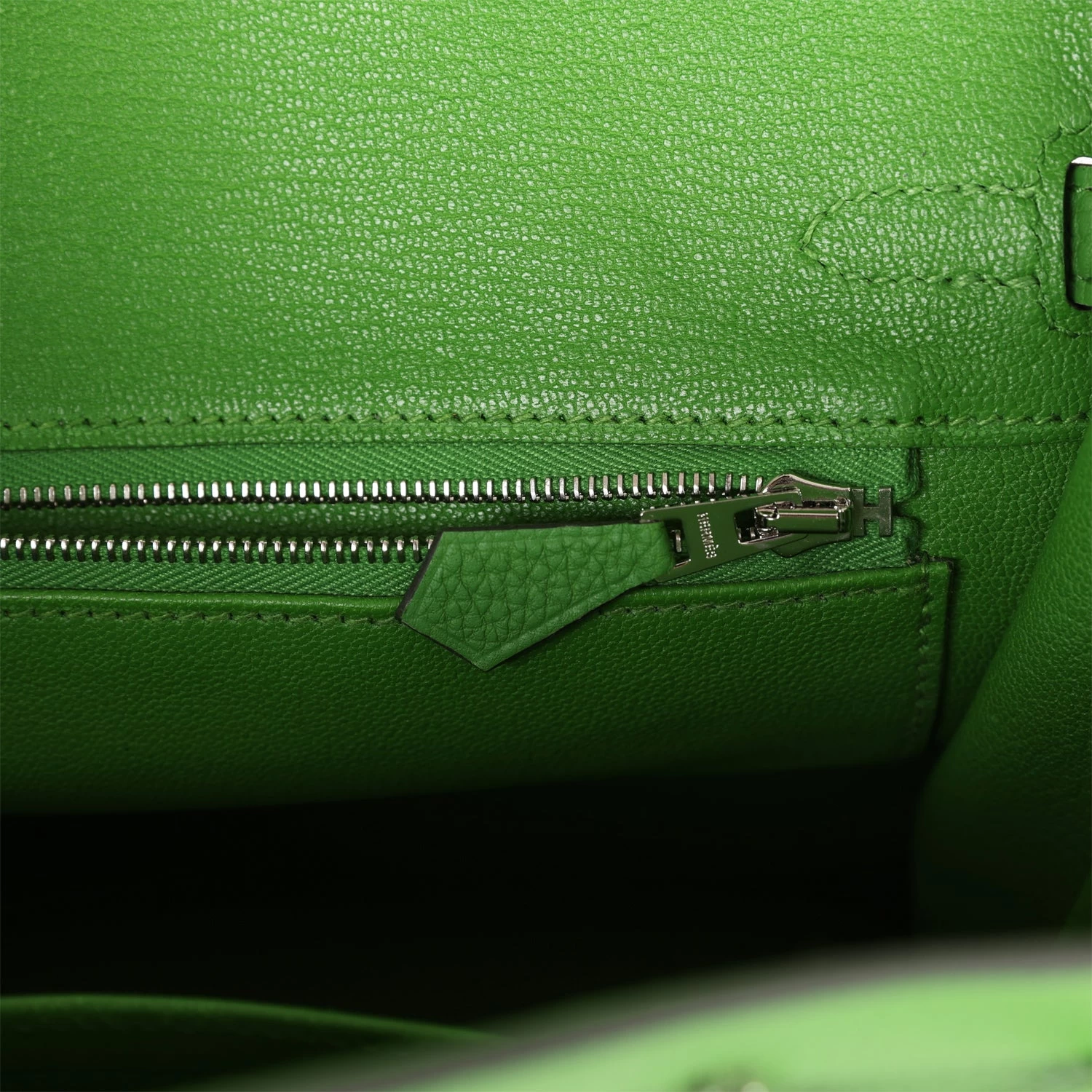 The interior is lined with Vert Yucca chevre and has one zip pocket with an Hermes engraved zipper pull and an open pocket on the opposite side.