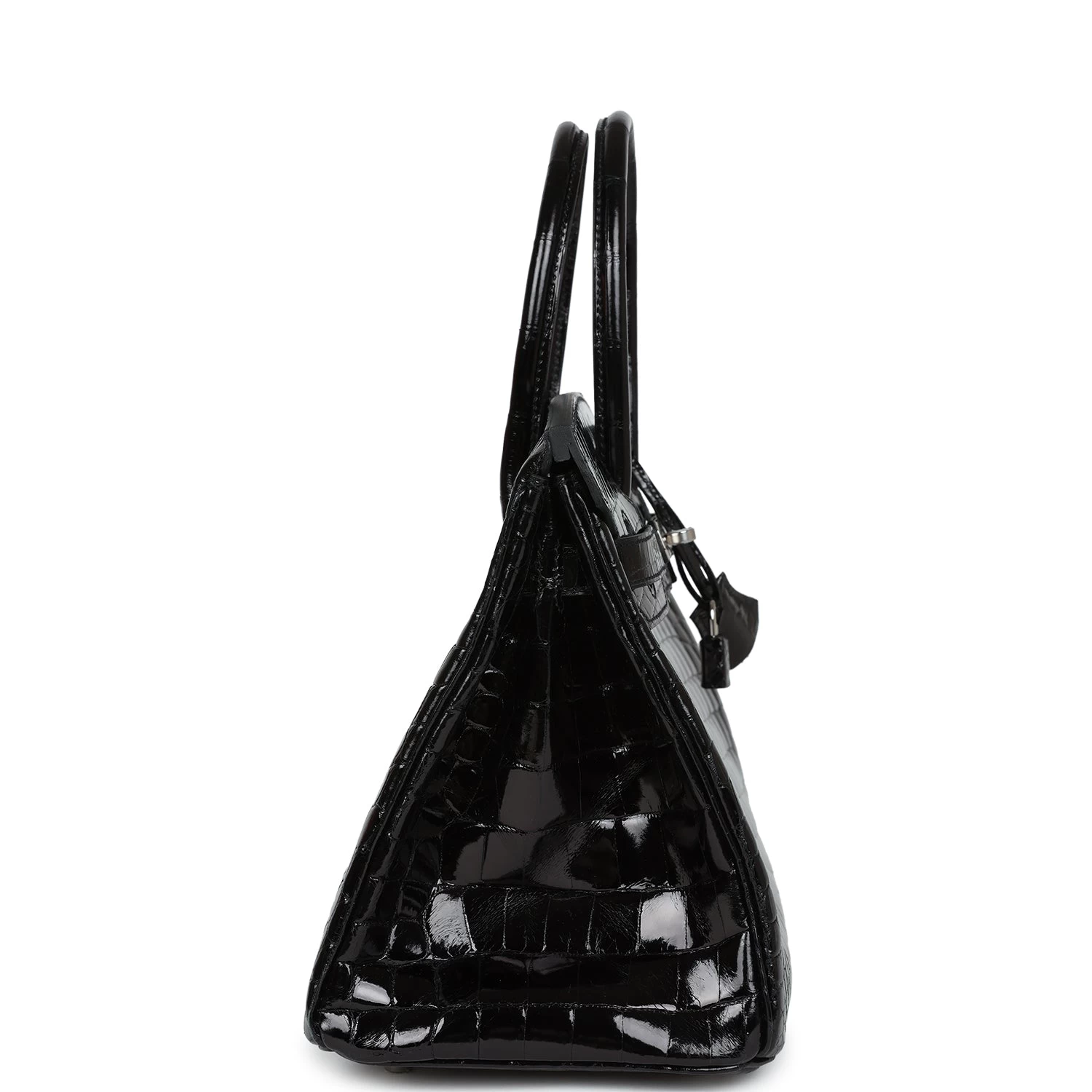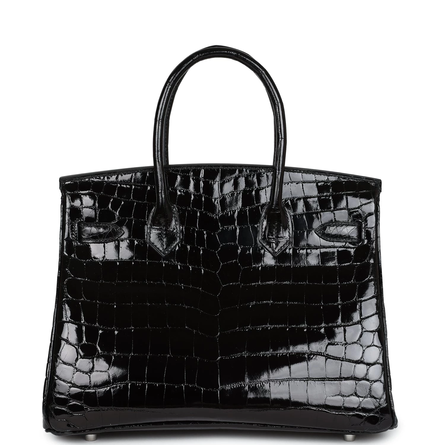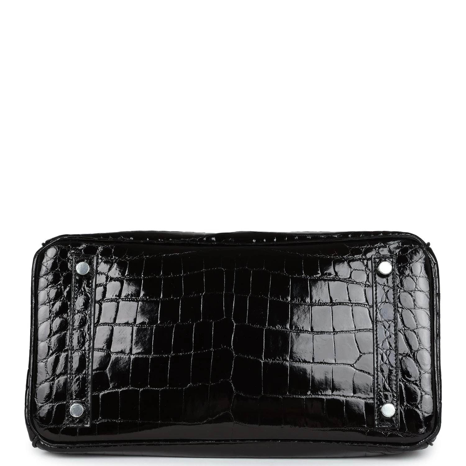 This Birkin is in Black Shiny Niloticus crocodile with palladium hardware and has tonal stitching, front flap, two straps with center toggle closure, clochette with lock and two keys, and double rolled handles.