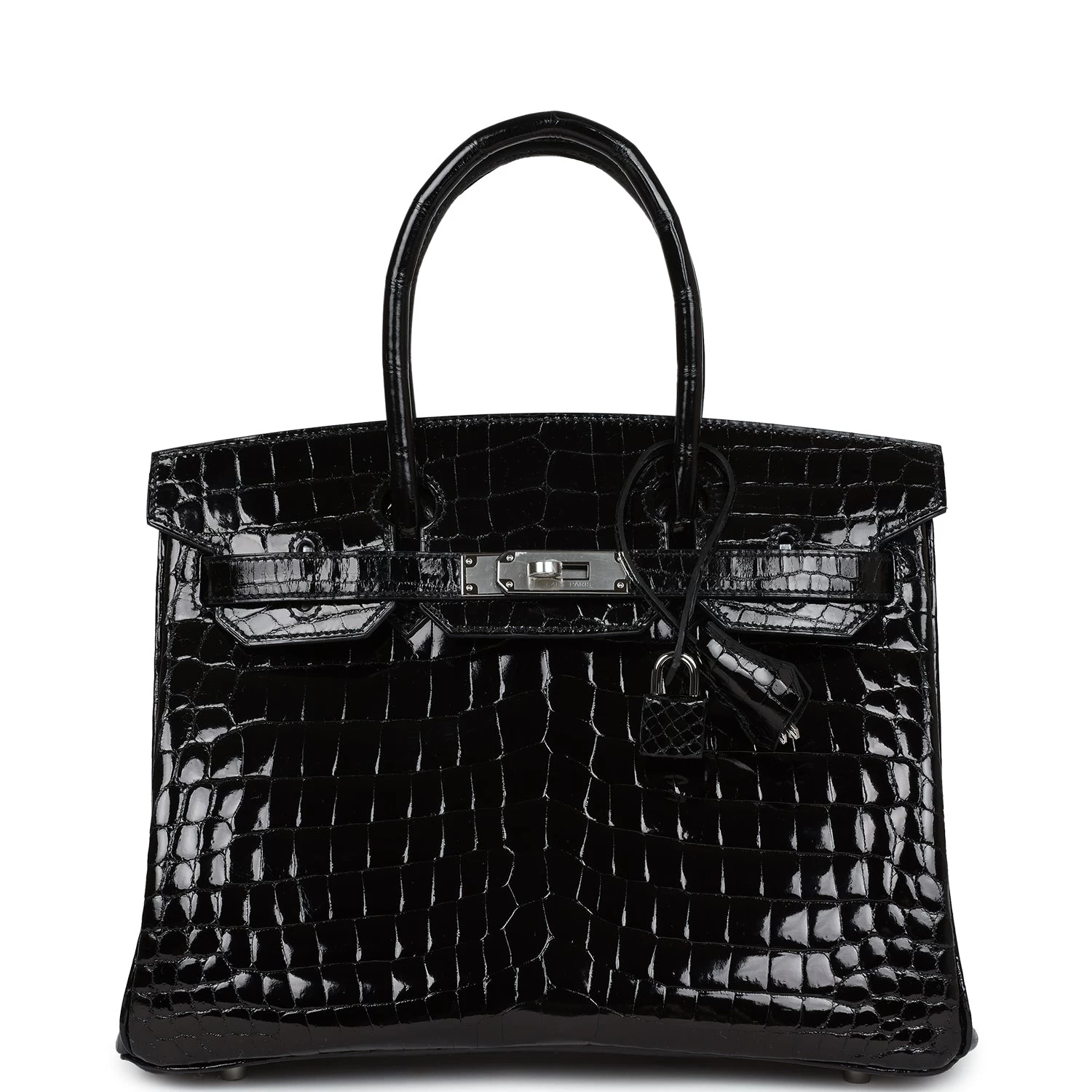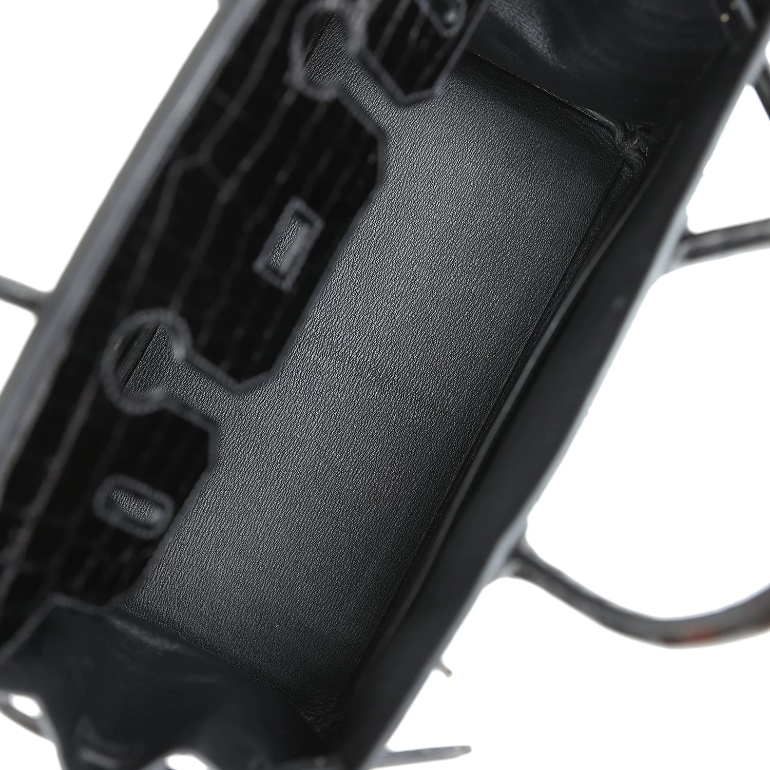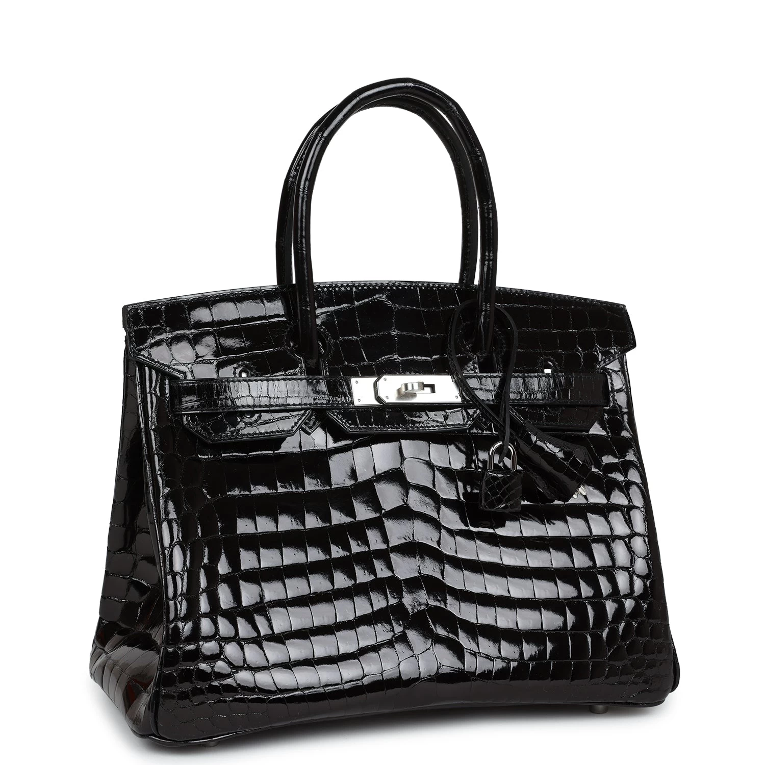 This Birkin is in Black Shiny Niloticus crocodile with palladium hardware and has tonal stitching, front flap, two straps with center toggle closure, clochette with lock and two keys, and double rolled handles.