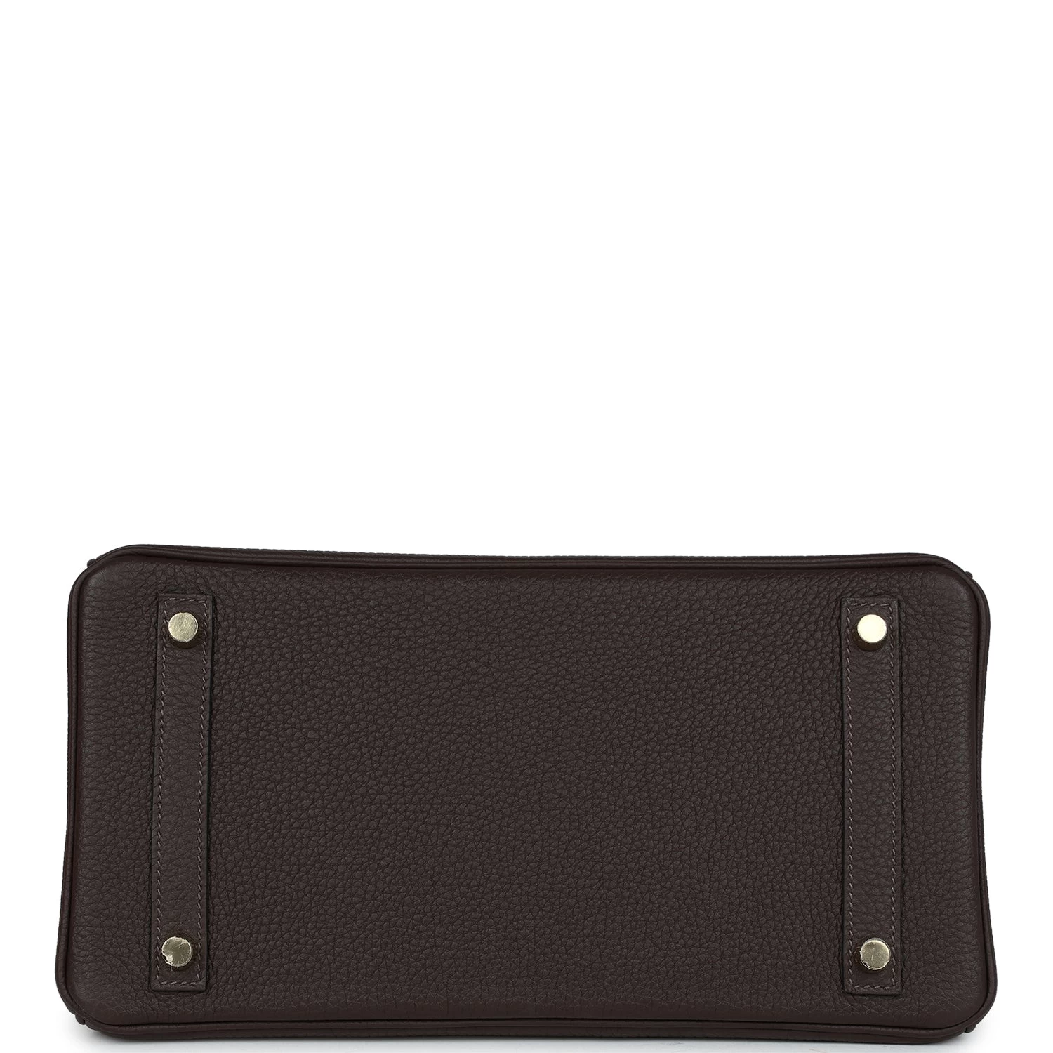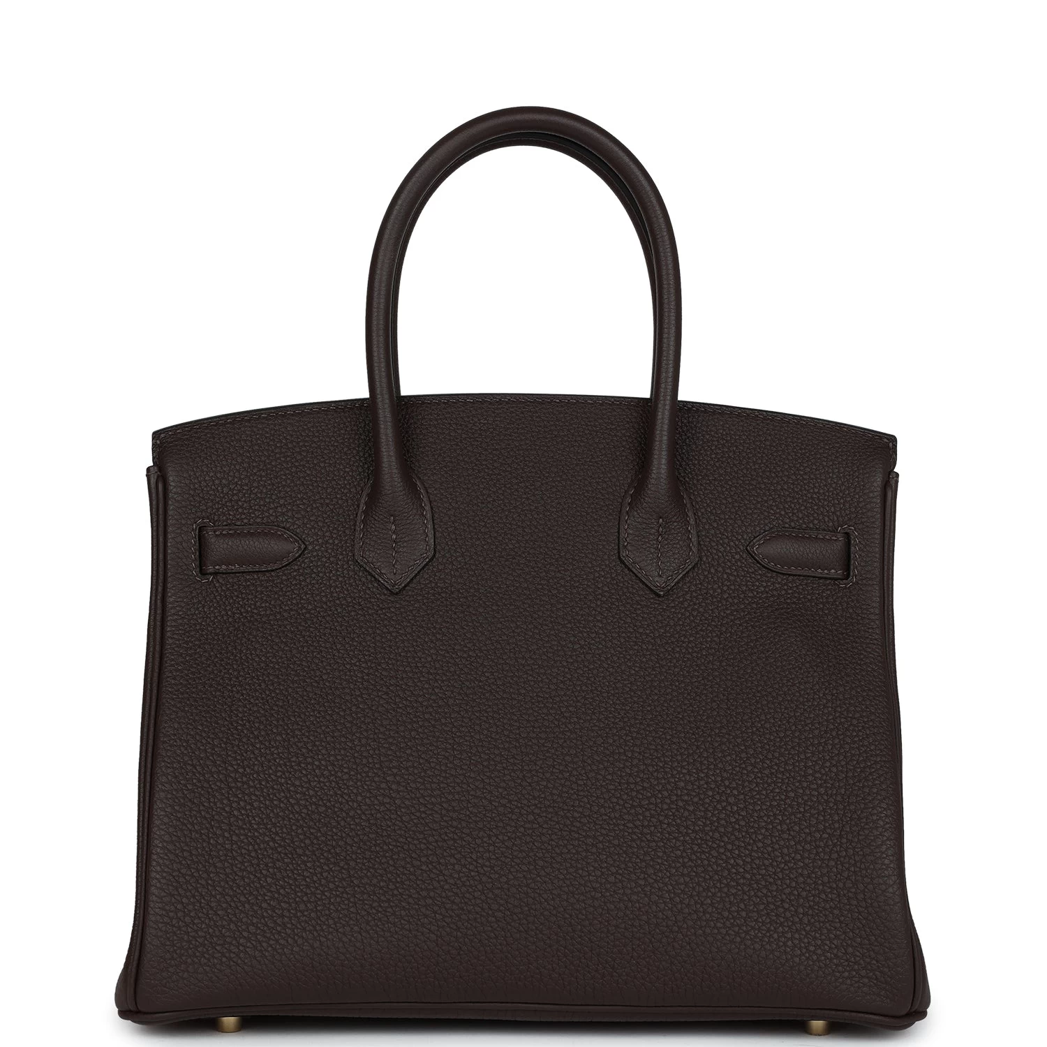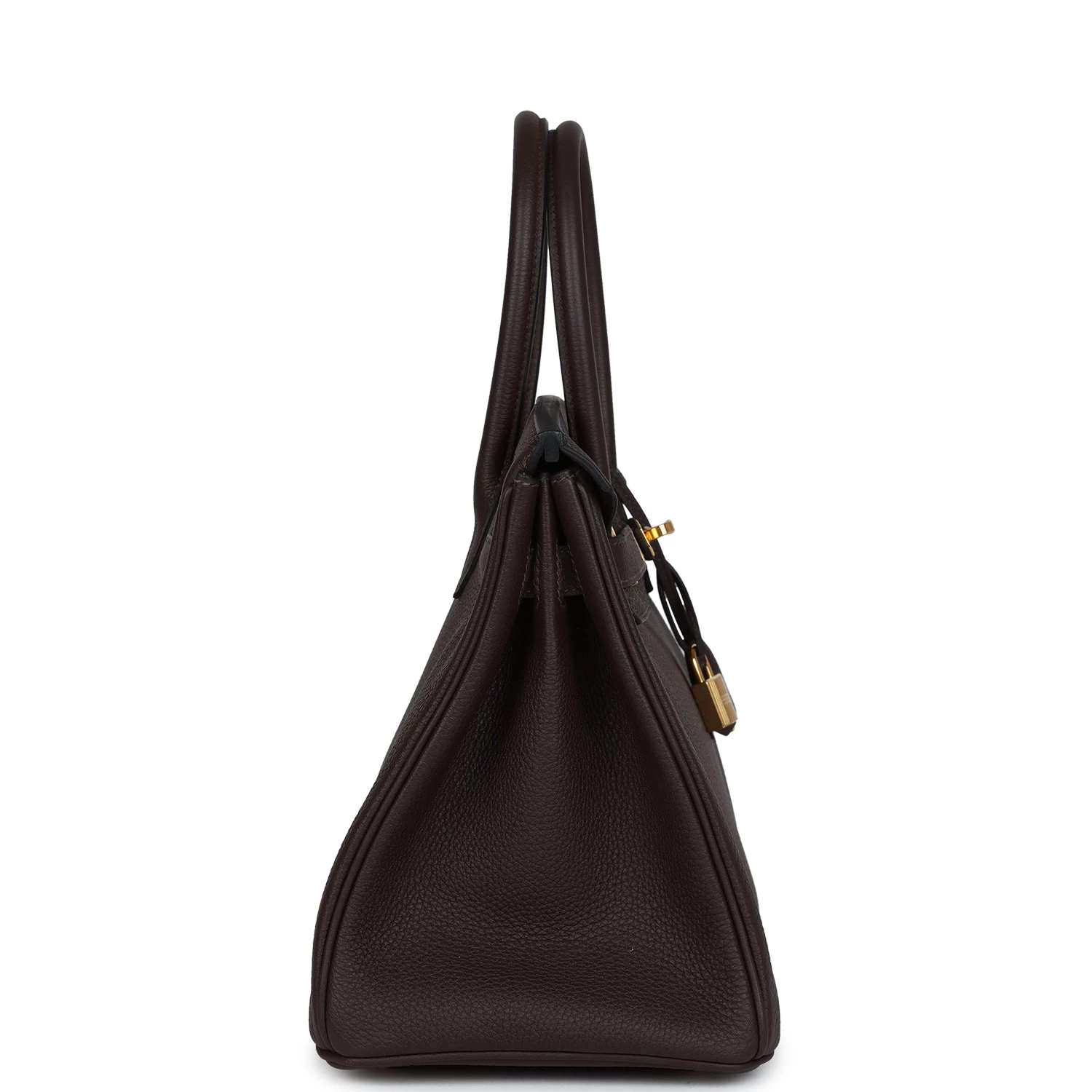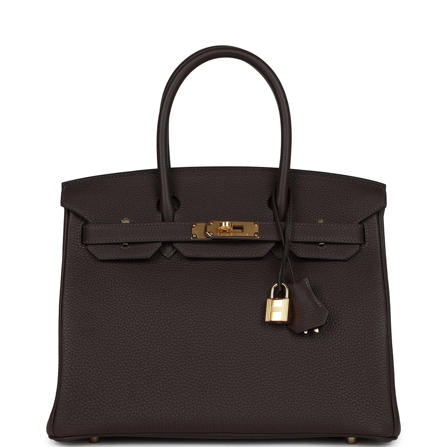 This Birkin is in Ebene togo leather with gold hardware and has tonal stitching, front flap, two straps with center toggle closure, clochette with lock and two keys, and double rolled handles.