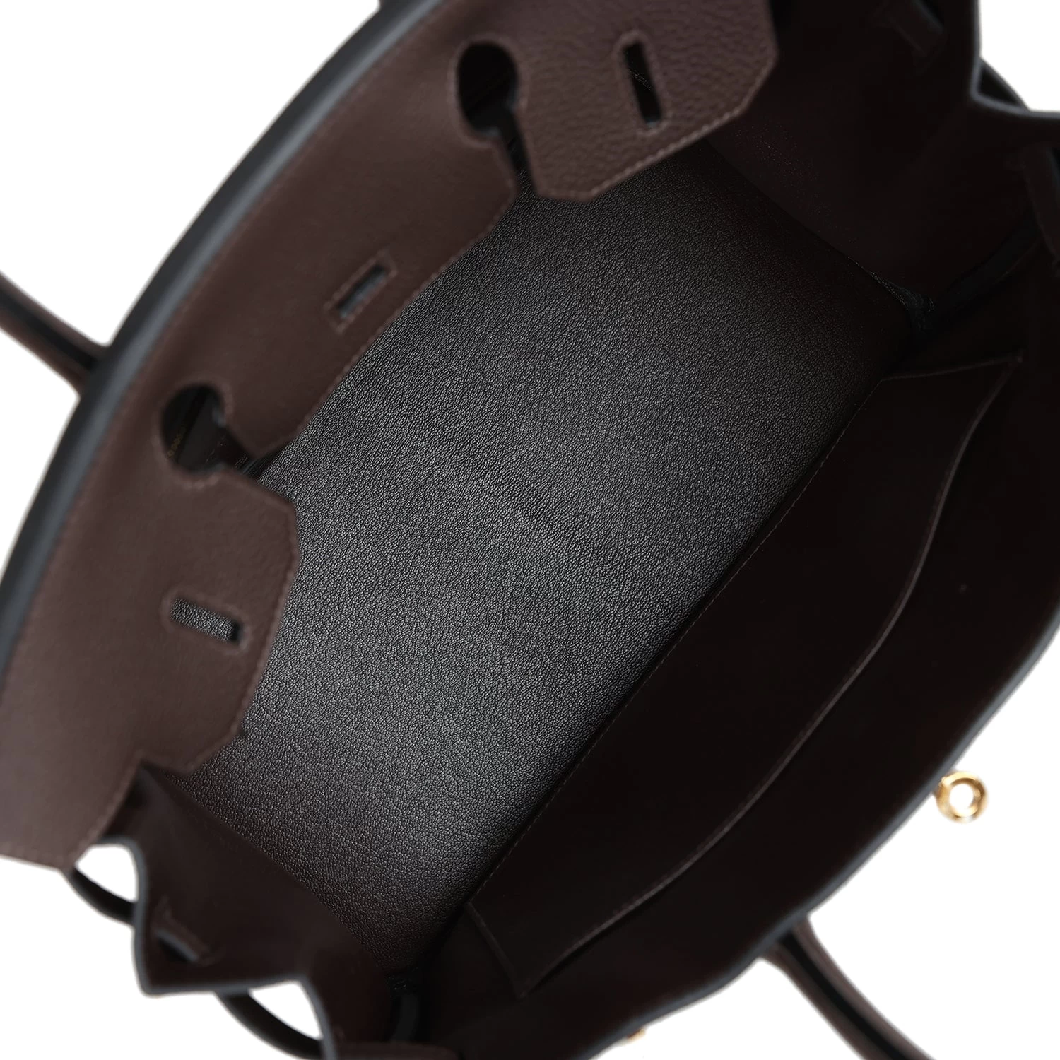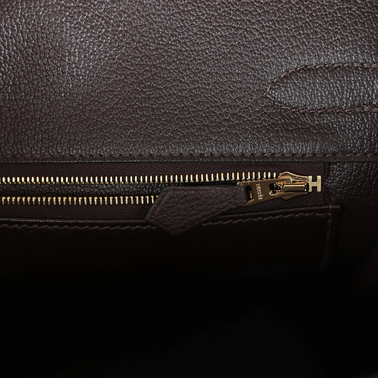 The interior is lined with Ebene chevre and has one zip pocket with an Hermes engraved zipper pull and an open pocket on the opposite side.