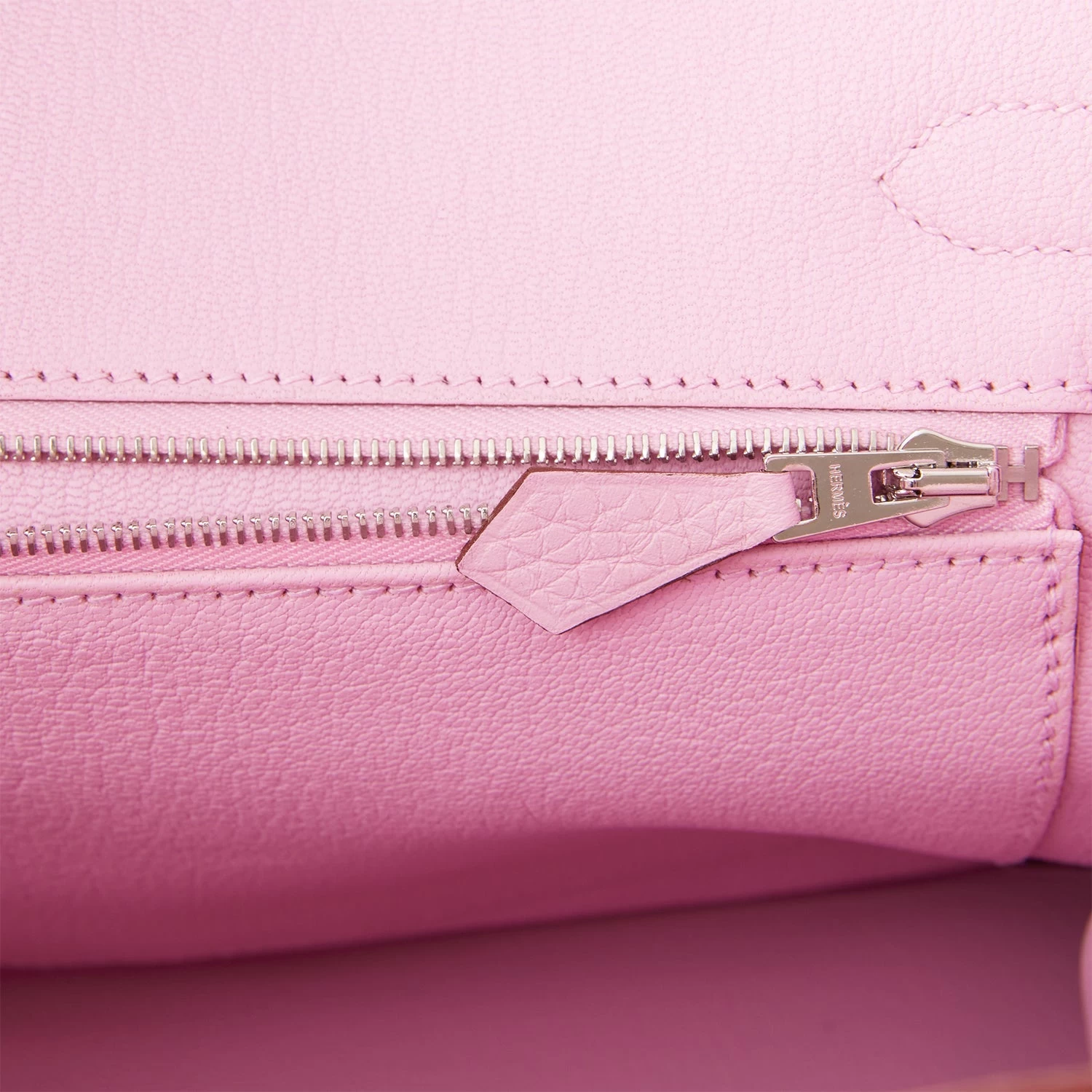 The interior is lined with Mauve Sylvestre chevre and has one zip pocket with an Hermes engraved zipper pull and an open pocket on the opposite side.