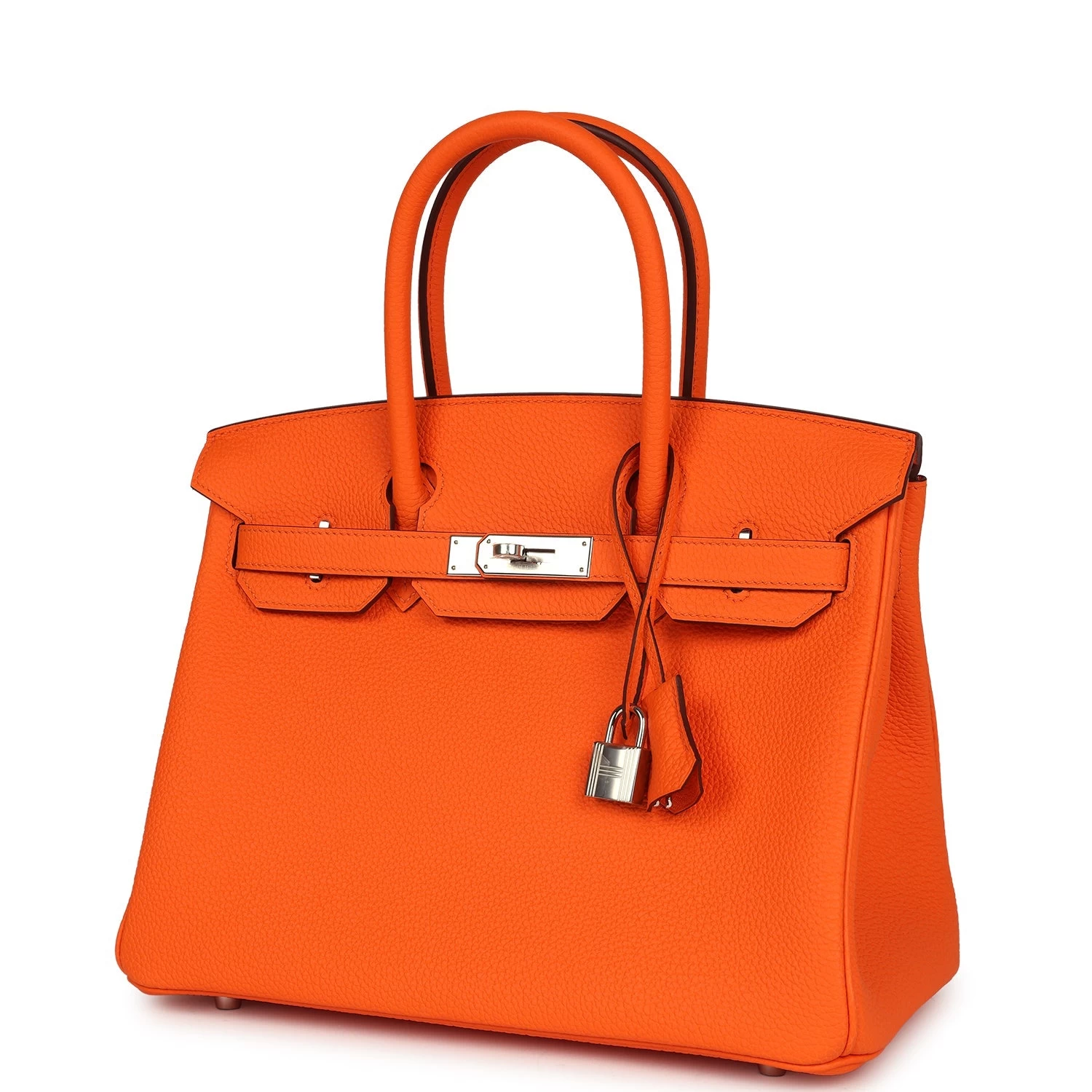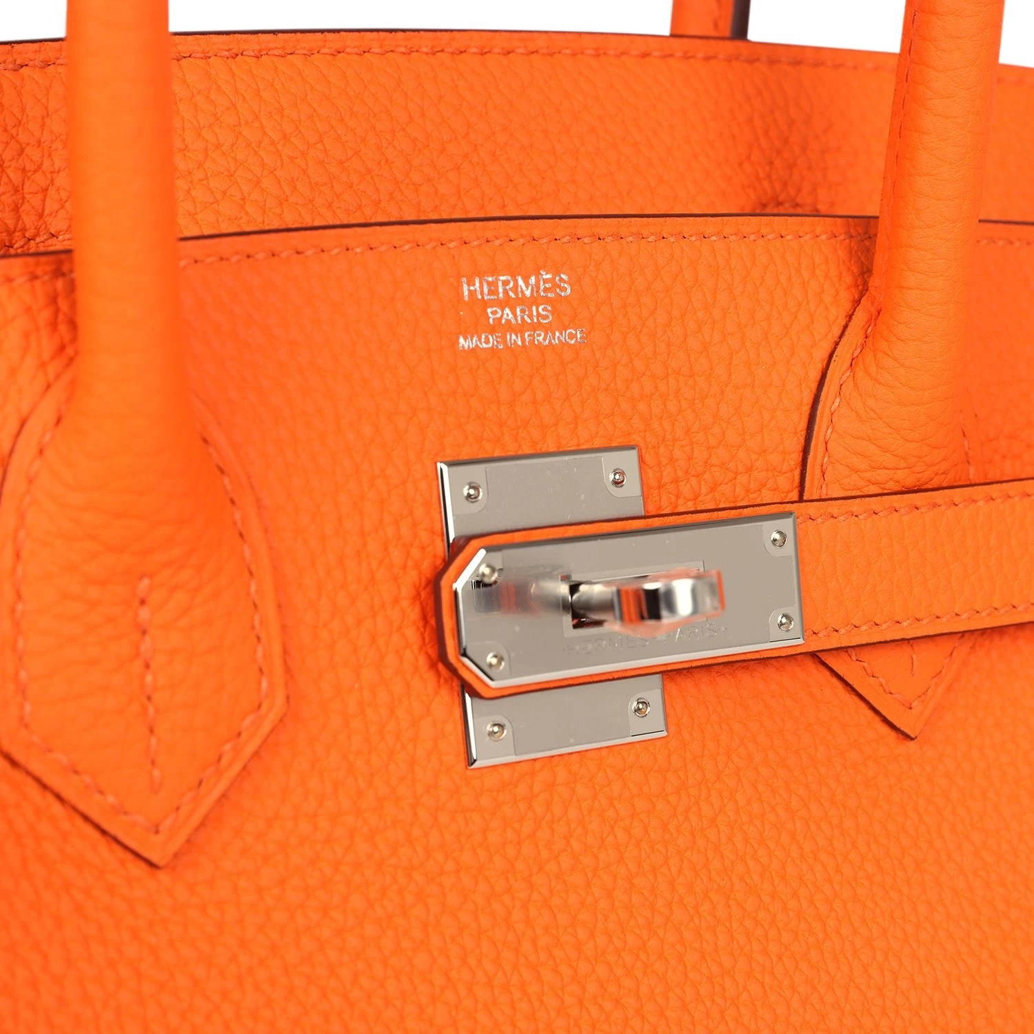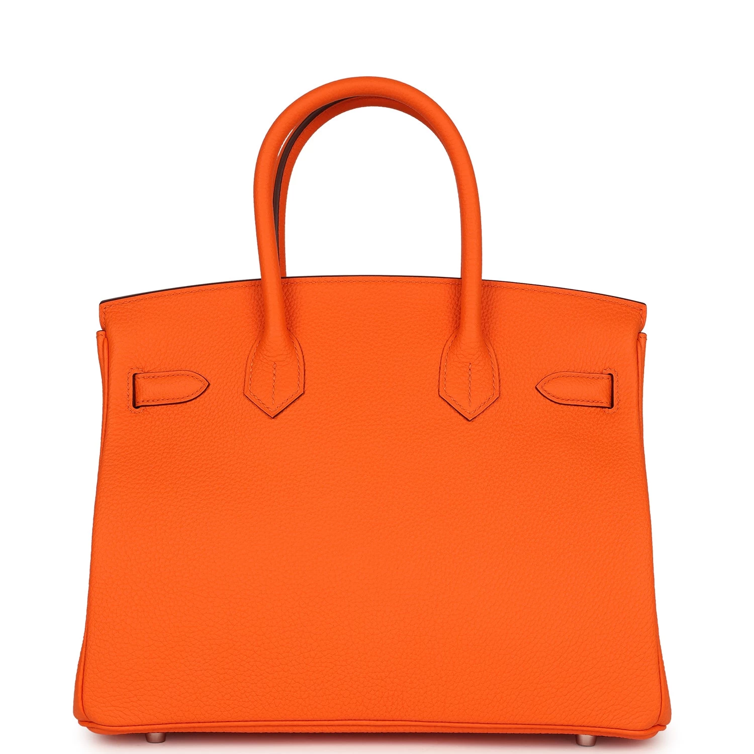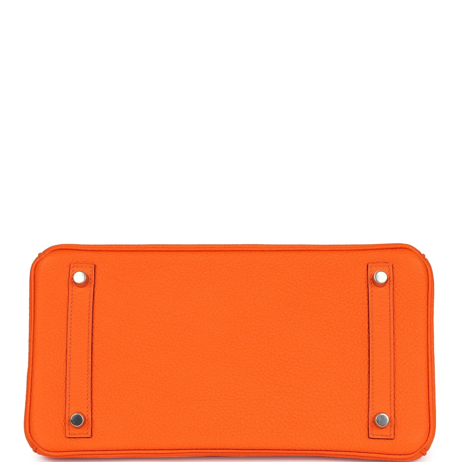 This Birkin is in Orange Minium togo leather with palladium hardware and has tonal stitching, front flap, two straps with center toggle closure, clochette with lock and two keys, and double rolled handles.
