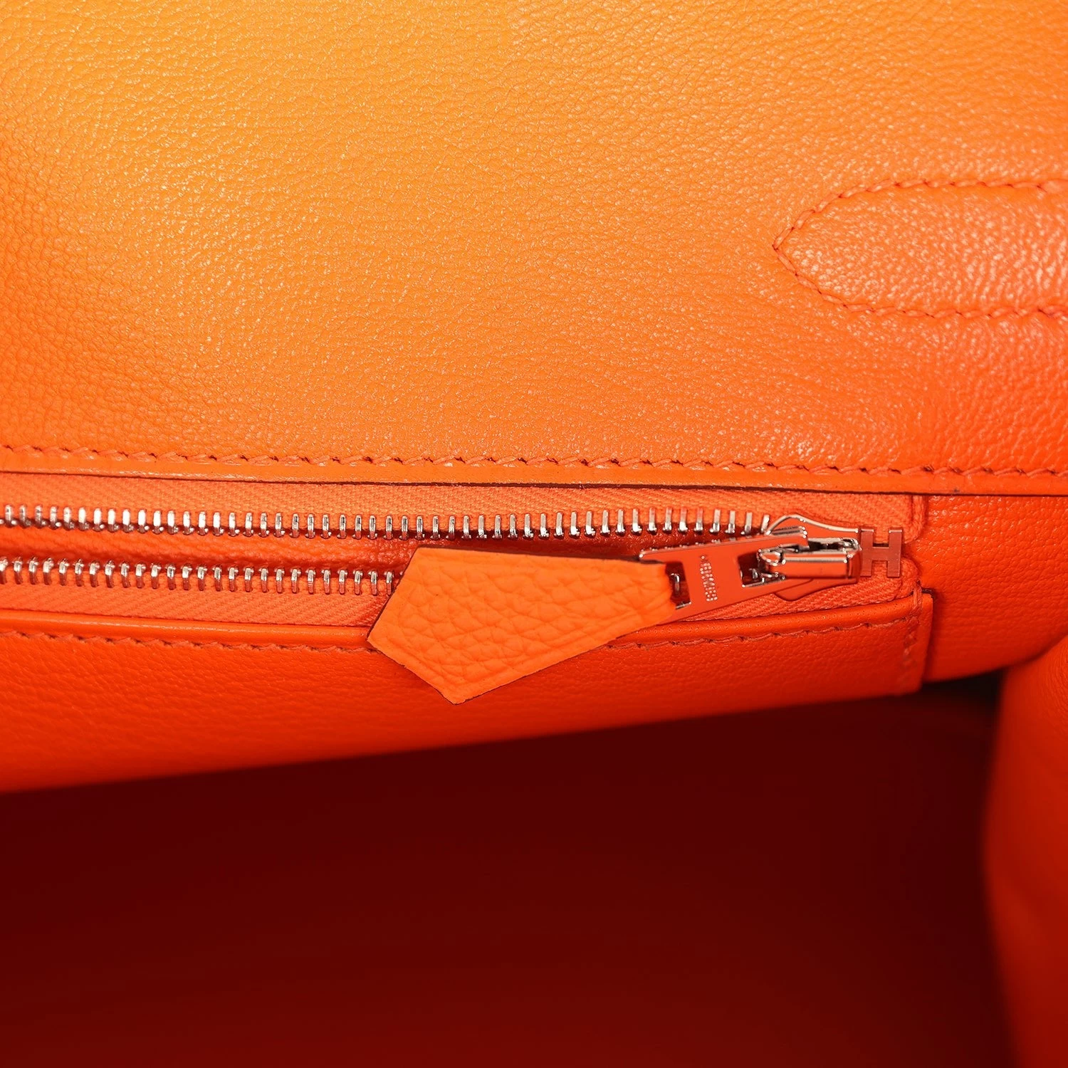 The interior is lined with Orange Minium chevre and has a zip pocket with an Hermes engraved zipper pull and an open pocket on the opposite side.