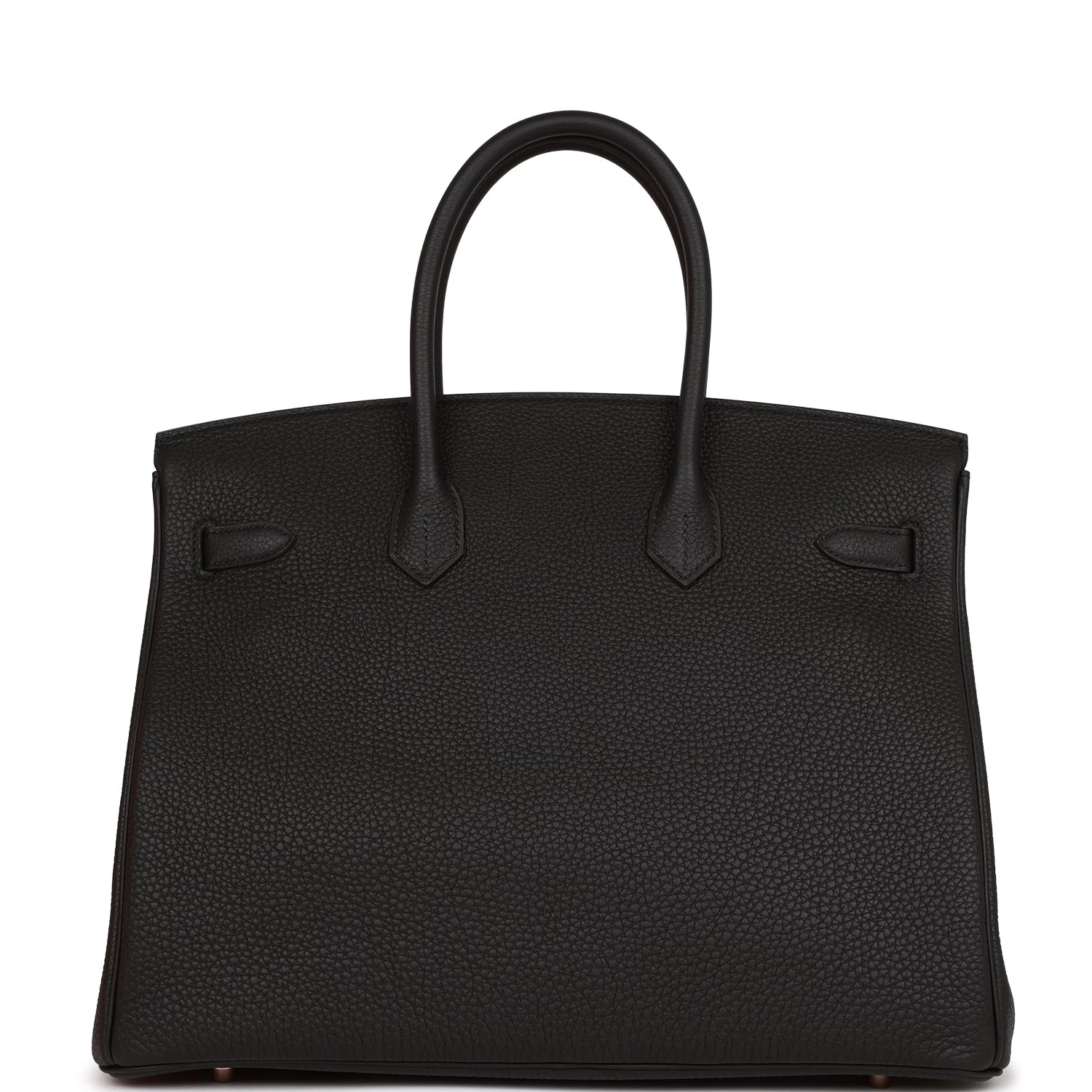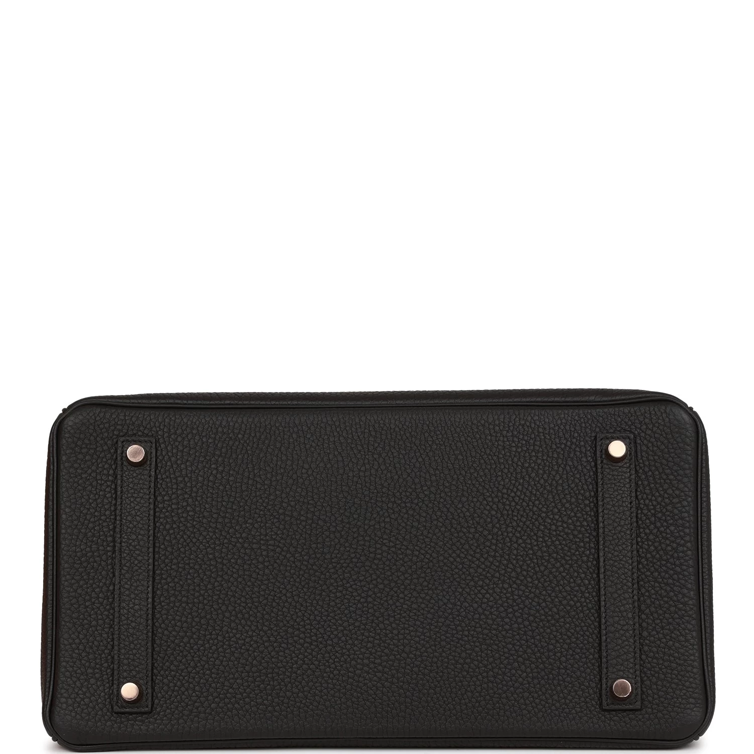 This Birkin is in Black togo leather with rose gold hardware and has tonal stitching, front flap, two straps with center toggle closure, clochette with lock and two keys, and double rolled handles.