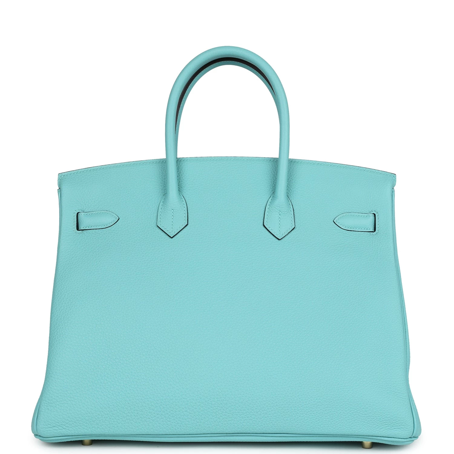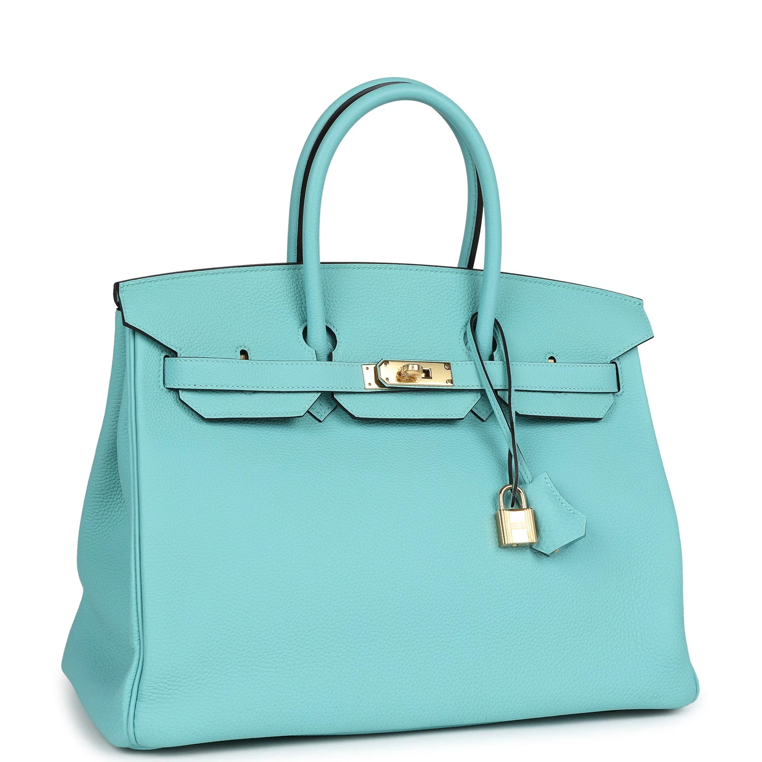 This Birkin is in Bleu Atoll togo leather with gold hardware and has tonal stitching, two straps with front toggle closure, clochette with lock and two keys and double rolled handles.