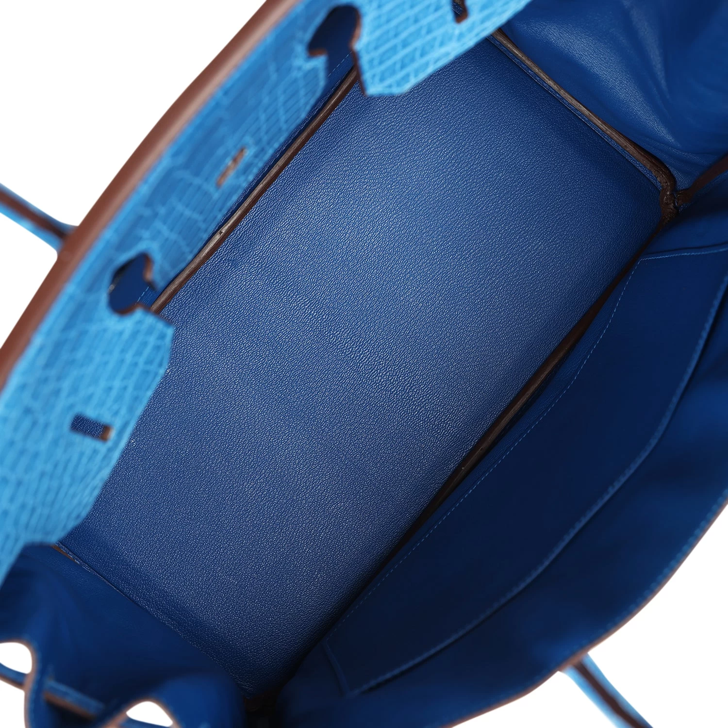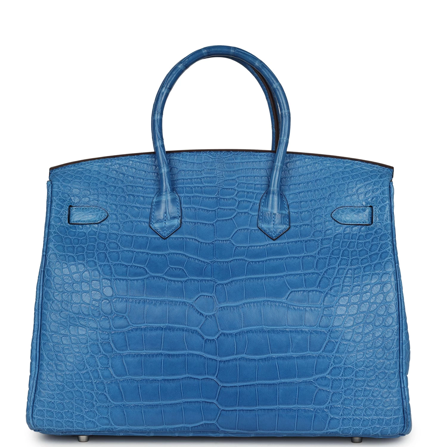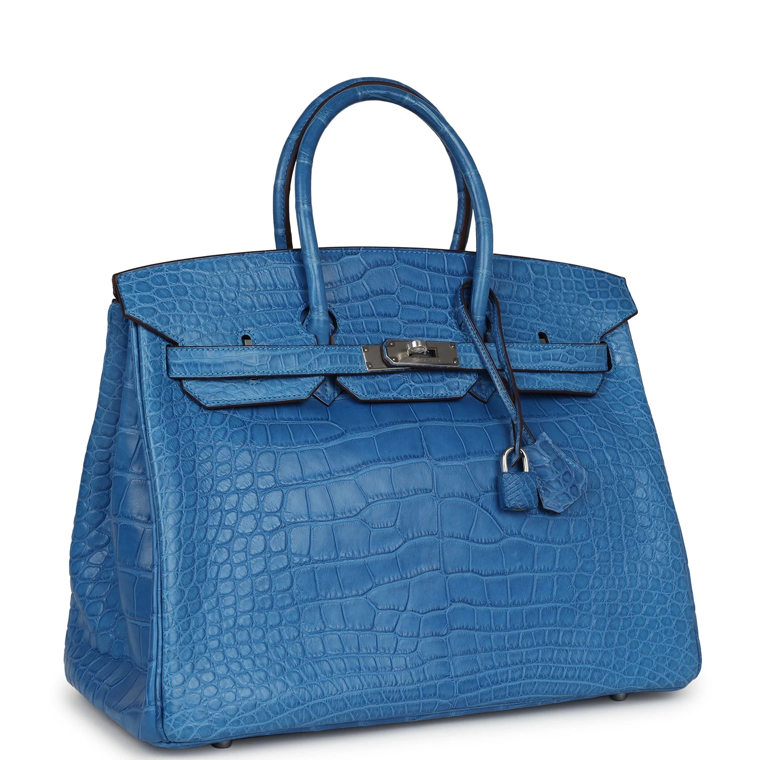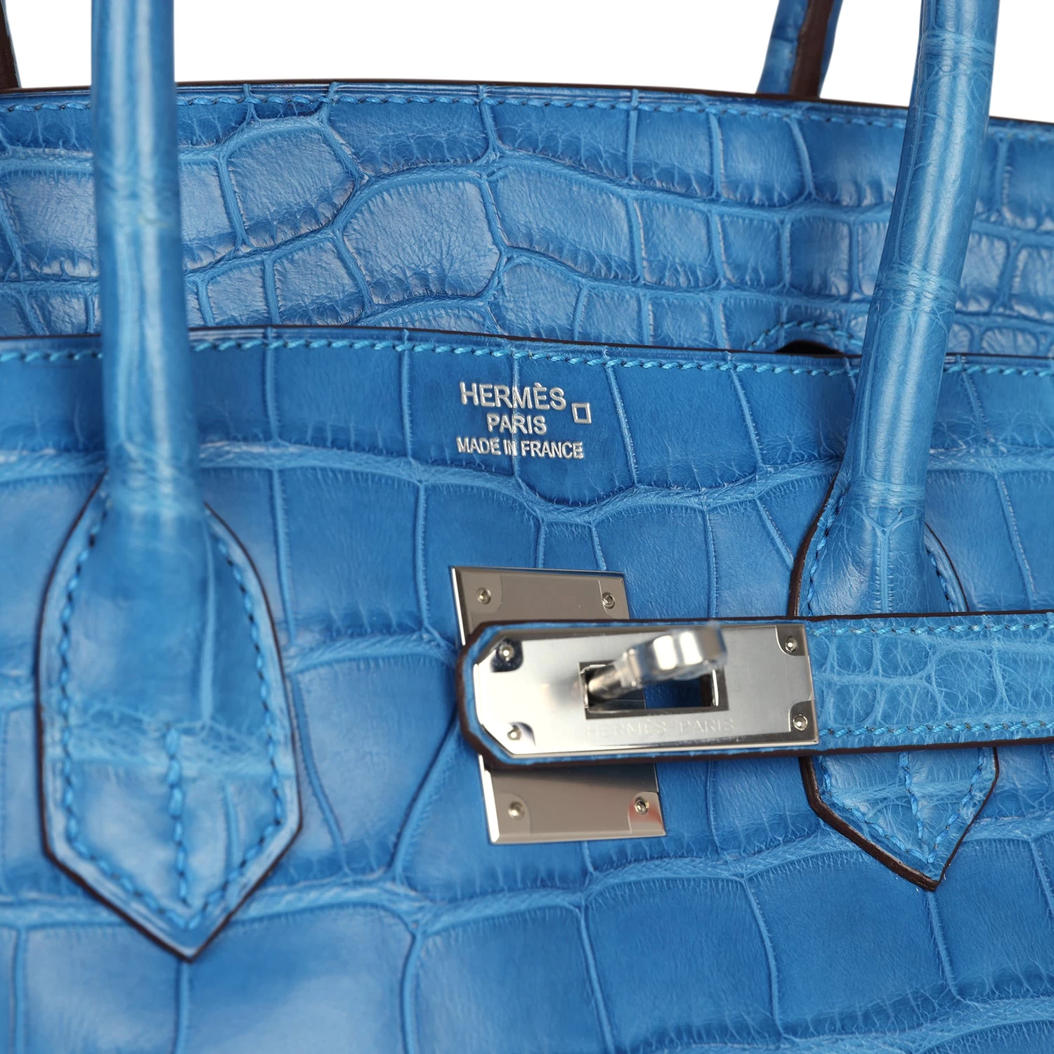 This Birkin is of Bleu Mykonos Matte Alligator Mississippiensis with palladium hardware and features tonal stitching, front flap, two straps with center toggle closure, clochette with lock and two keys, and double rolled handles.