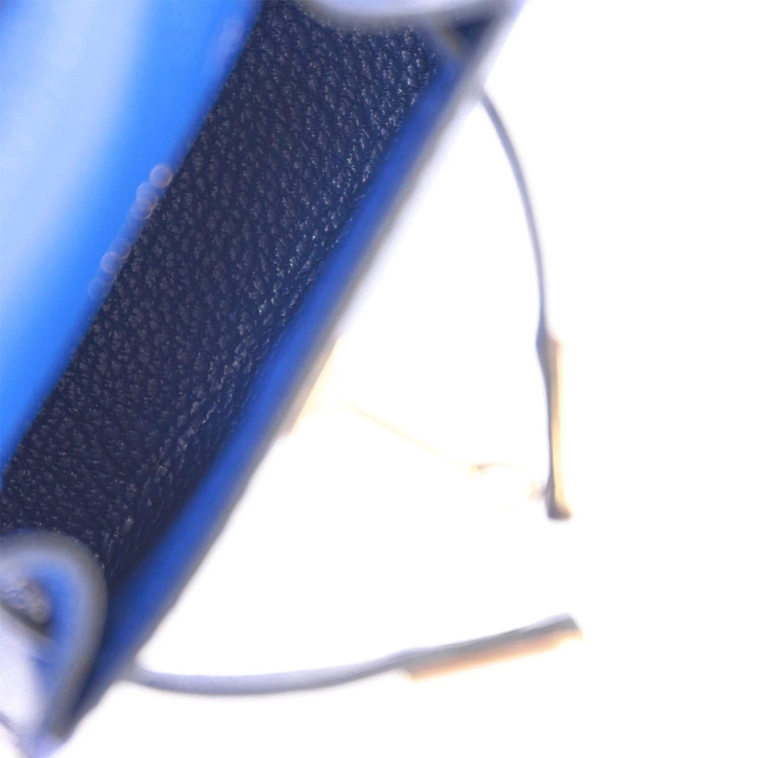 This Mini Kelly Twilly Bag Charm is of Bleu Electric tadelakt leather with gold hardware and has a front flap that opens, silk twilly wrapped handle and matching decorative strap.