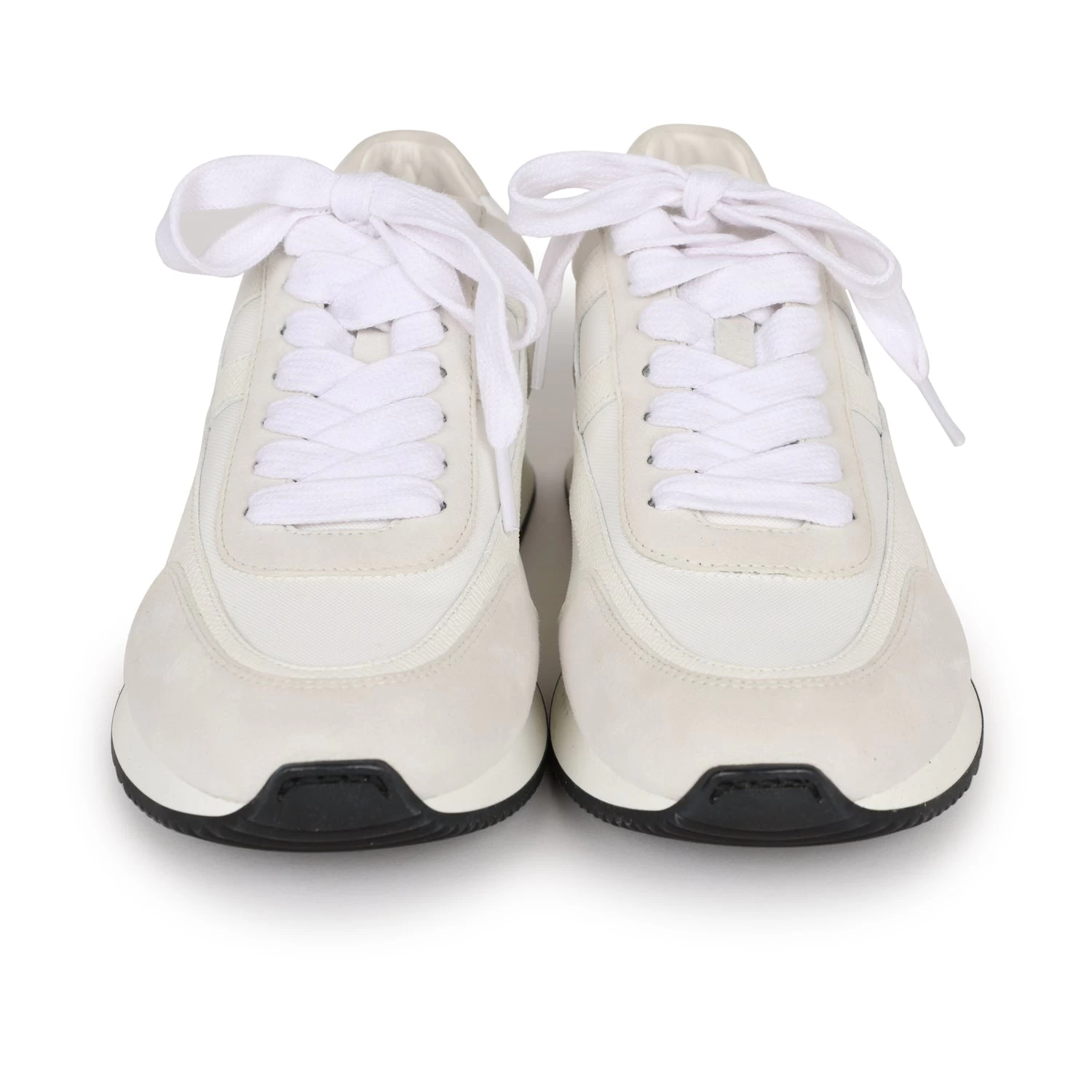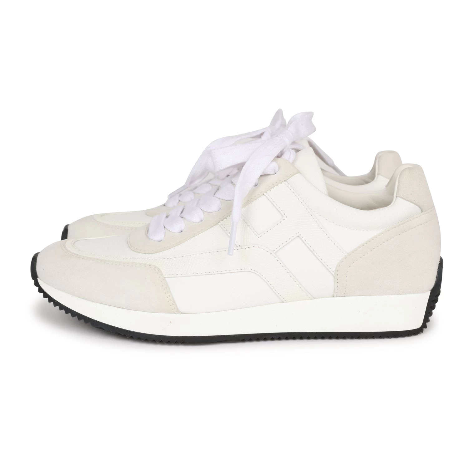 This pair of Hermes Boomerang Sneakers in White and Gris Perle, made from Epsom, Suede, and Canvas with a black rubber sole.