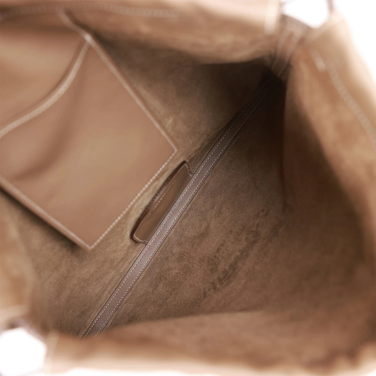 The interior is lined with Etoupe suede and has a pouch pocket.