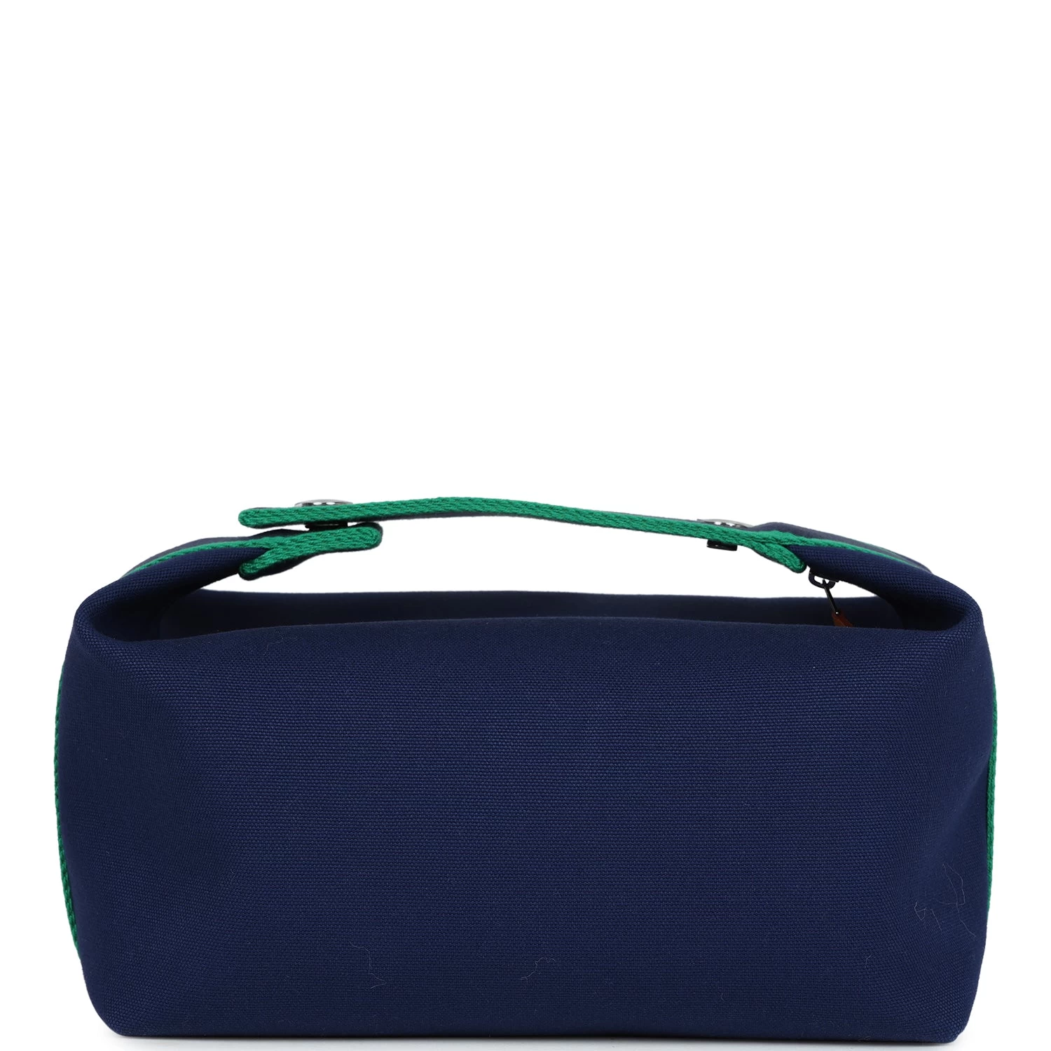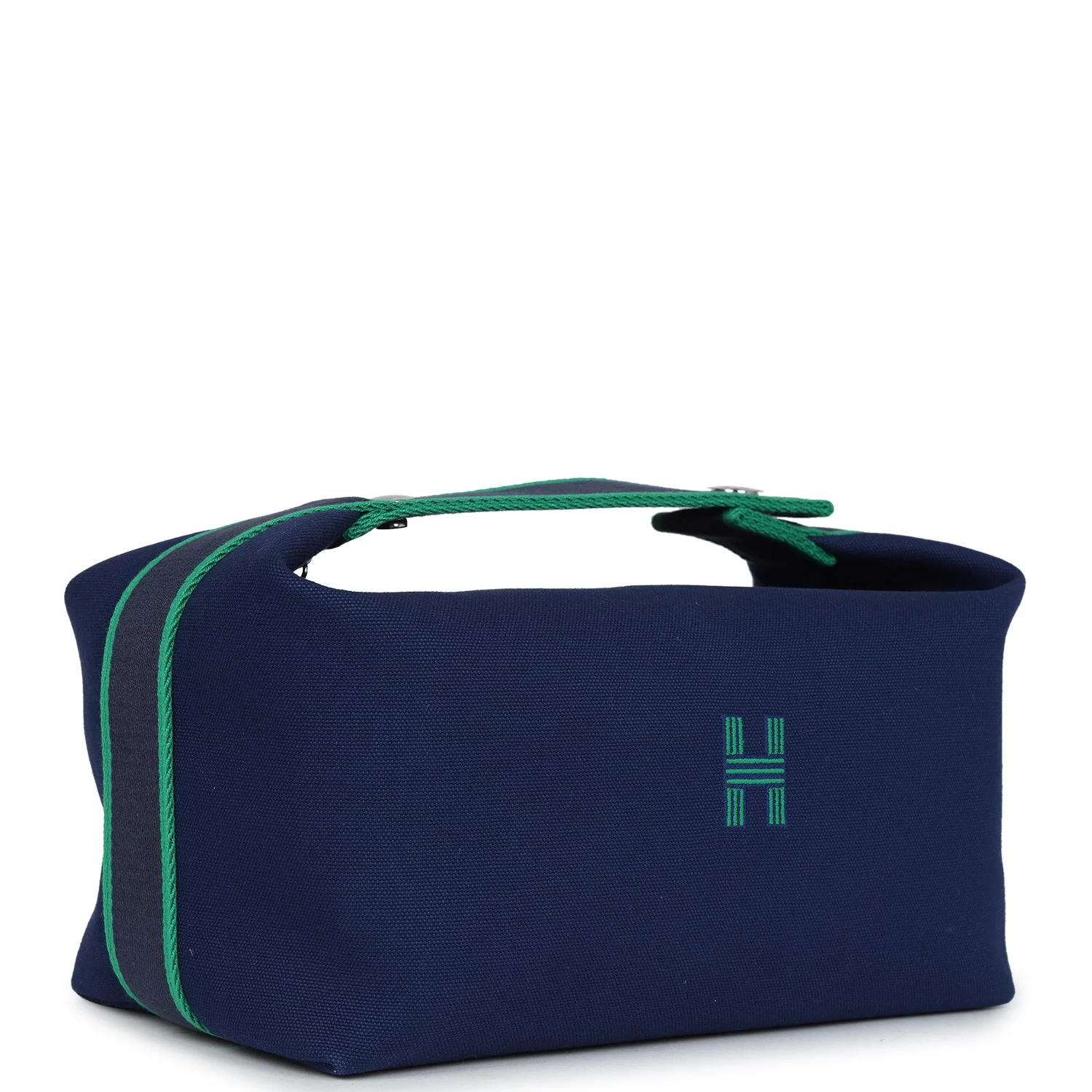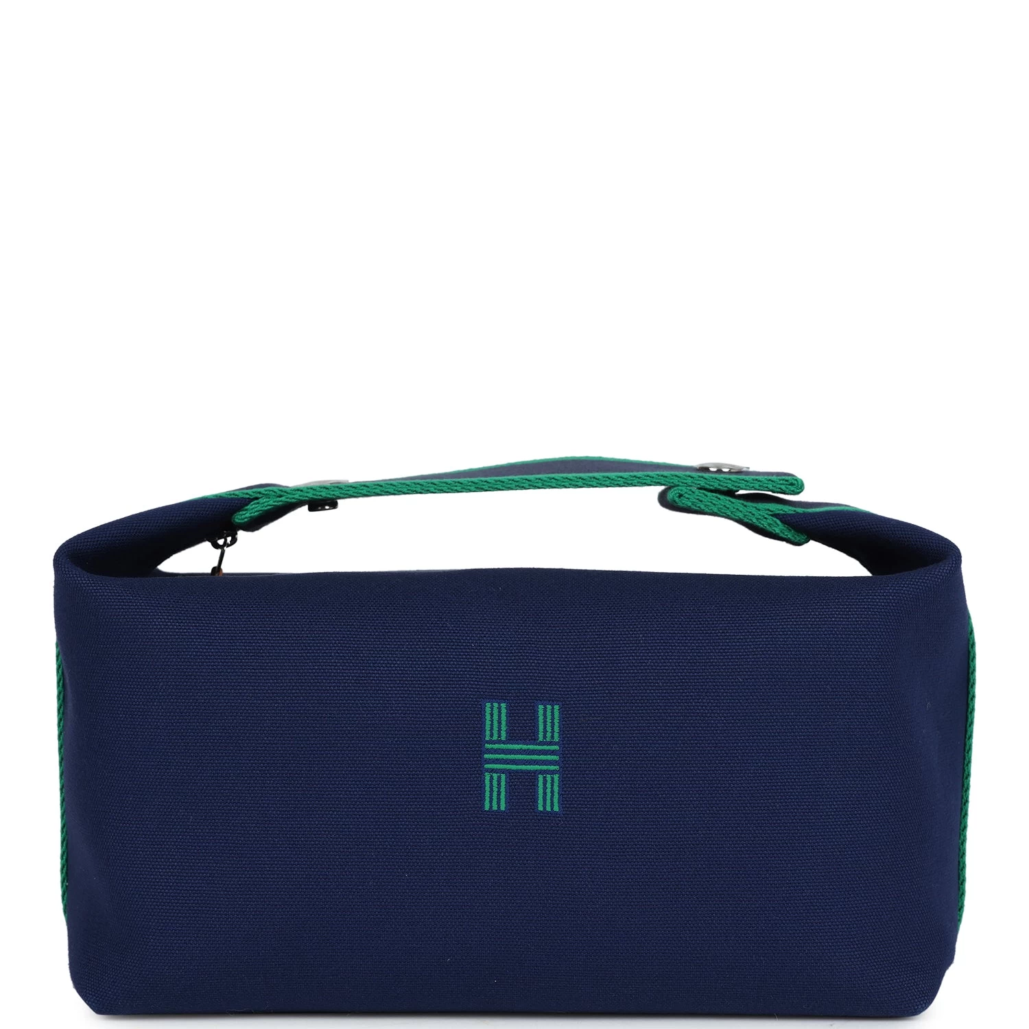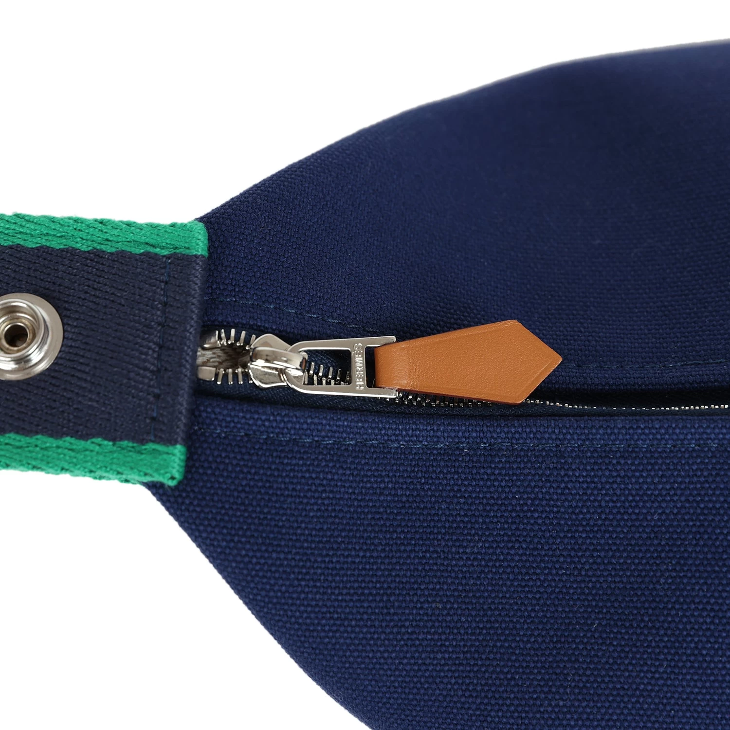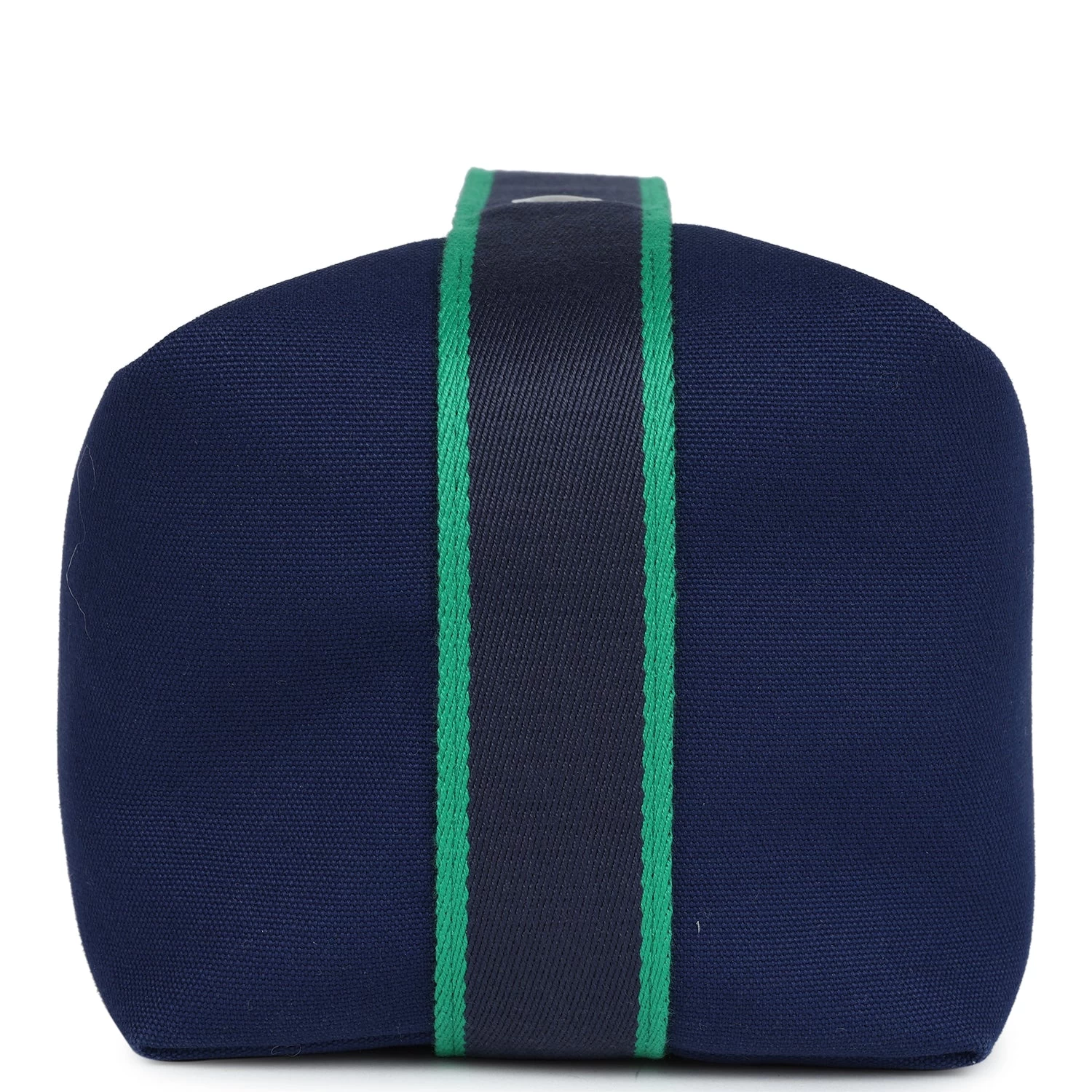 This Bride-A-Brac is in Marine canvas with a woven strap, palladium zipper with leather pull tab, and a black and navy H embroidered on the front.