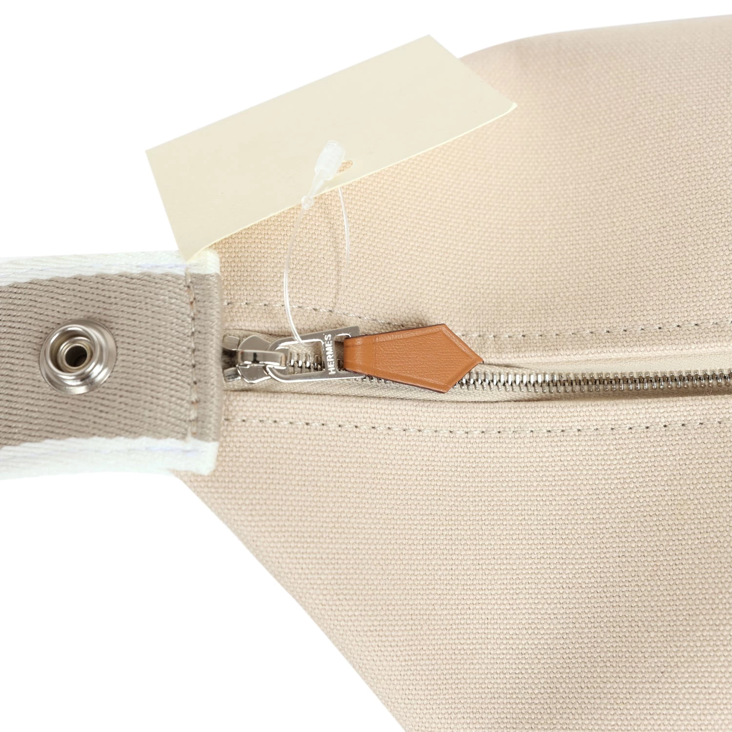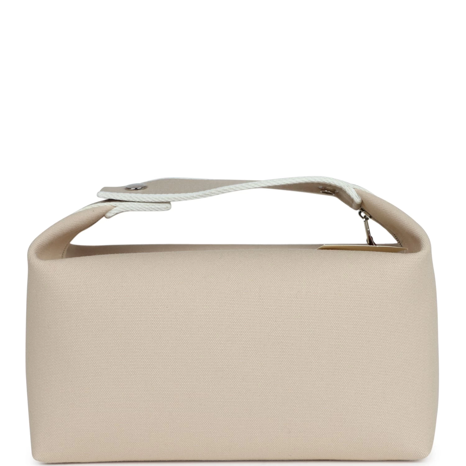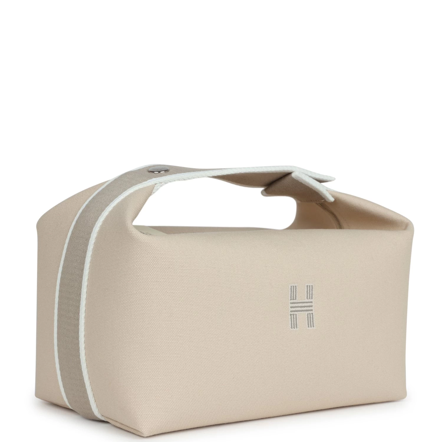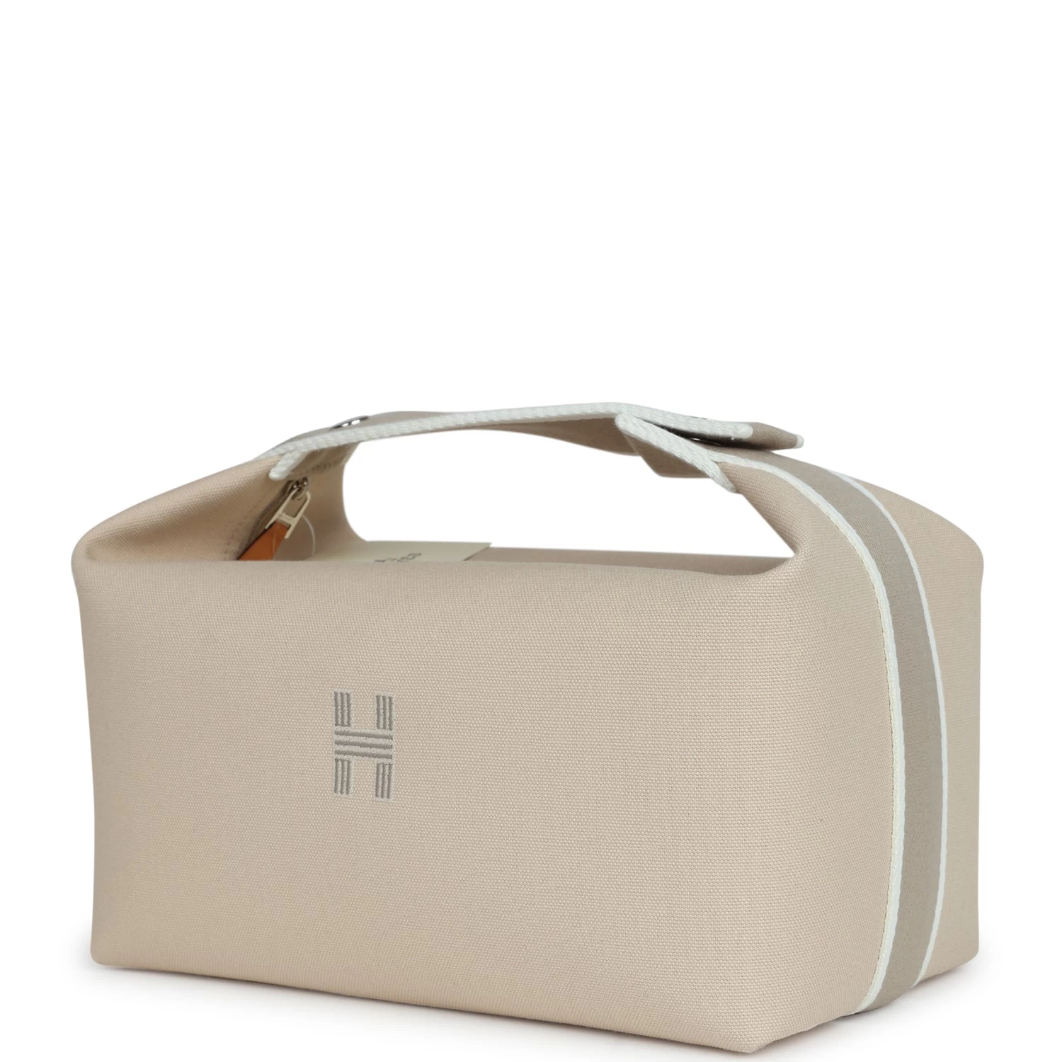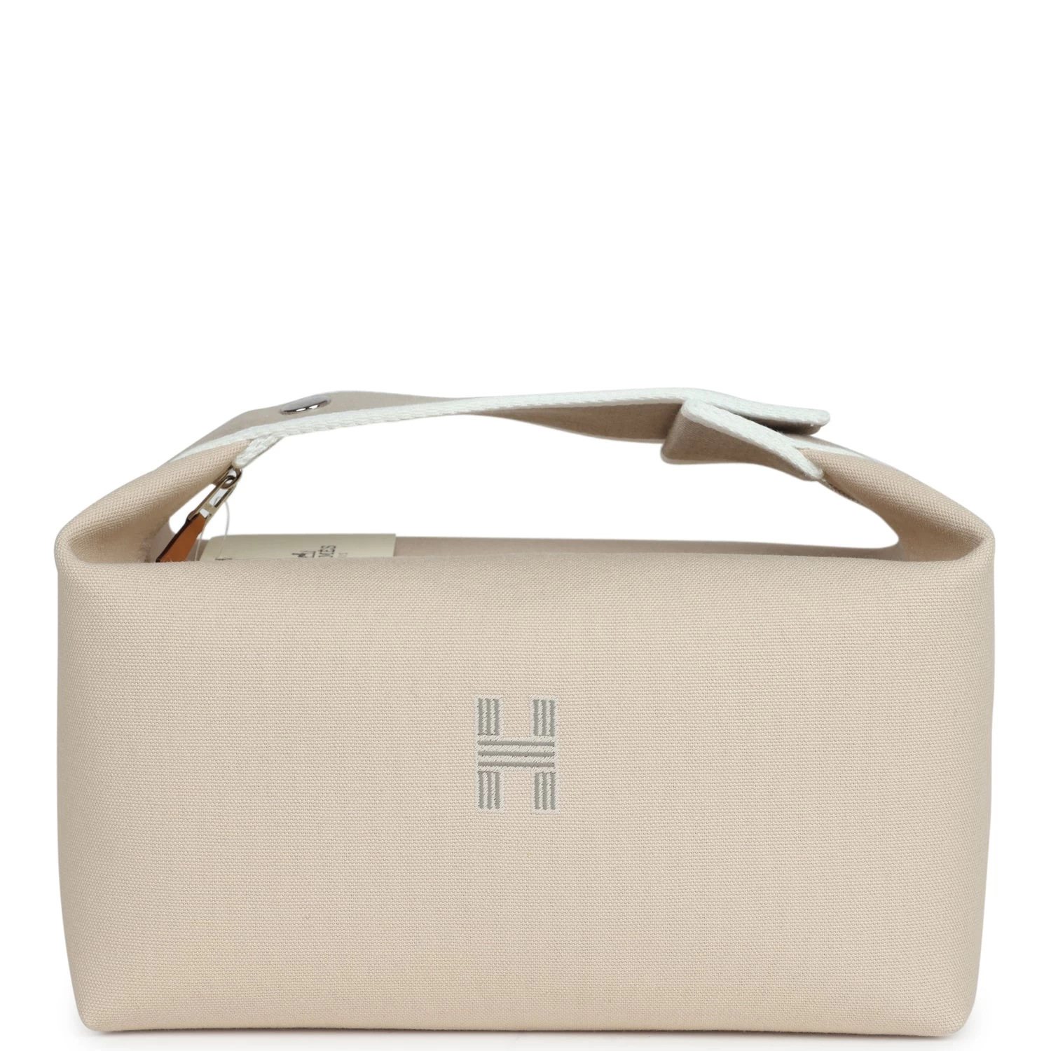This Bride A Brac case GM is in Neutral toile canvas with Palladium hardware, features large pouch, Anti-stain waterproof lining, embroidered “H” on the front, tonal stitching, zippered closure, snap closure top handle.