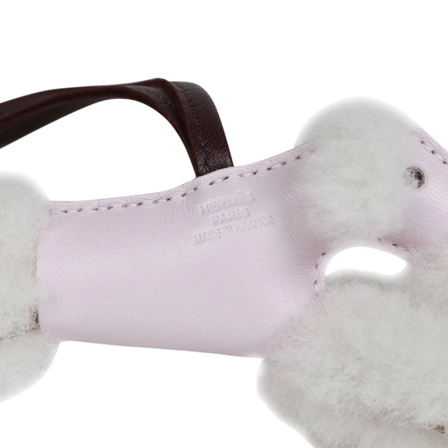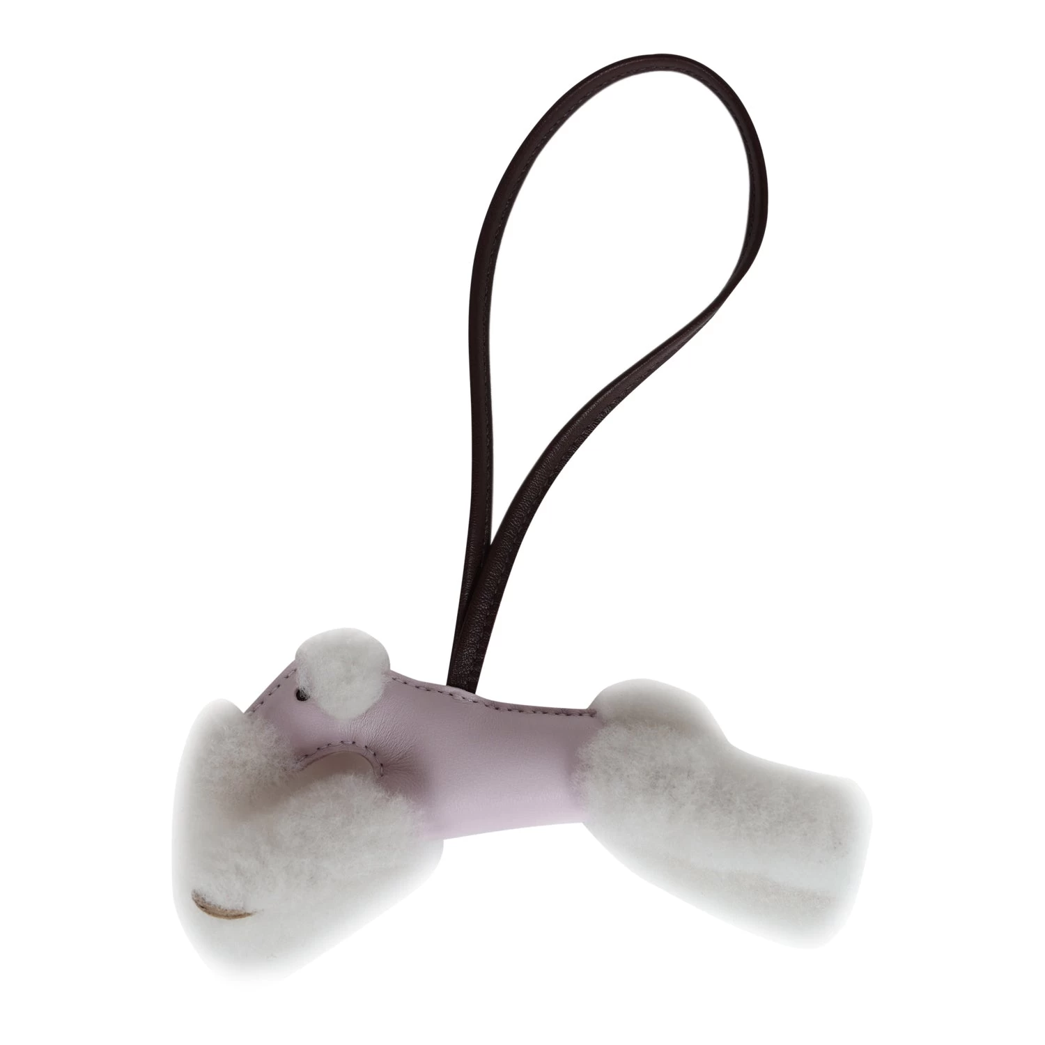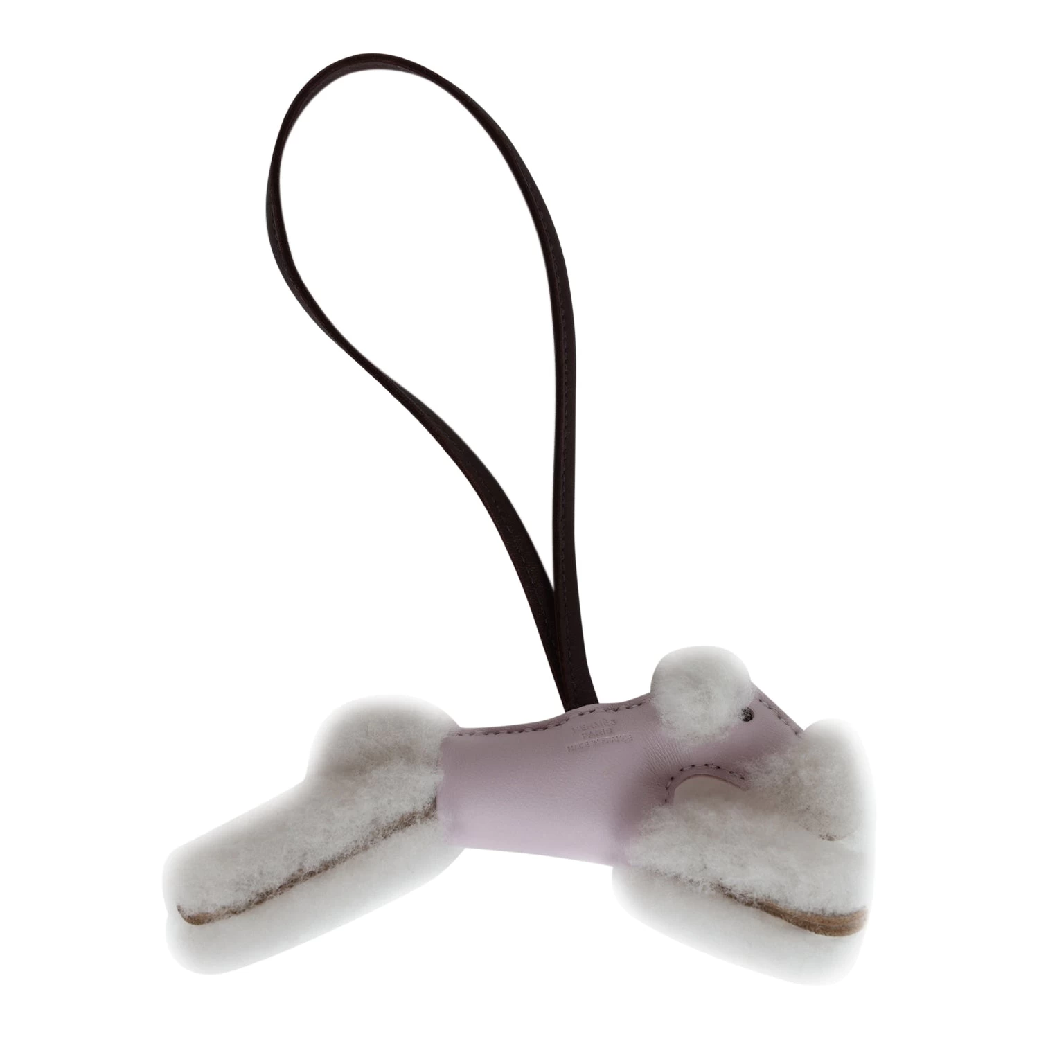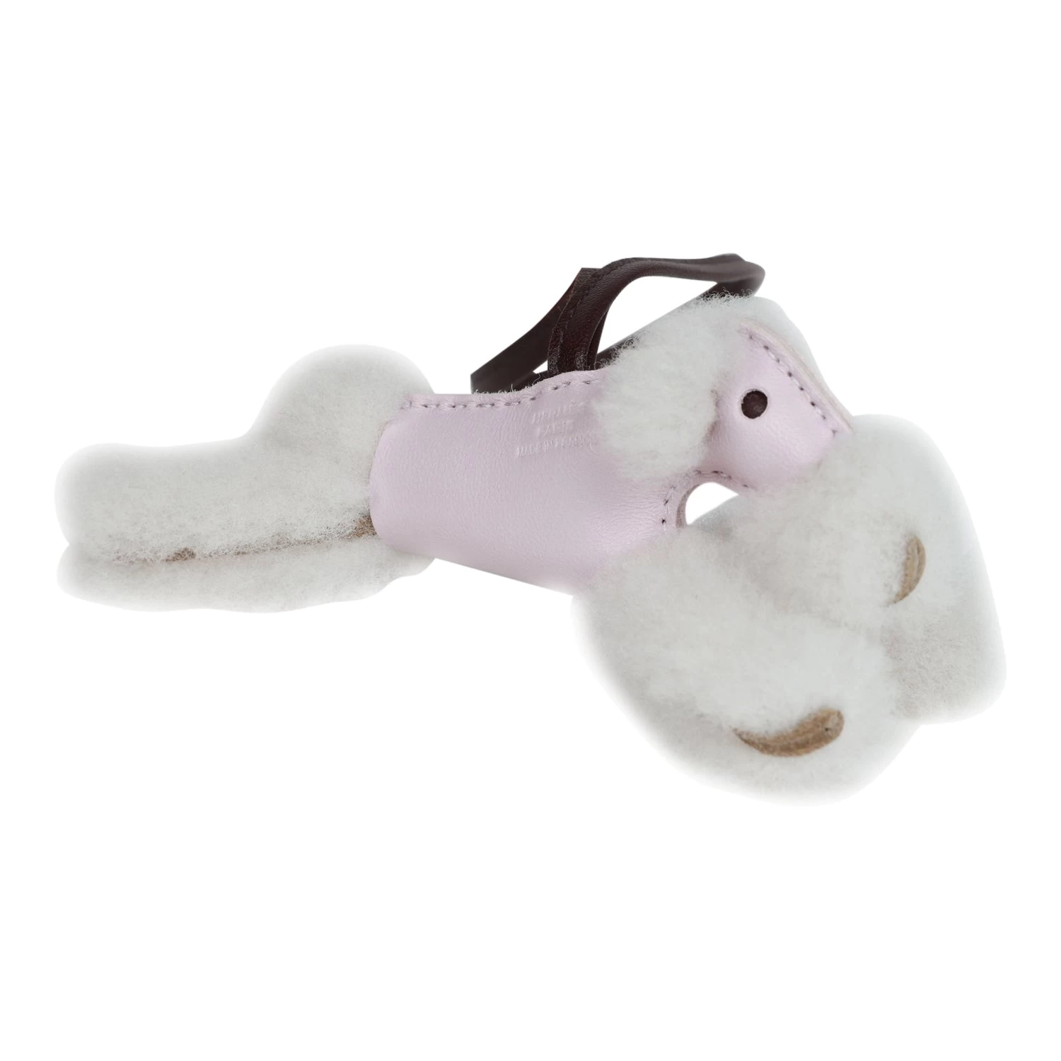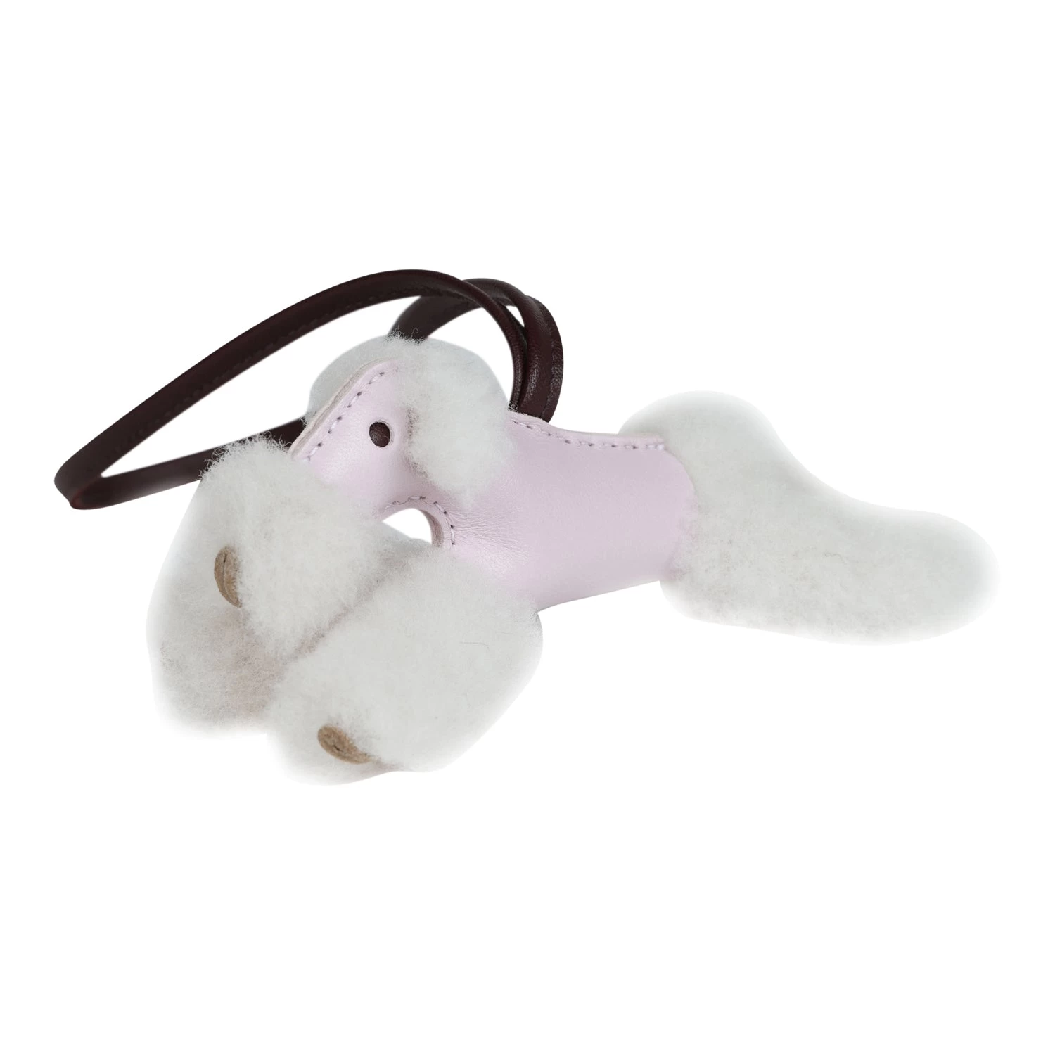 This Hermes Budy bag charm is in Mauve Pale and Rouge sellier Milo lambskin and merino wool