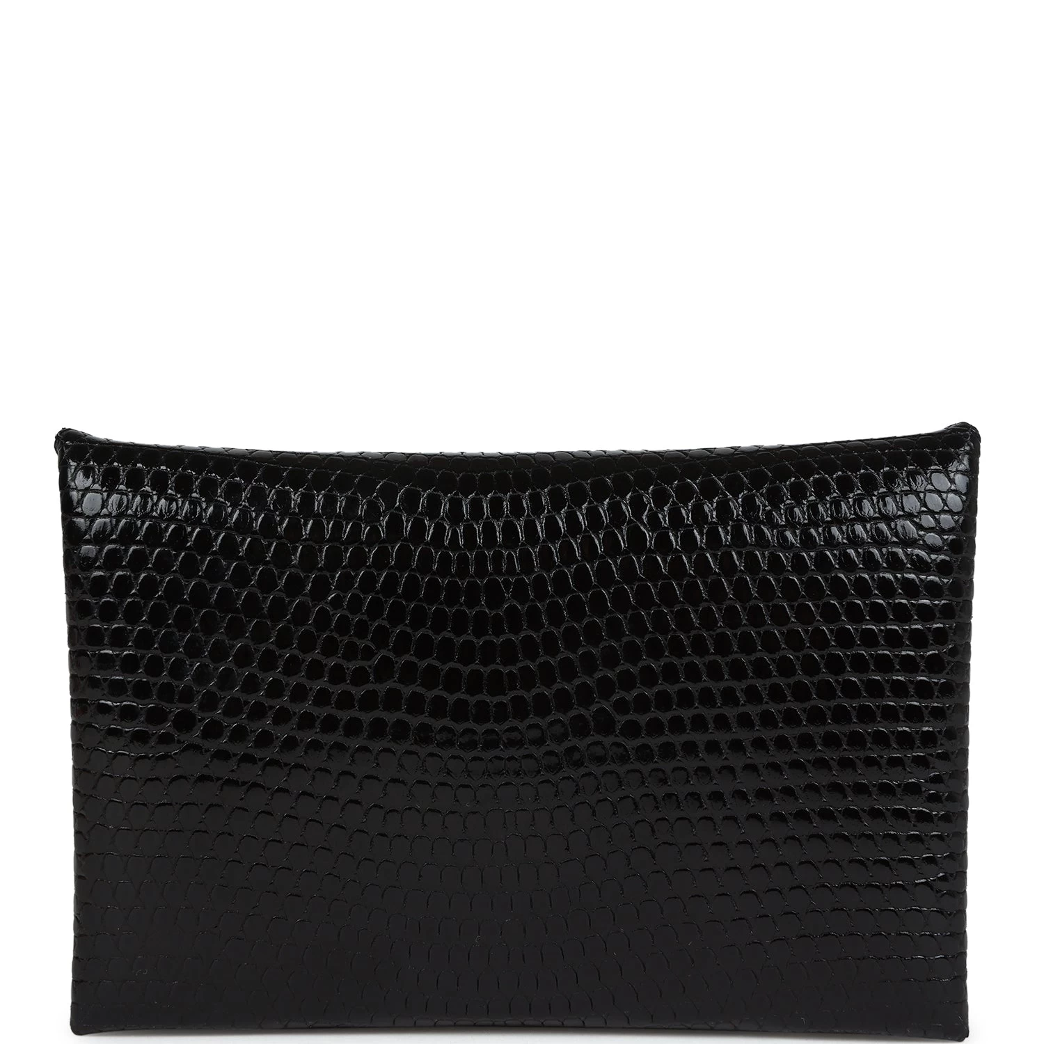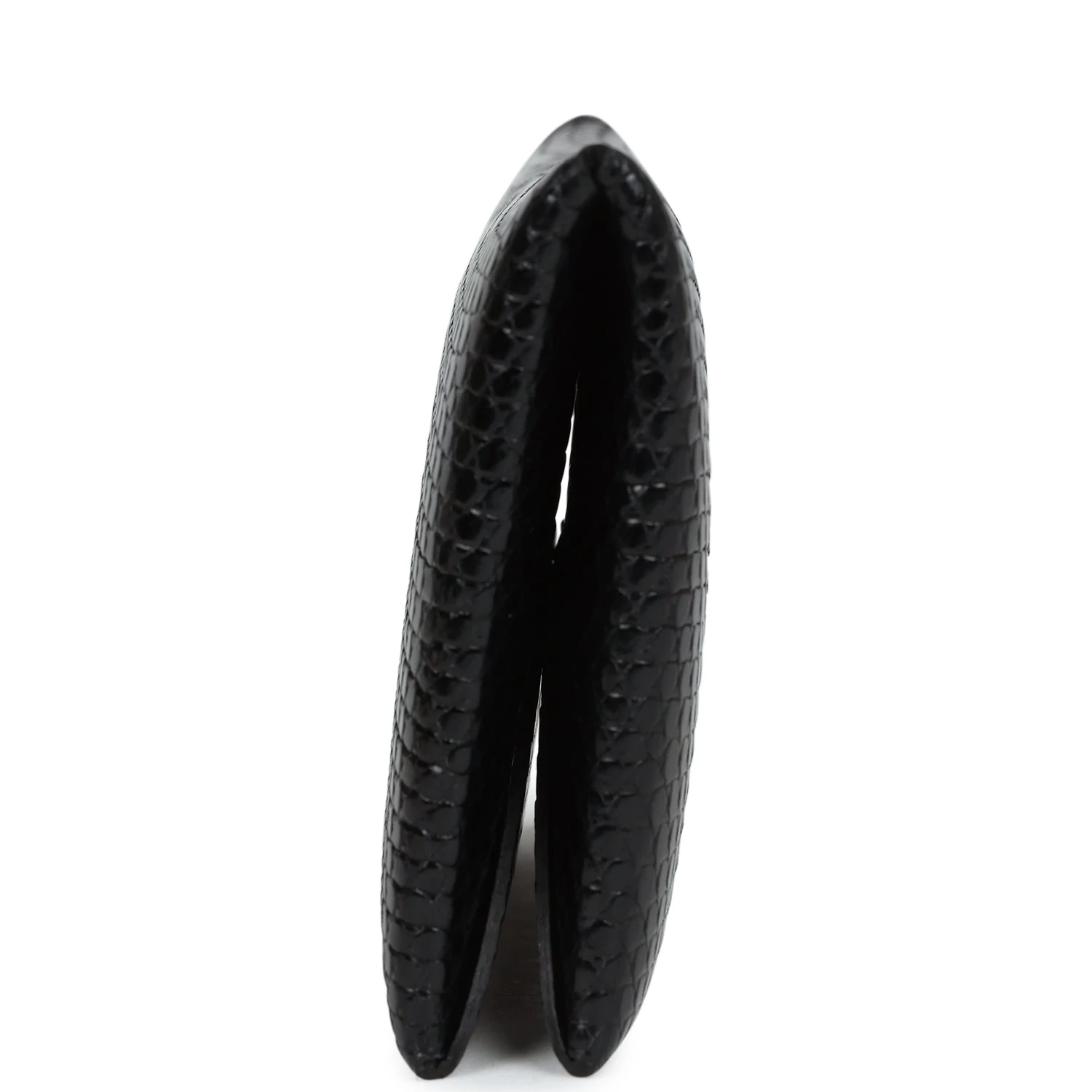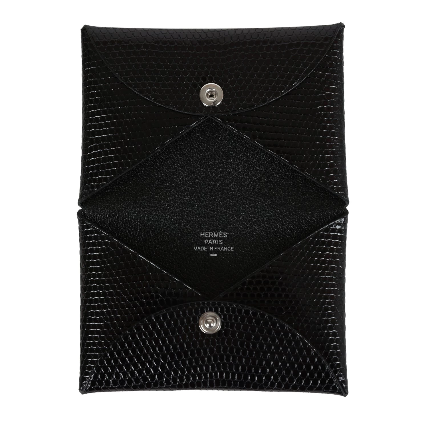 This Hermes Calvi cardholder is in Black Shiny Varanus Niloticus lizard leather with tonal stitching and palladium hardware.