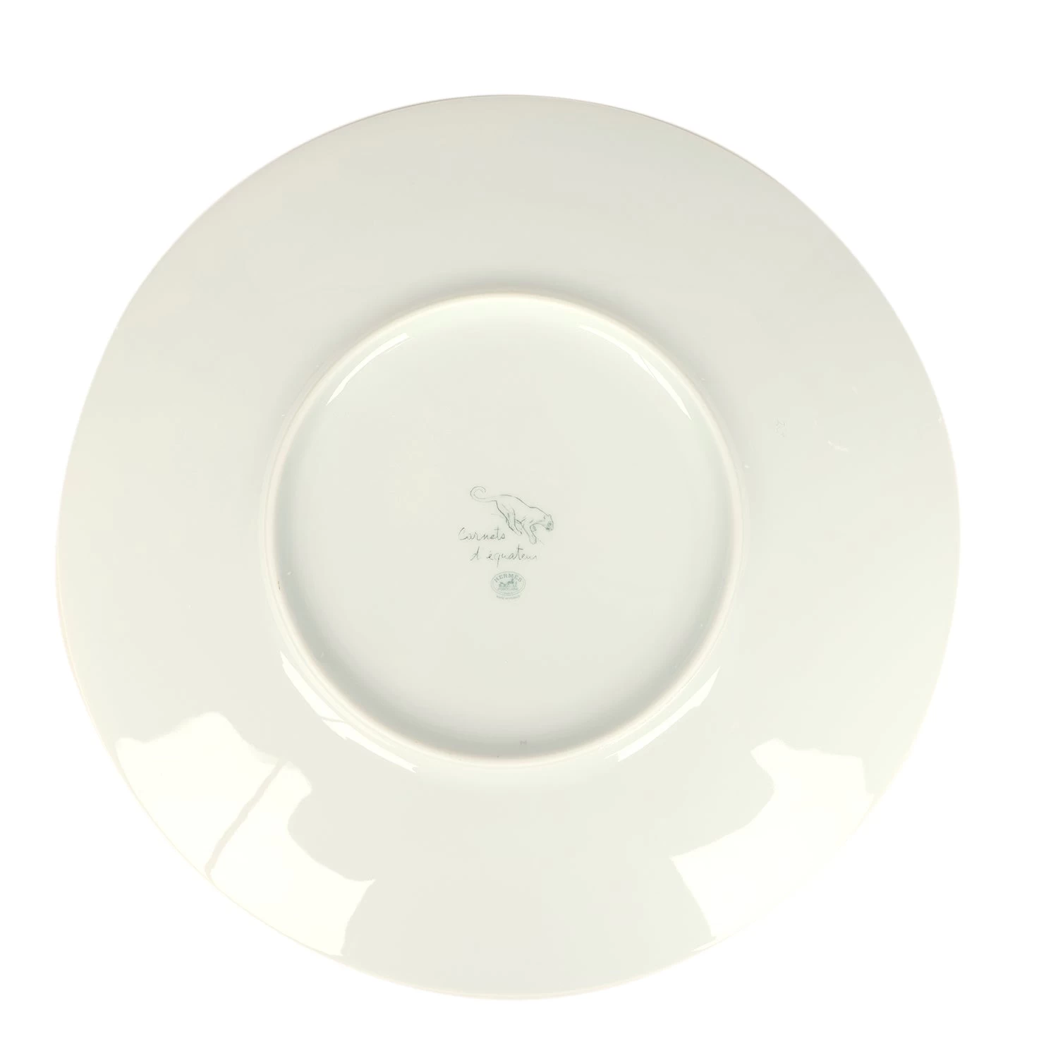 This Hermes Carnets D’ Equateur dinner plate is in green, white and orange porcelain, and is a single serving sized plate with 24 carat gold trim around edging of plate with a screen-printed jaguar design at the center of the plate.