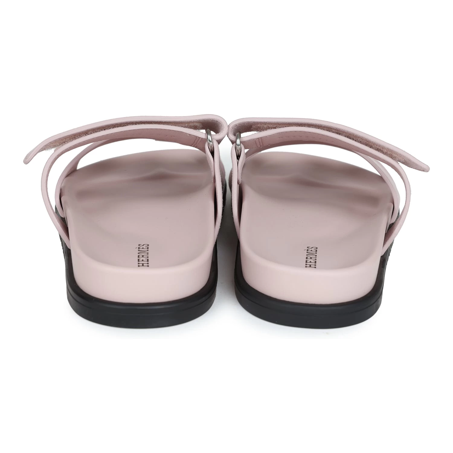 This pair of Chypre sandals are in Rose Porcelaine suede with a black rubber sole and feature the iconic H and a velcro crossover strap.