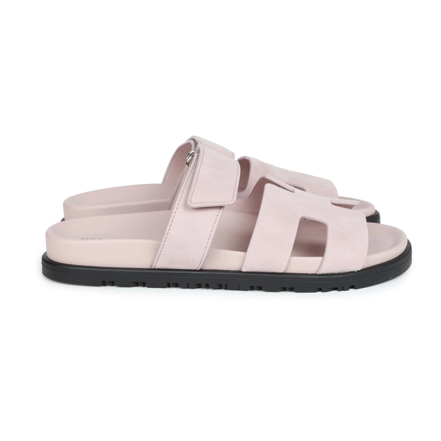 This pair of Chypre sandals are in Rose Porcelaine suede with a black rubber sole and feature the iconic H and a velcro crossover strap.