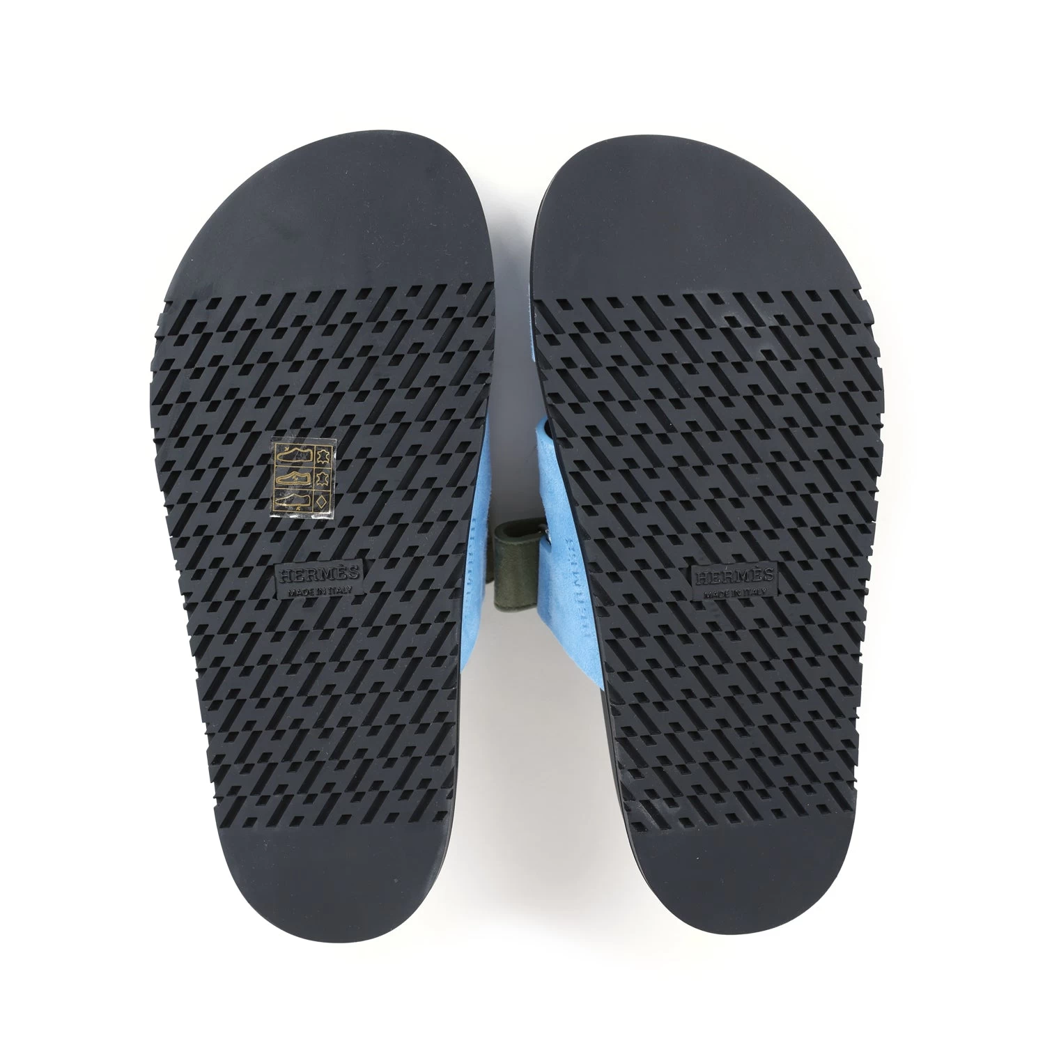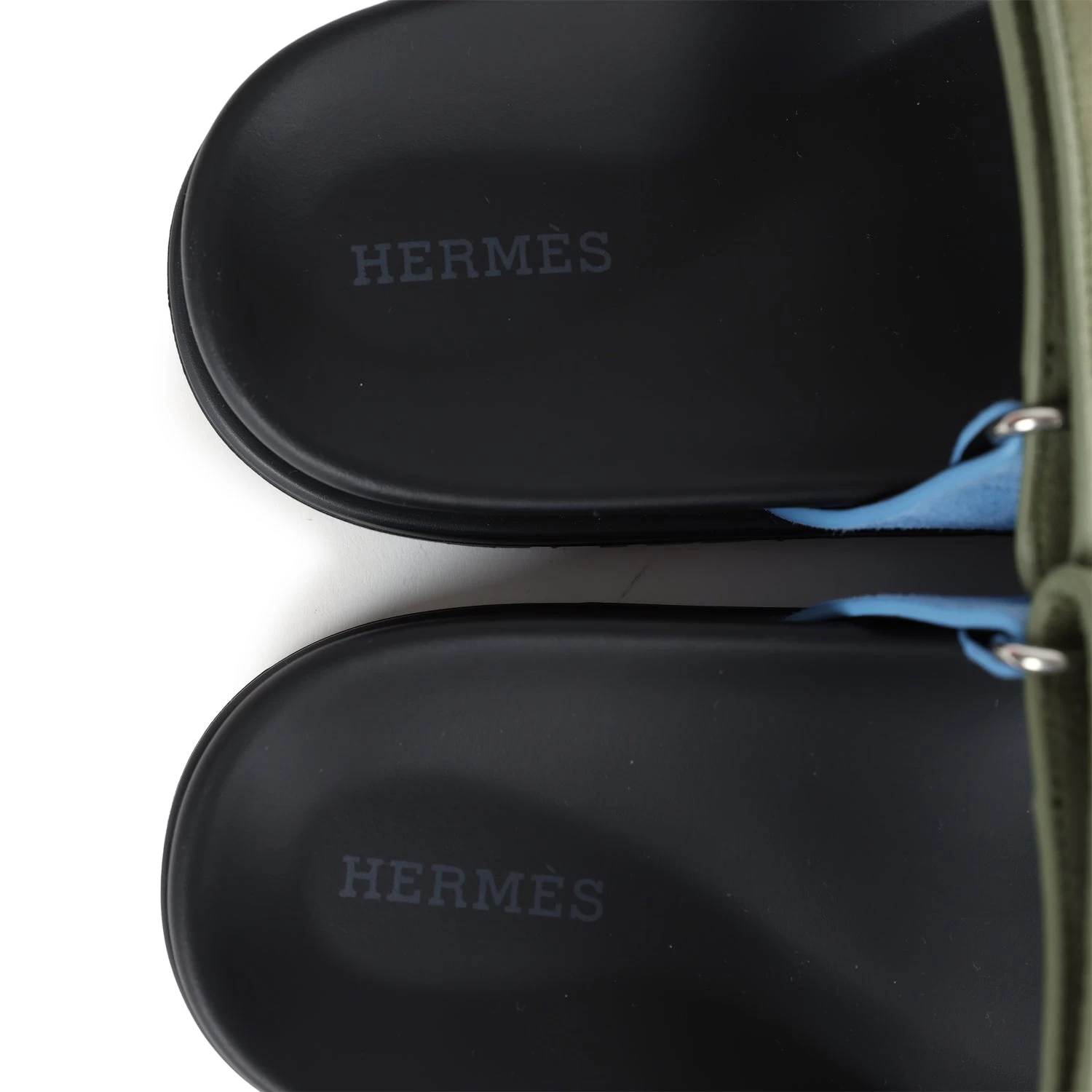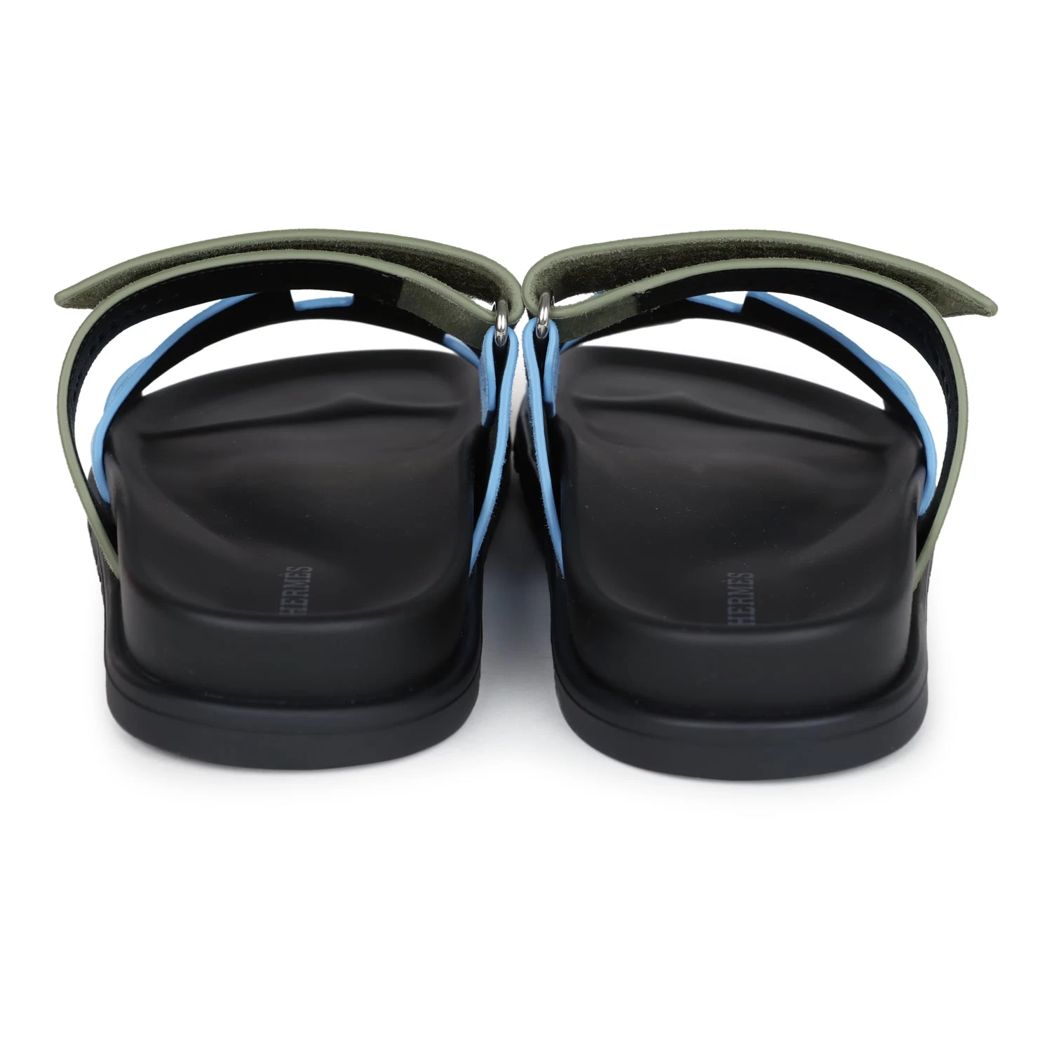 This pair of Hermes Chypre Techno sandals are in Bleu Cameo and Vert suede leather with black rubber soles, adjustable straps, and Palladium hardware in a size EU 37.5.