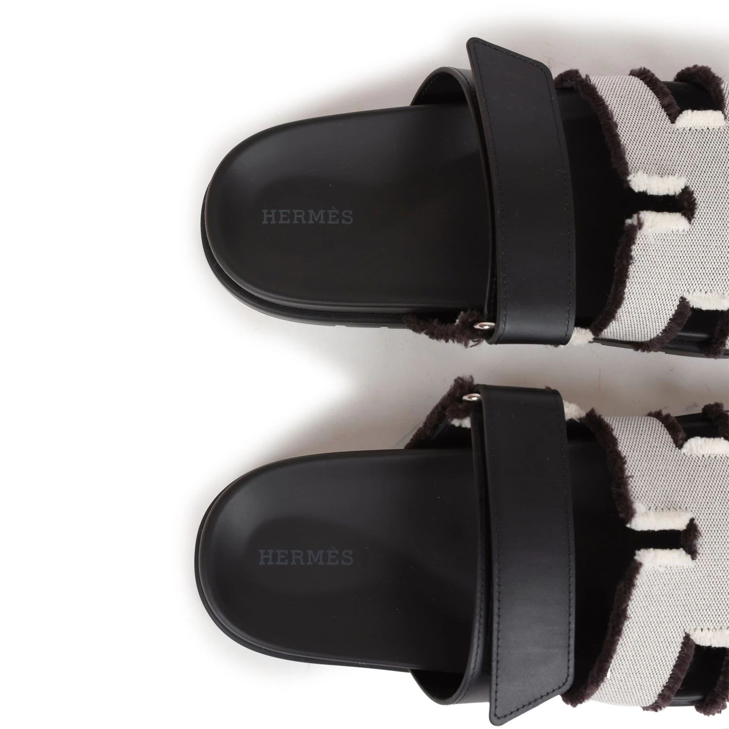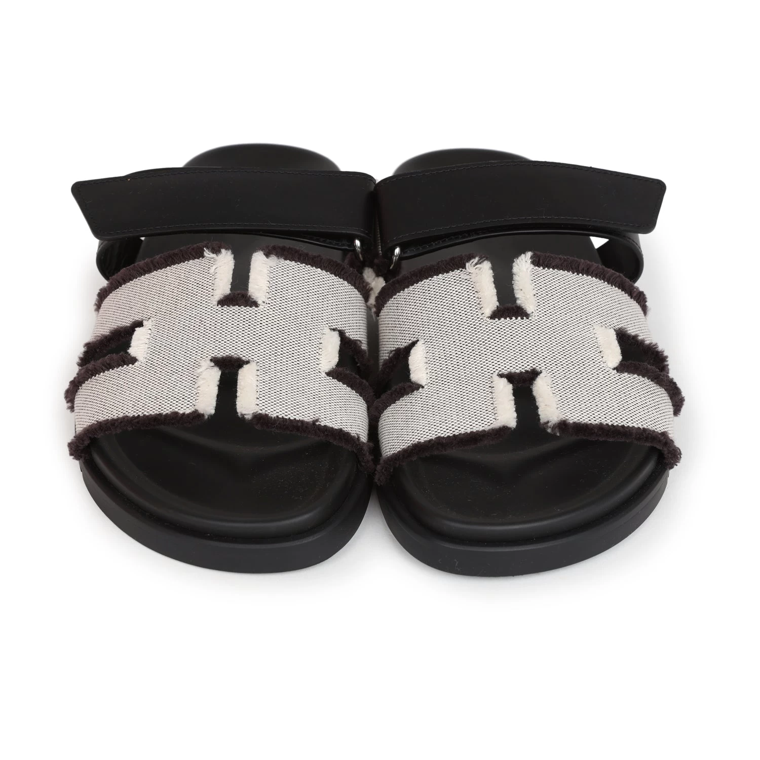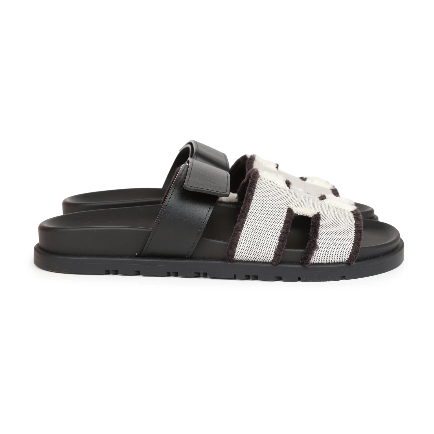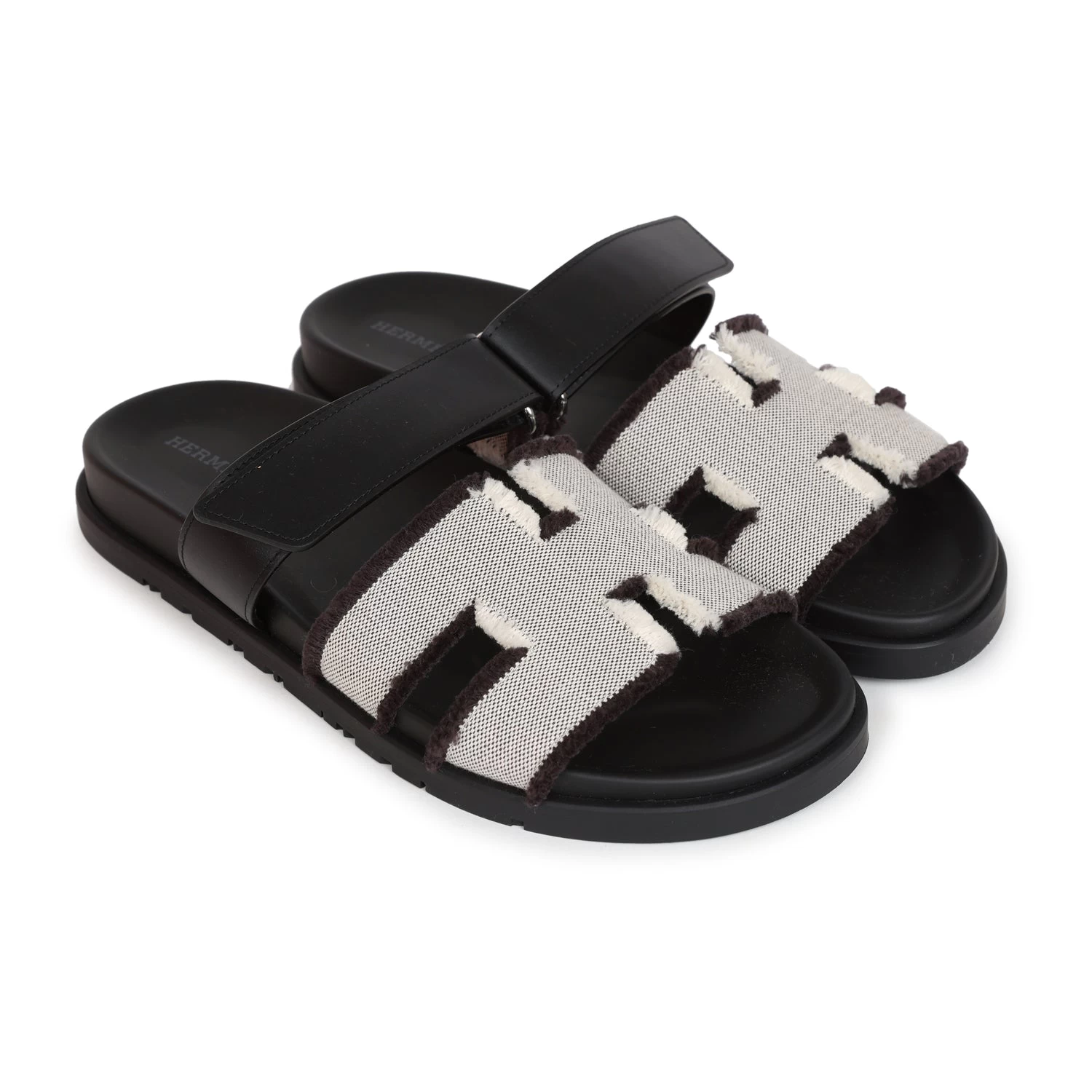 This pair of Chypre sandals are in black and prunoir calfskin and canvas and feature the iconic H and a velcro crossover strap.