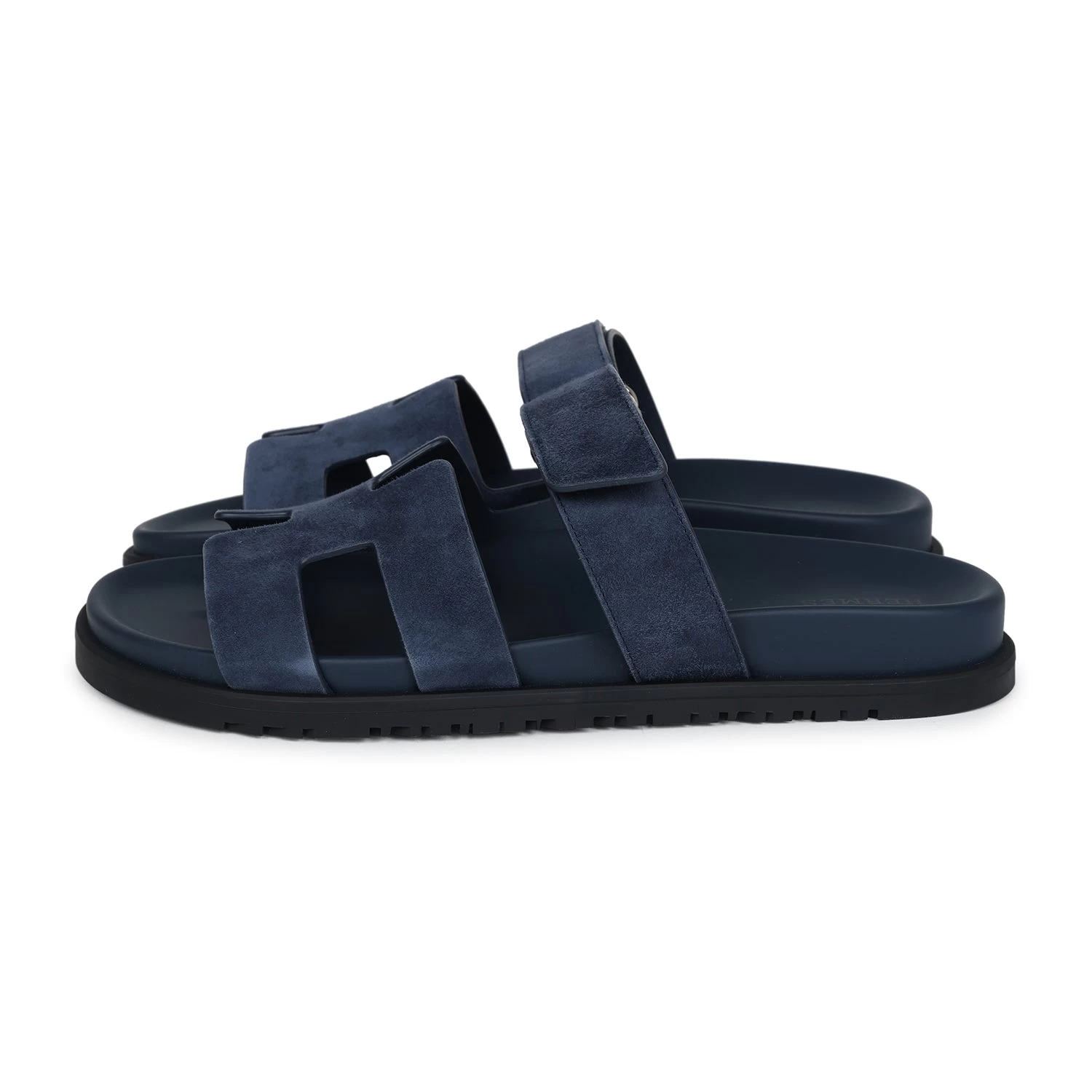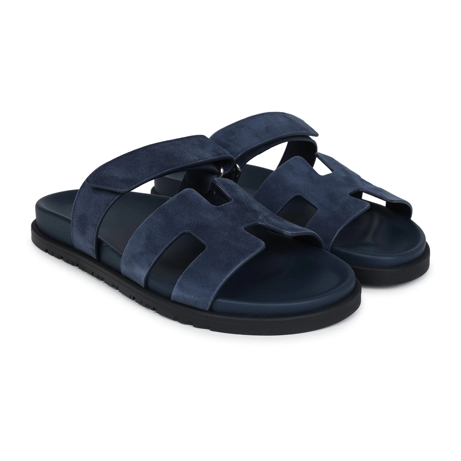 This pair of Hermes Chypre Techno sandals are in Bleu Celeste suede leather with Black rubber soles, adjustable straps, and Palladium hardware in a size 40.5 EU.