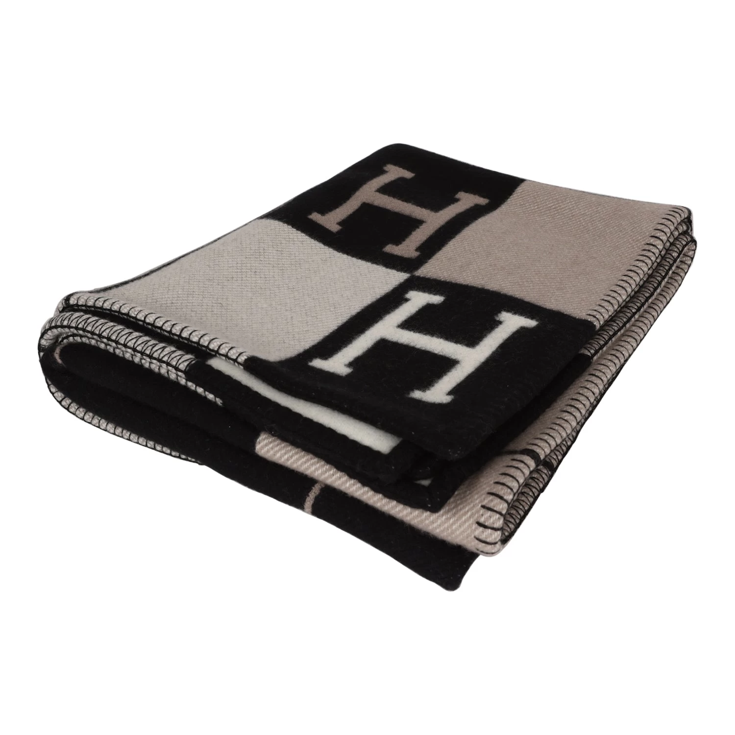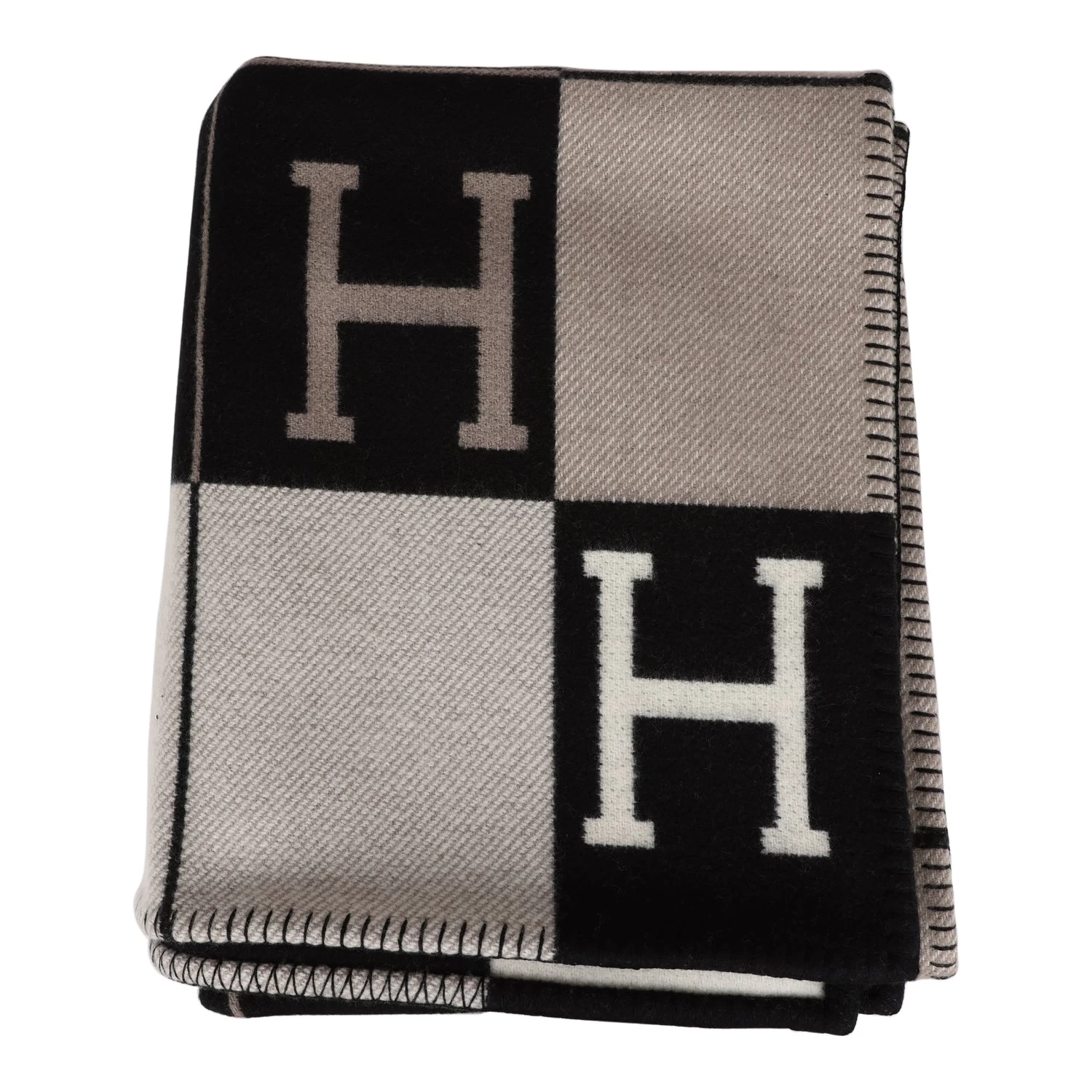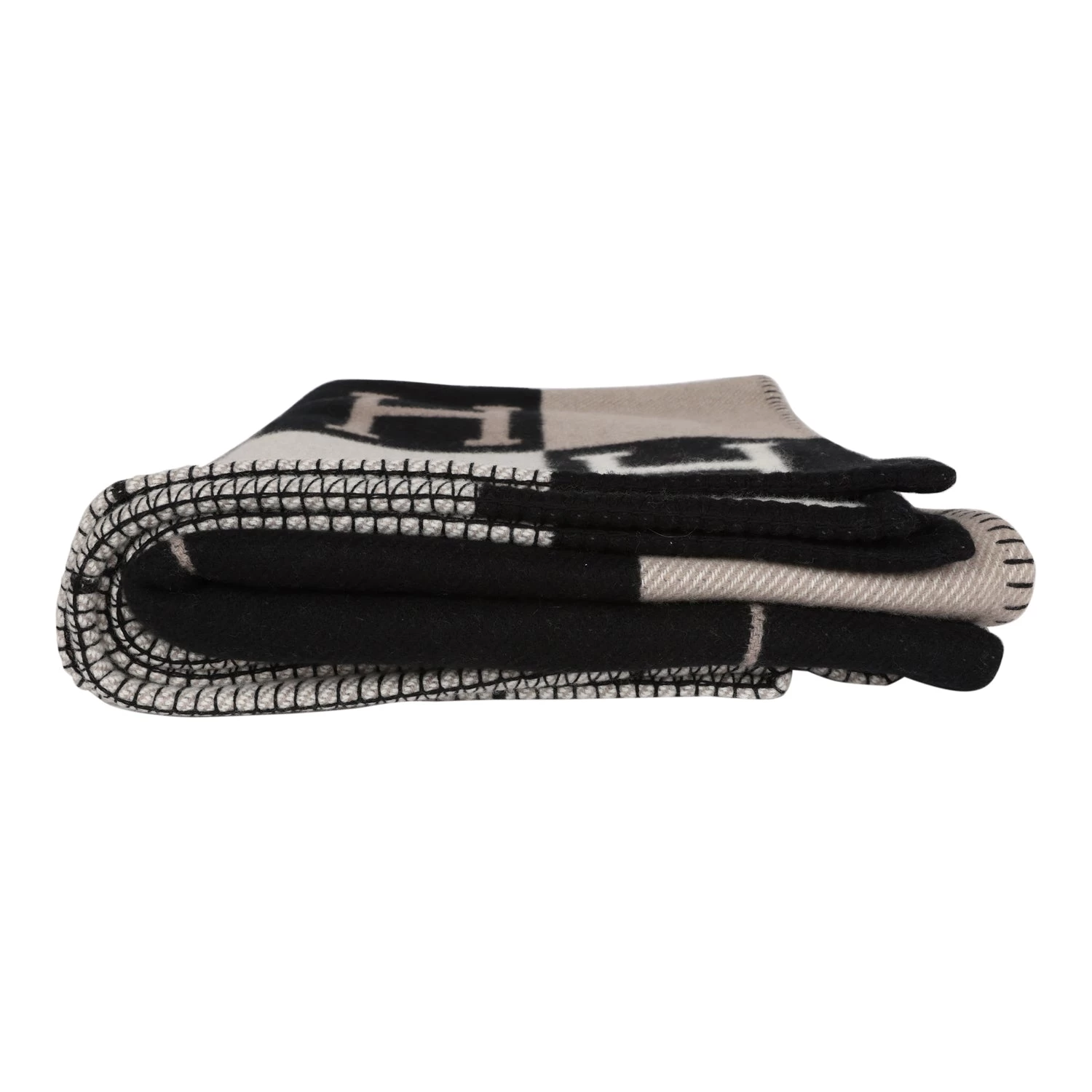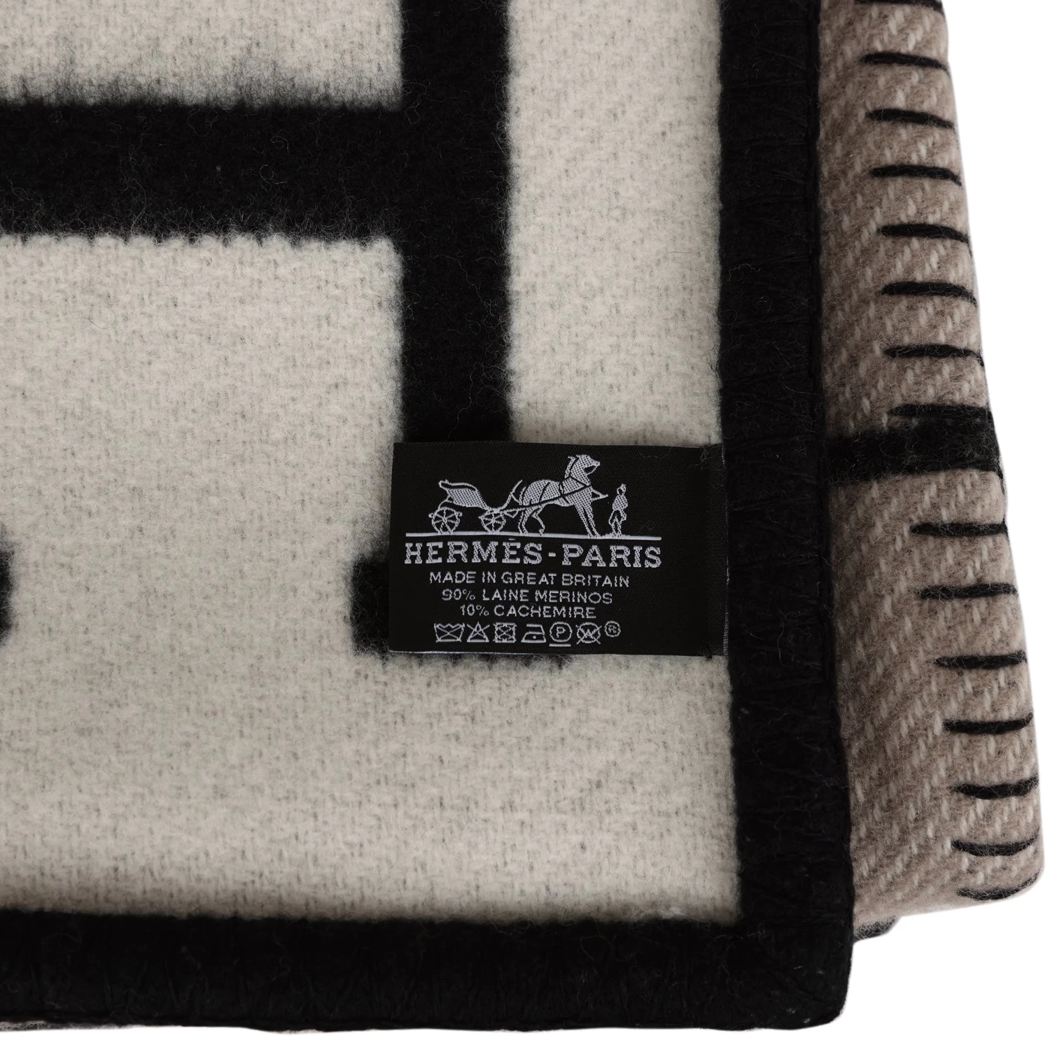 Hermes Classic Avalon Signature H blanket in Ecru and Black made of 90% merino wool and 10% cashmere.
