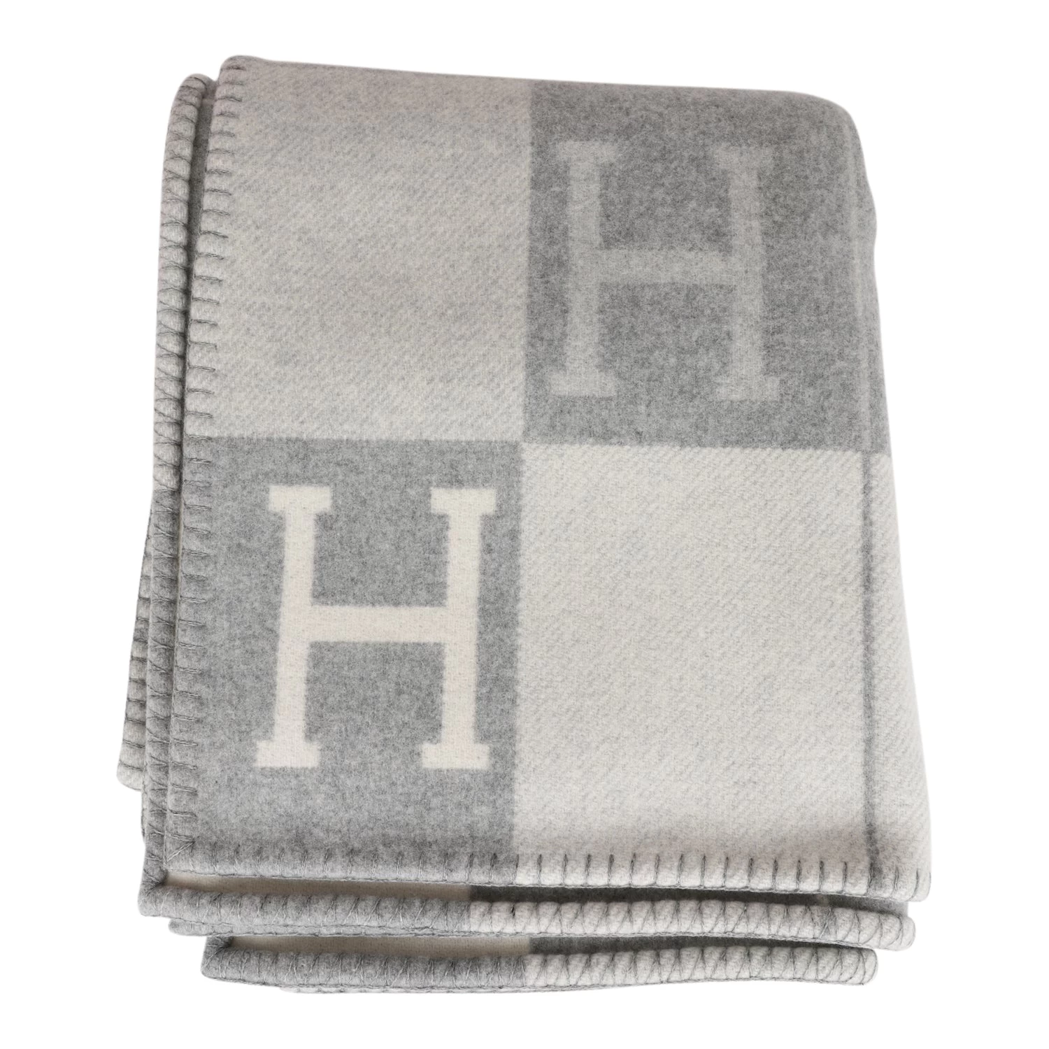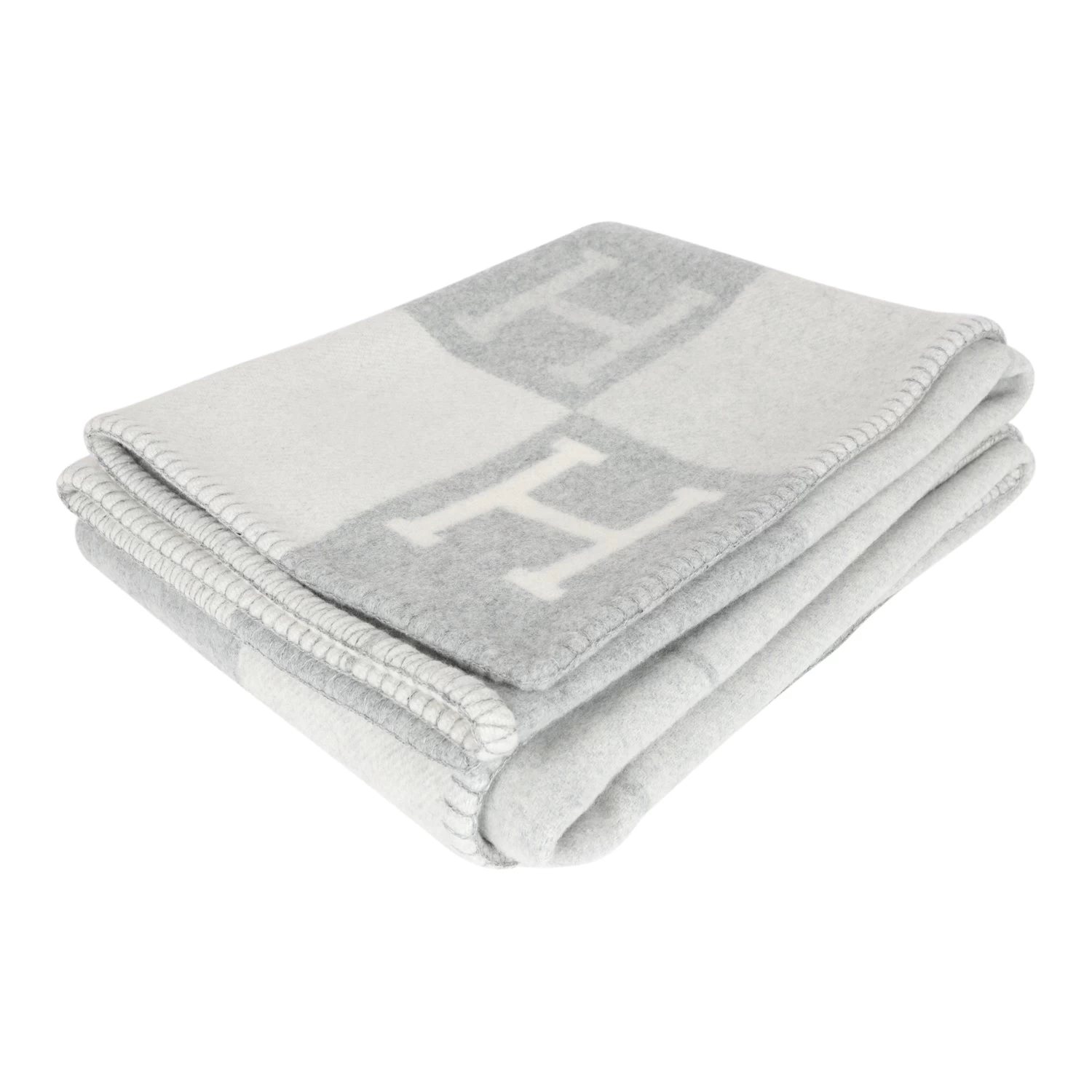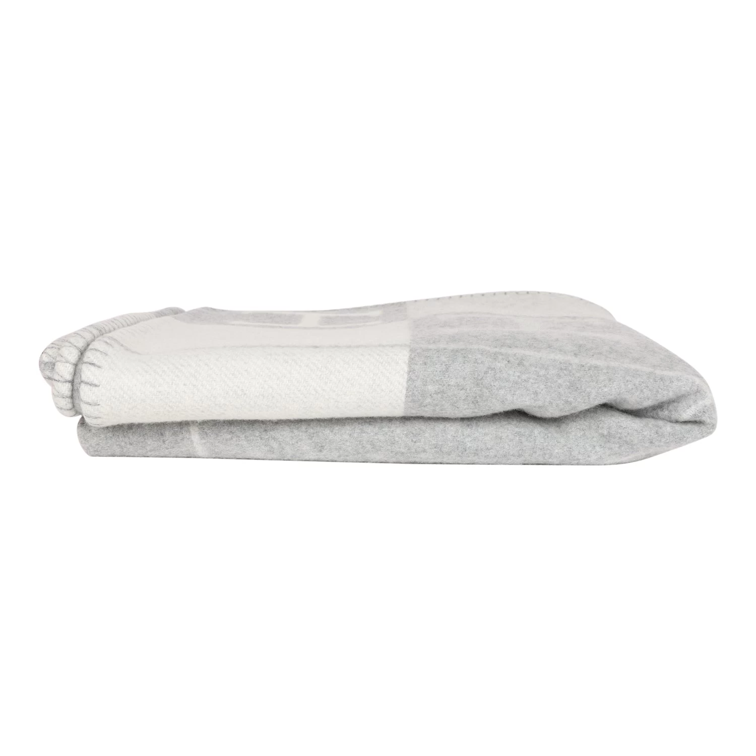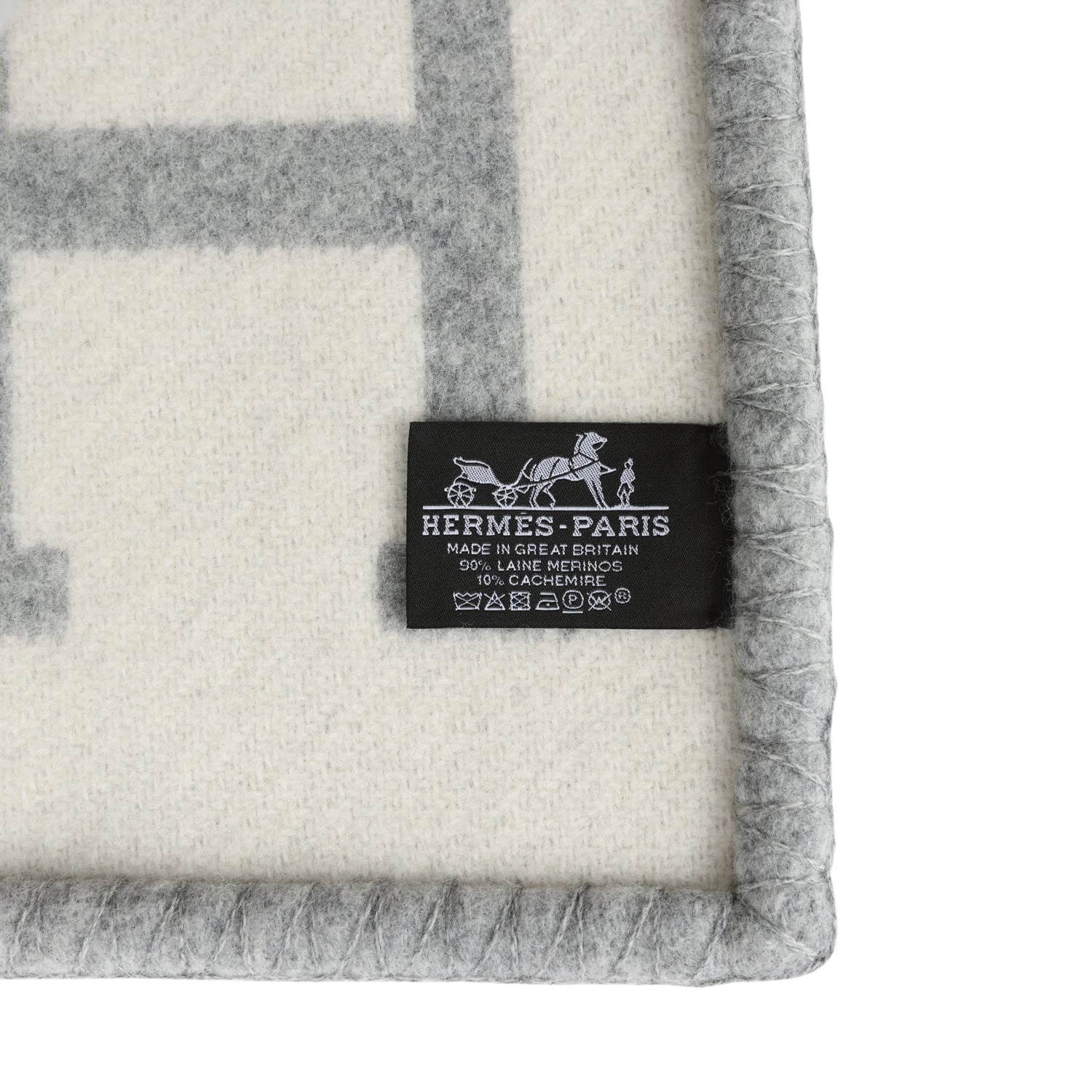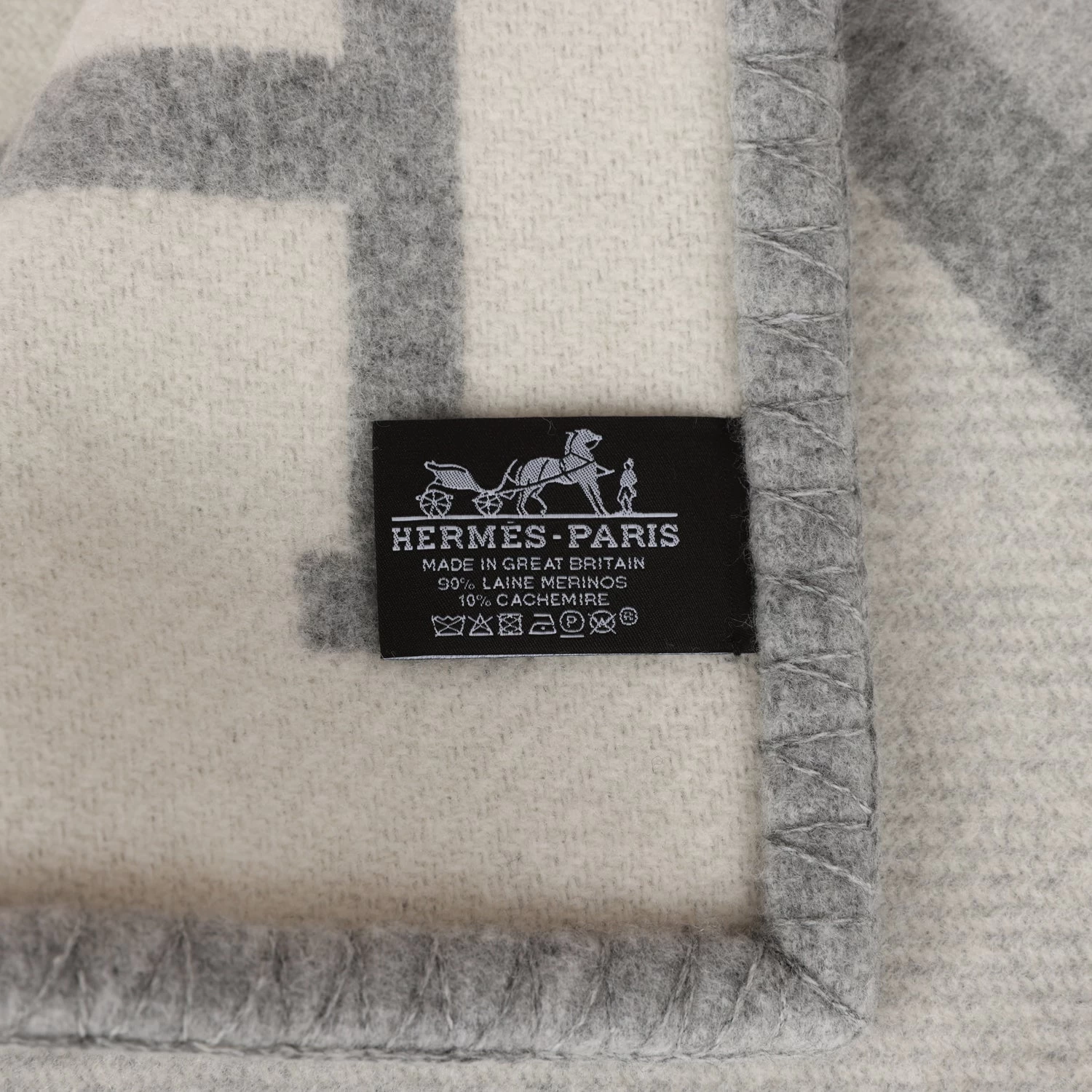 Hermes Classic Avalon Signature H blanket in ecru and gris clair made of 90% merino wool and 10% cashmere.