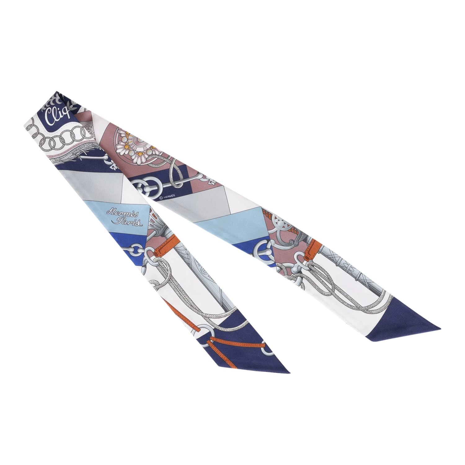 This silk twilly is in a marine colorway.