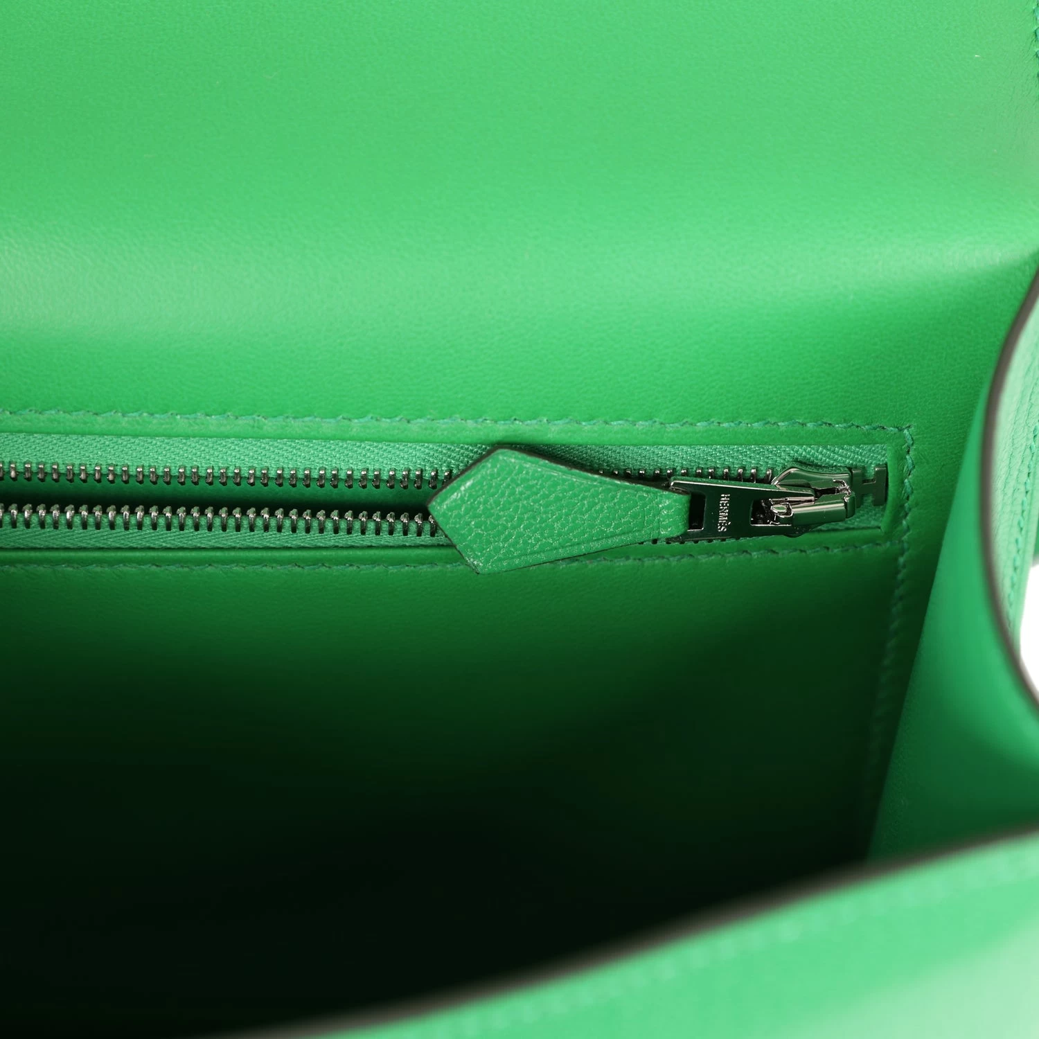 This Constance is in Bambou Chamkila Chevre with palladium hardware, has tonal stitching, a metal “H” snap lock closure and adjustable shoulder strap.