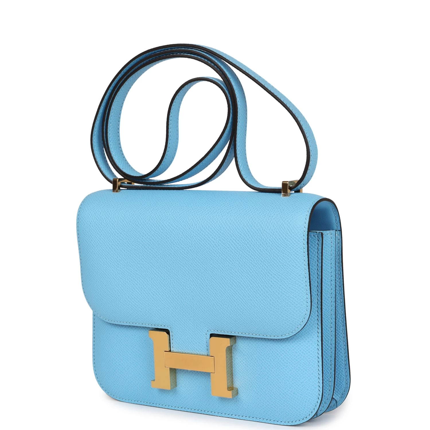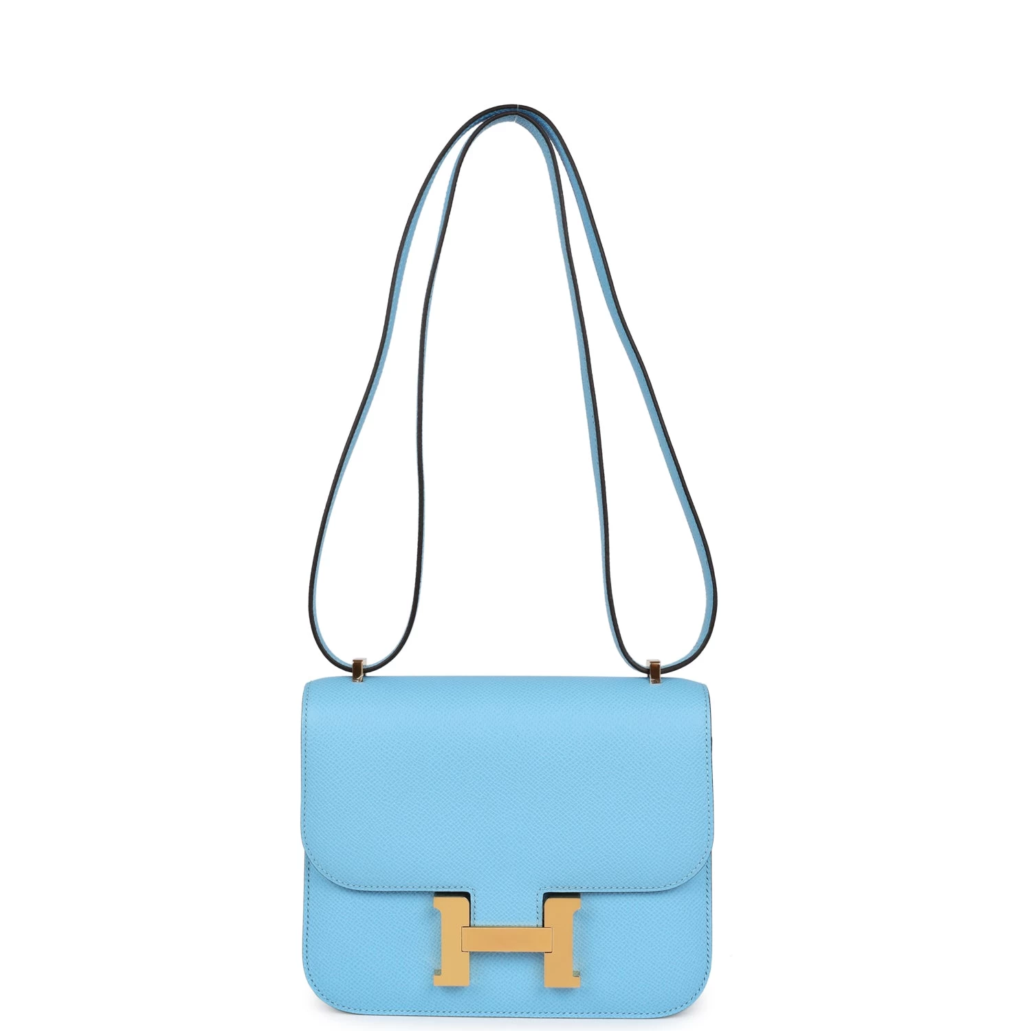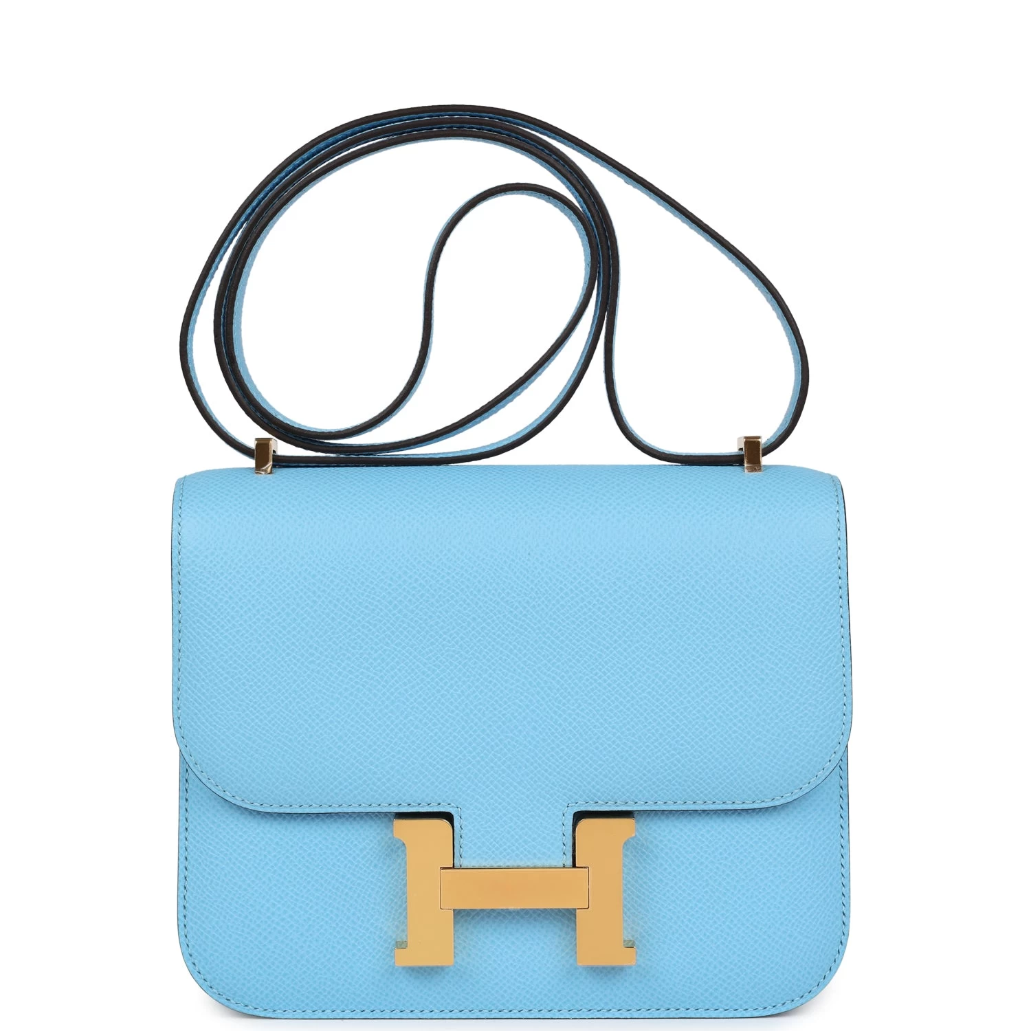 This Constance is in Celeste epsom leather with gold hardware and has tonal stitching, a metal “H” snap lock closure and adjustable shoulder strap.