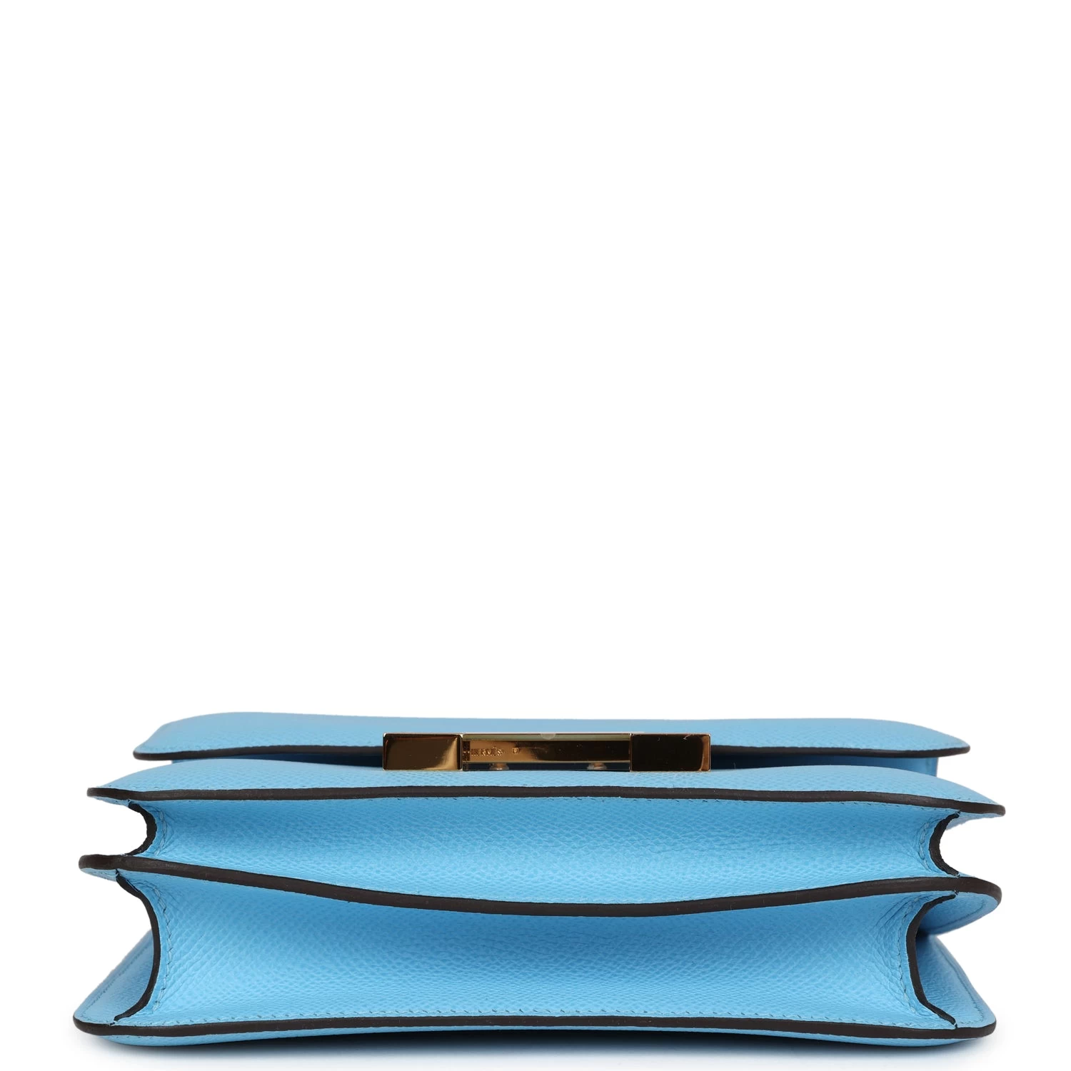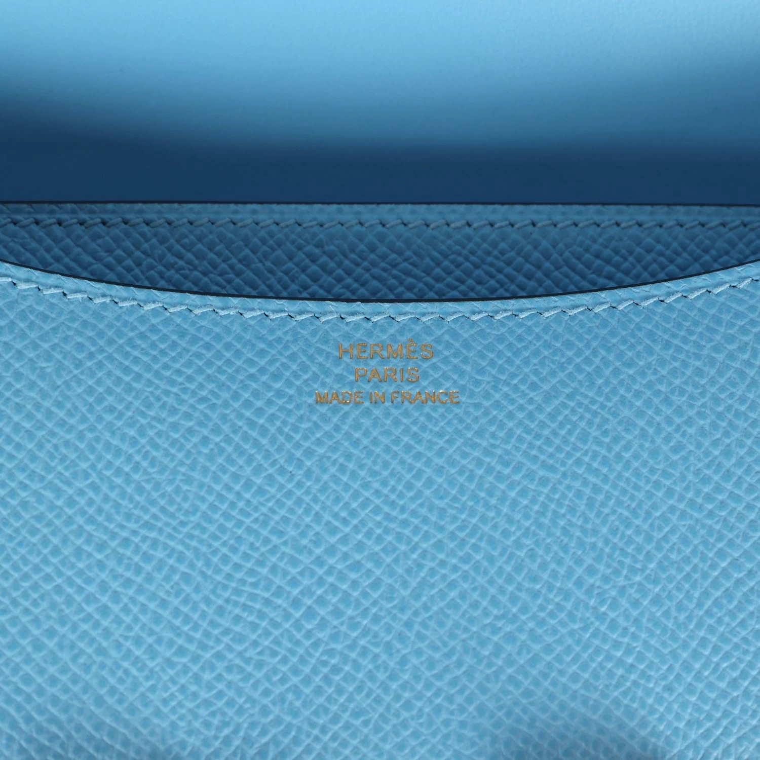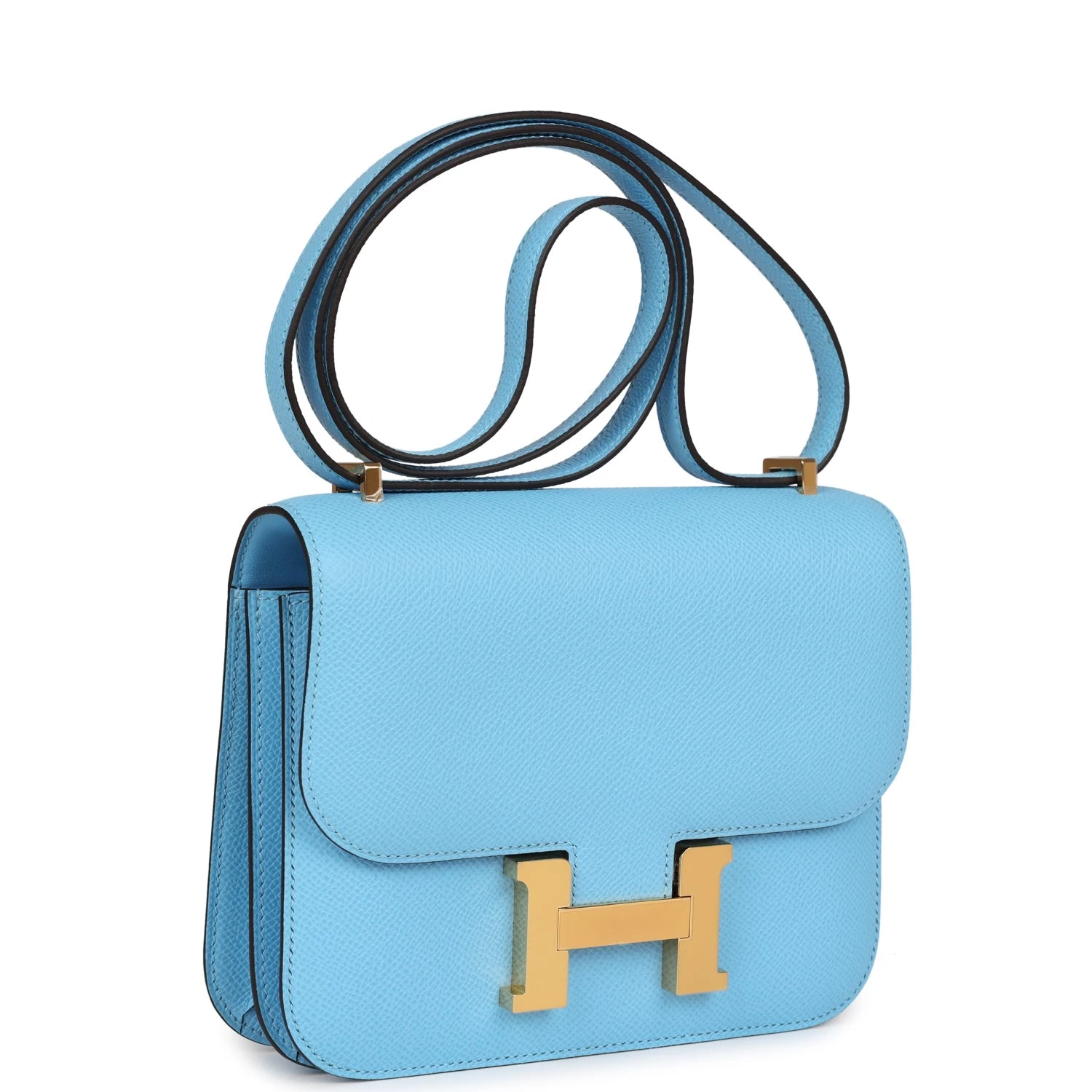 This Constance is in Celeste epsom leather with gold hardware and has tonal stitching, a metal “H” snap lock closure and adjustable shoulder strap.