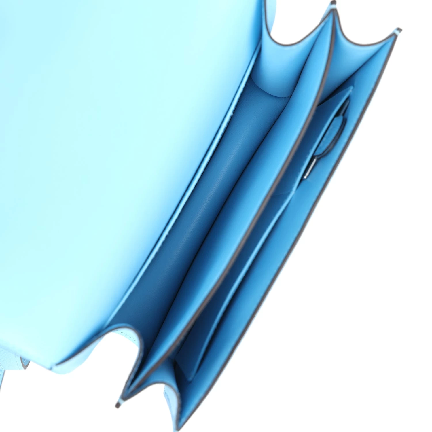 The interior is lined with Celeste lambskin and has an open pocket on the front wall, a center divide, removable mirror and a slit pocket on the back wall.