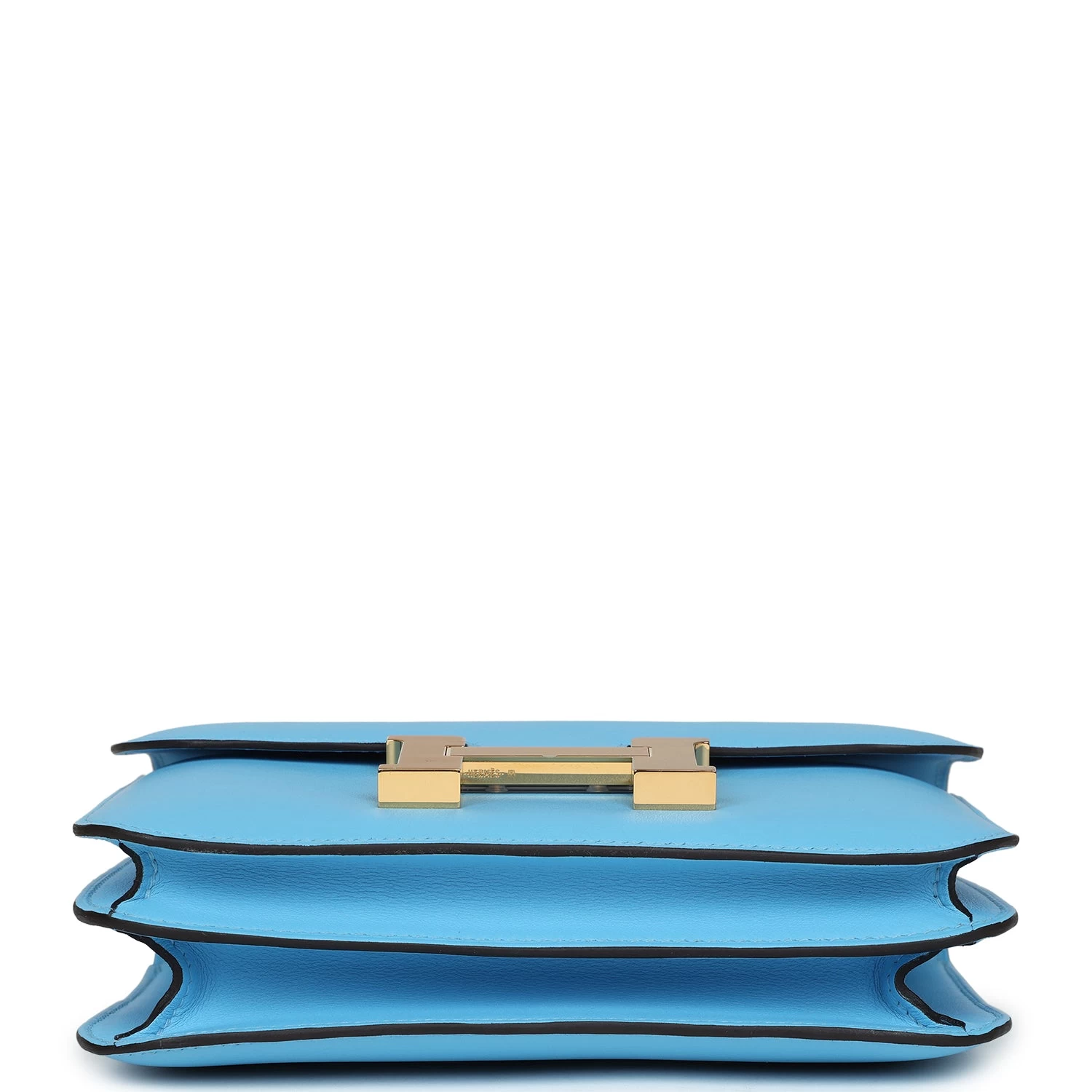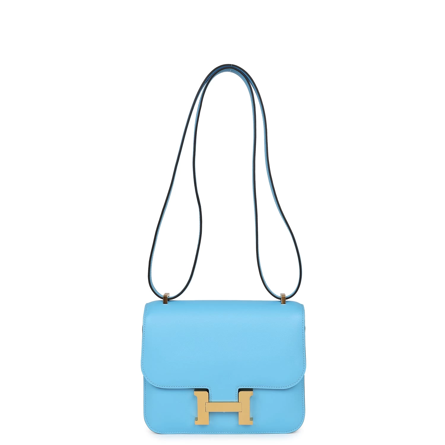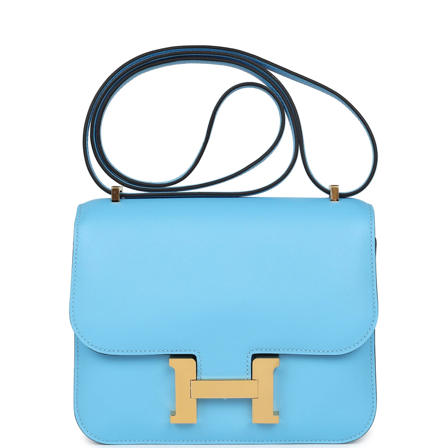 This Constance is in Celeste swift leather with gold hardware and has tonal stitching, a metal “H” snap lock closure and adjustable shoulder strap.