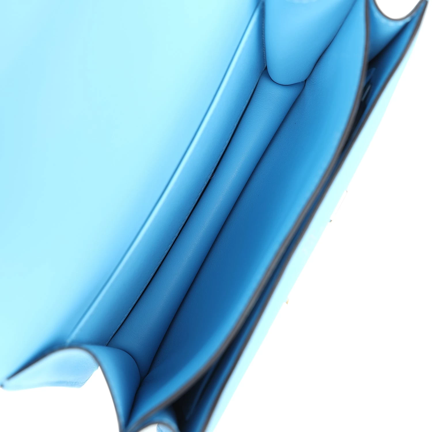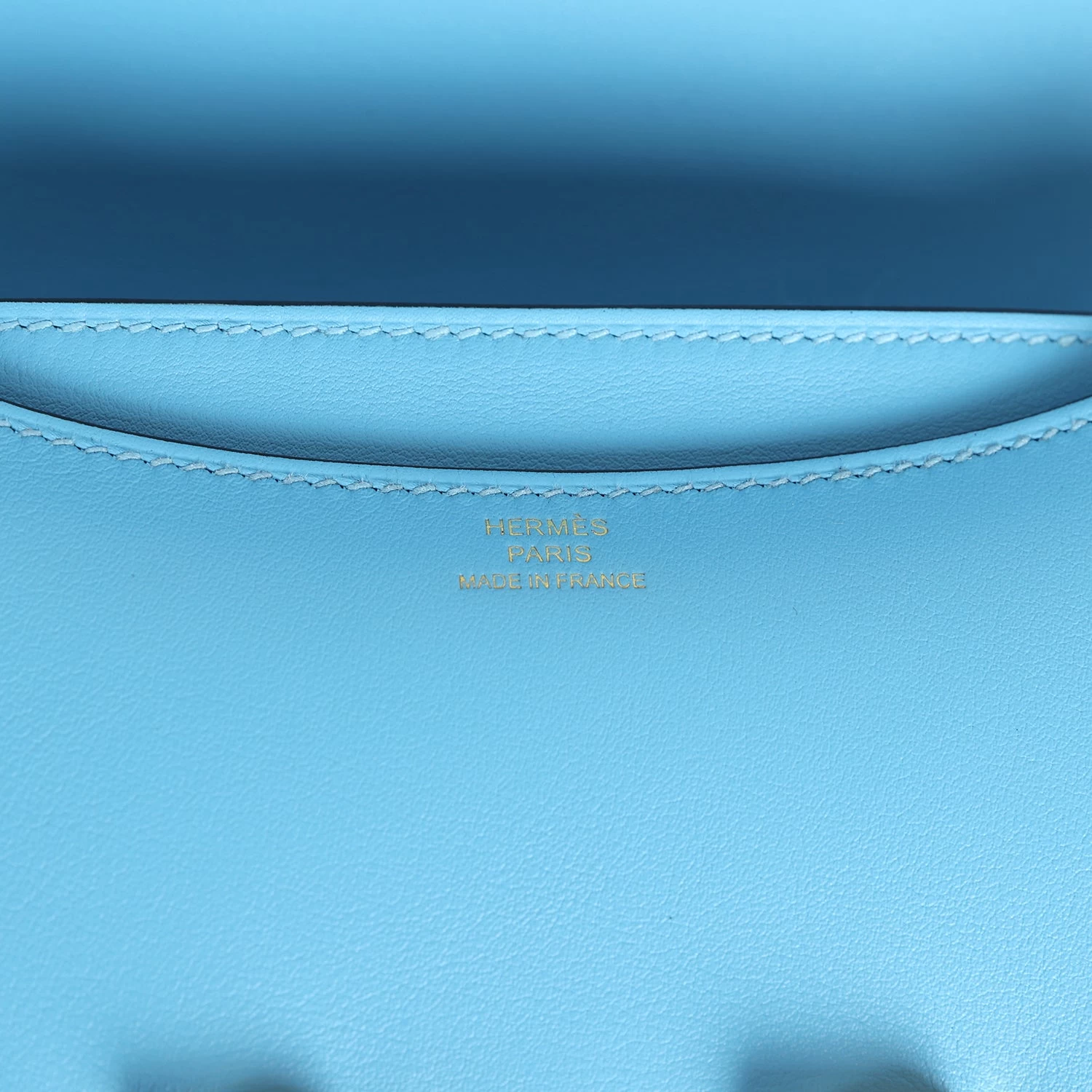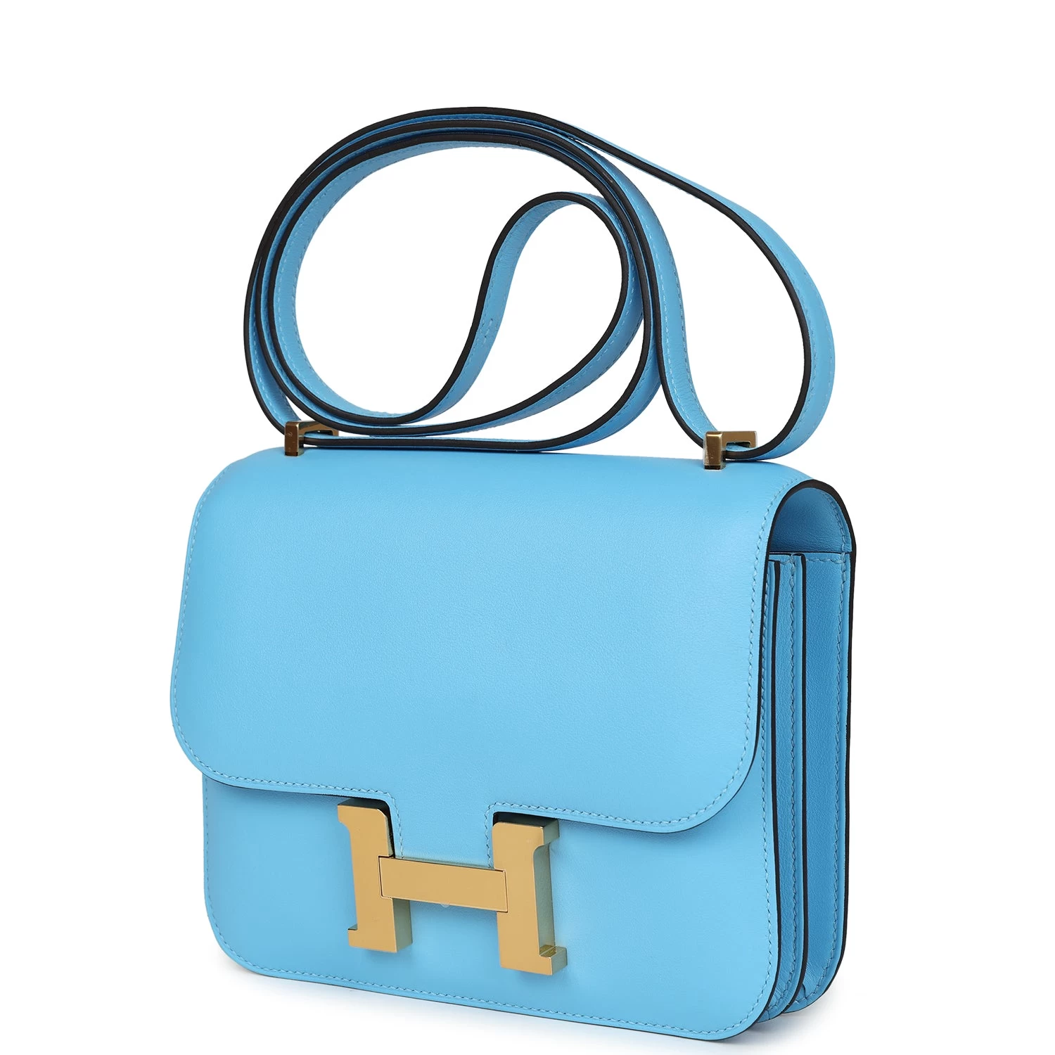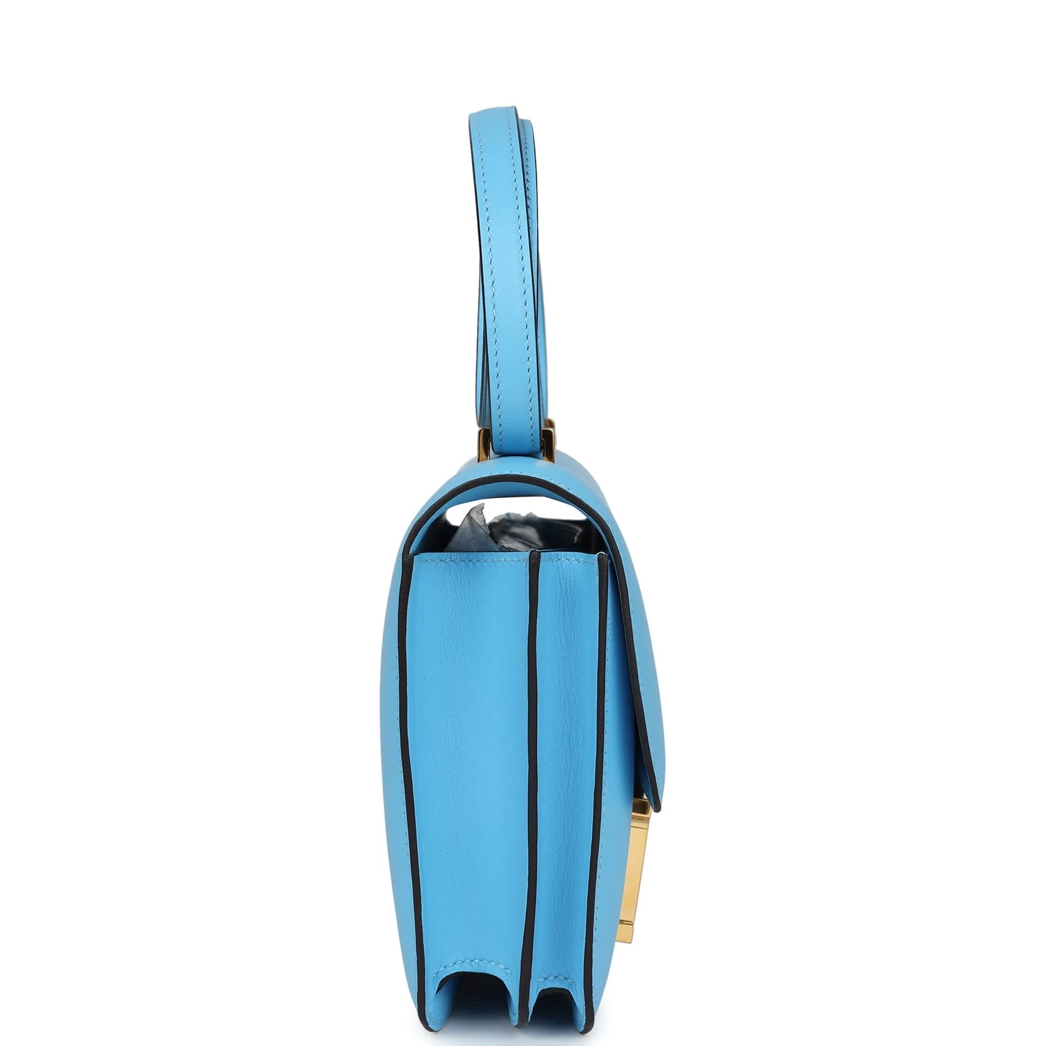 This Constance is in Celeste swift leather with gold hardware and has tonal stitching, a metal “H” snap lock closure and adjustable shoulder strap.