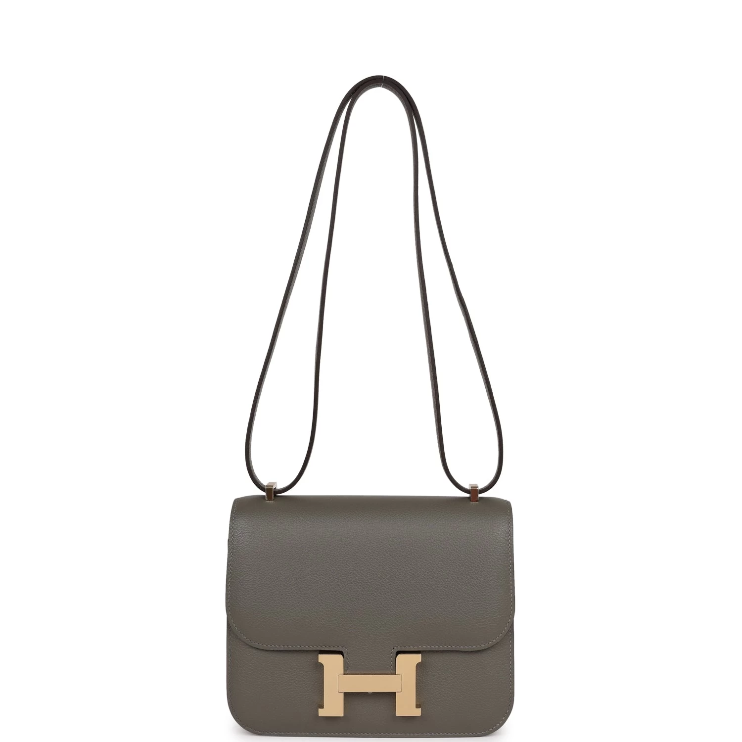 This Constance is a verso in Gris Meyer evercolor leather with permabrass hardware, tonal stitching, a metal “H” snap lock closure and adjustable shoulder strap.
