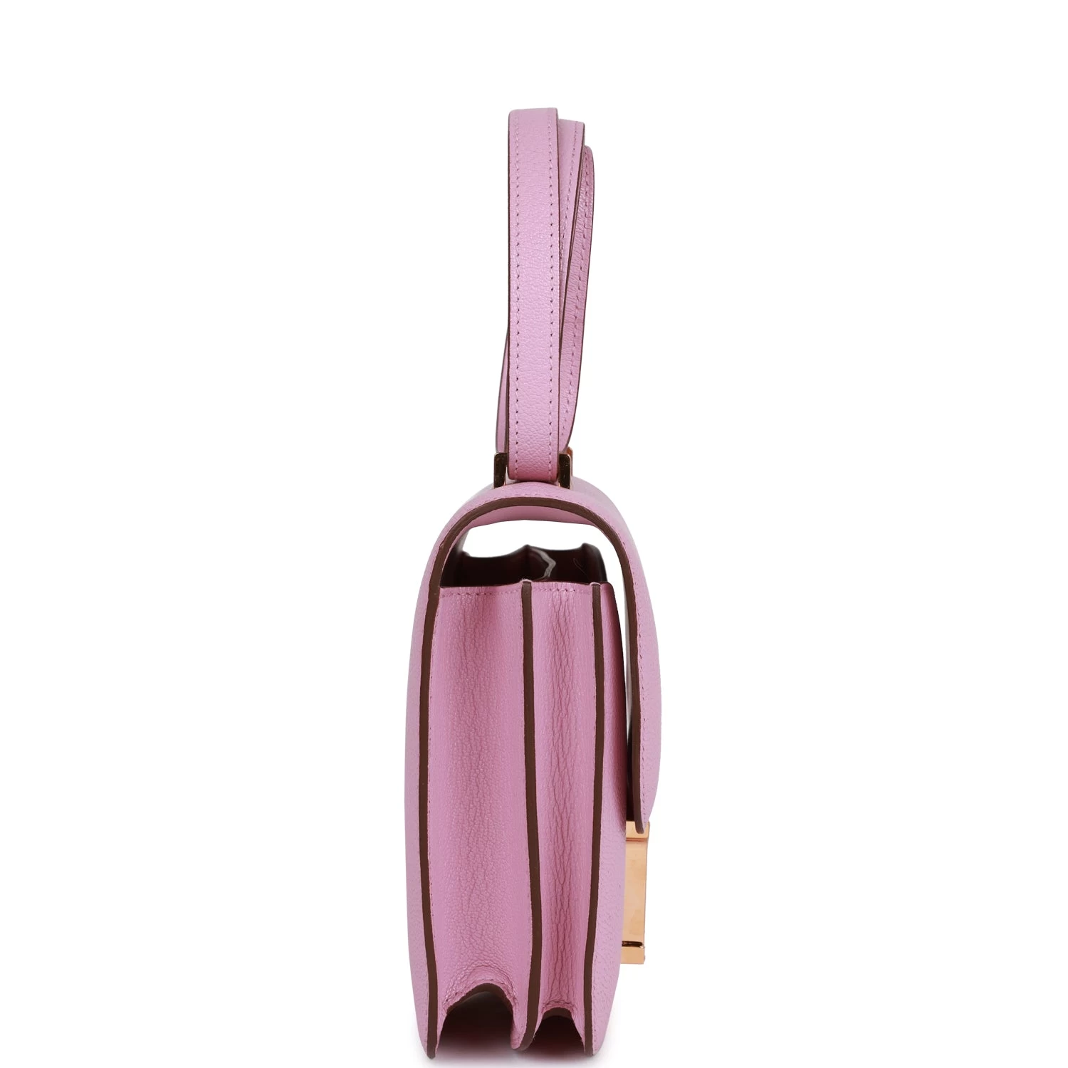 This Constance is in Mauve Sylvestre chevre leather with rose gold hardware and has tonal stitching, a metal “H” snap lock closure and adjustable shoulder strap.