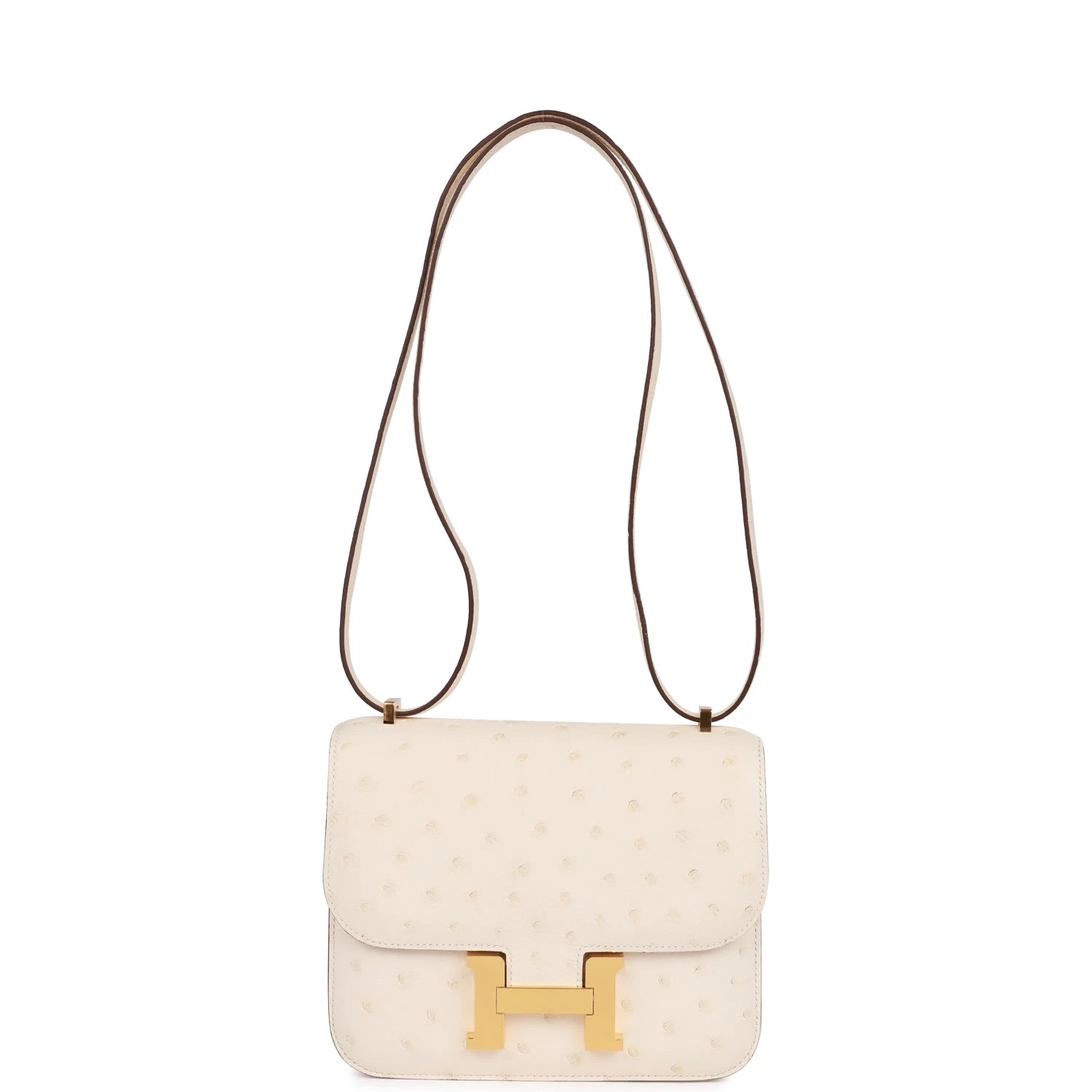 This Constance is of Nata ostrich with gold hardware and features tonal stitching, a “H” snap lock closure, and an adjustable shoulder strap.