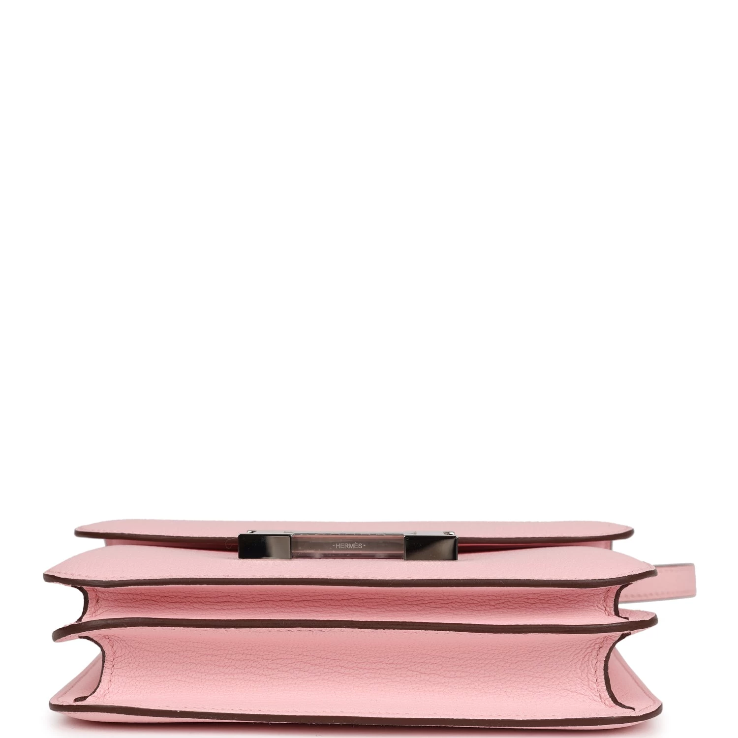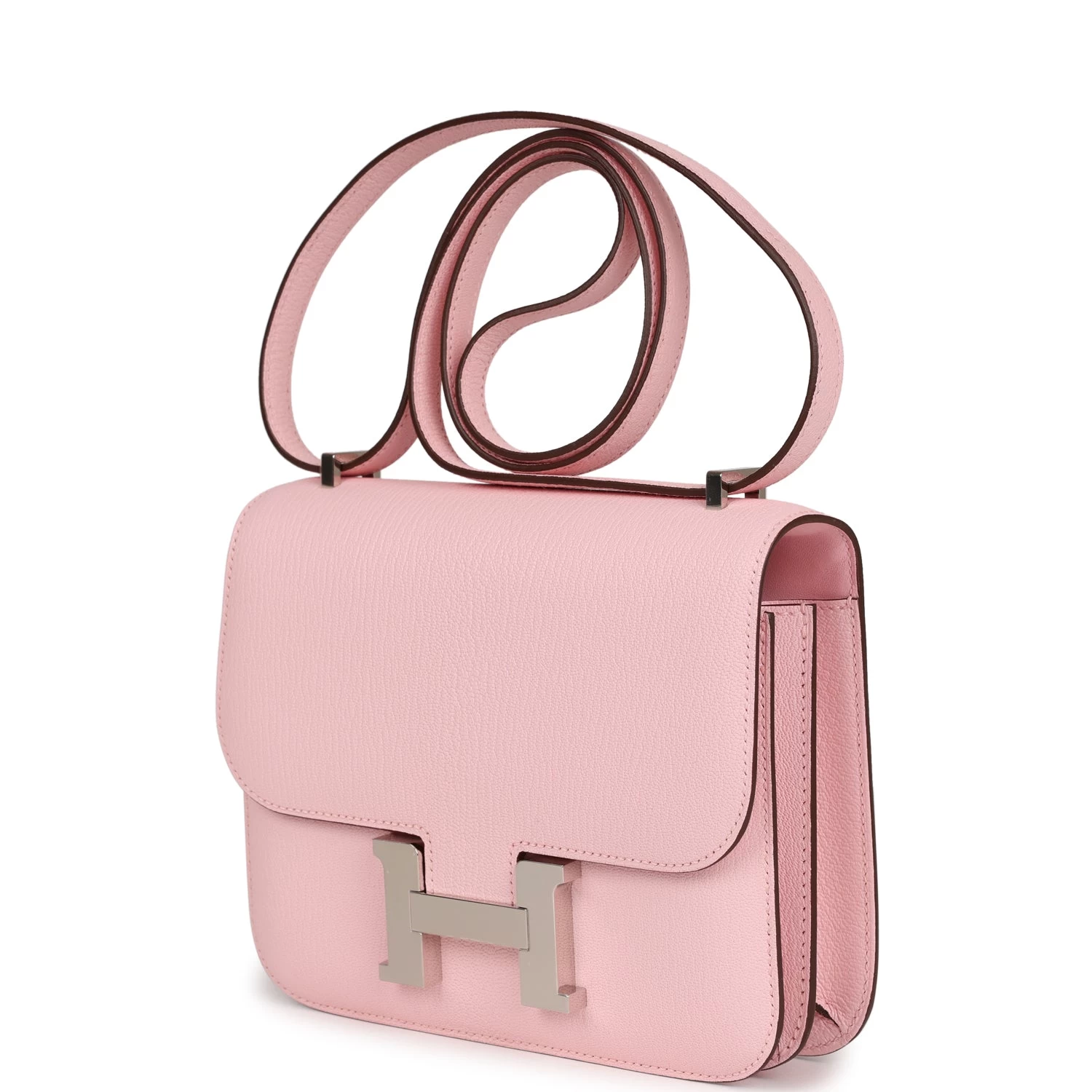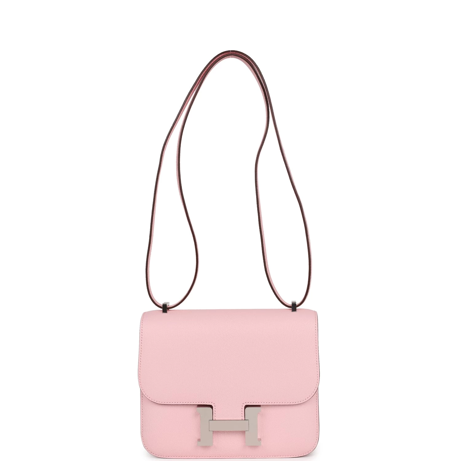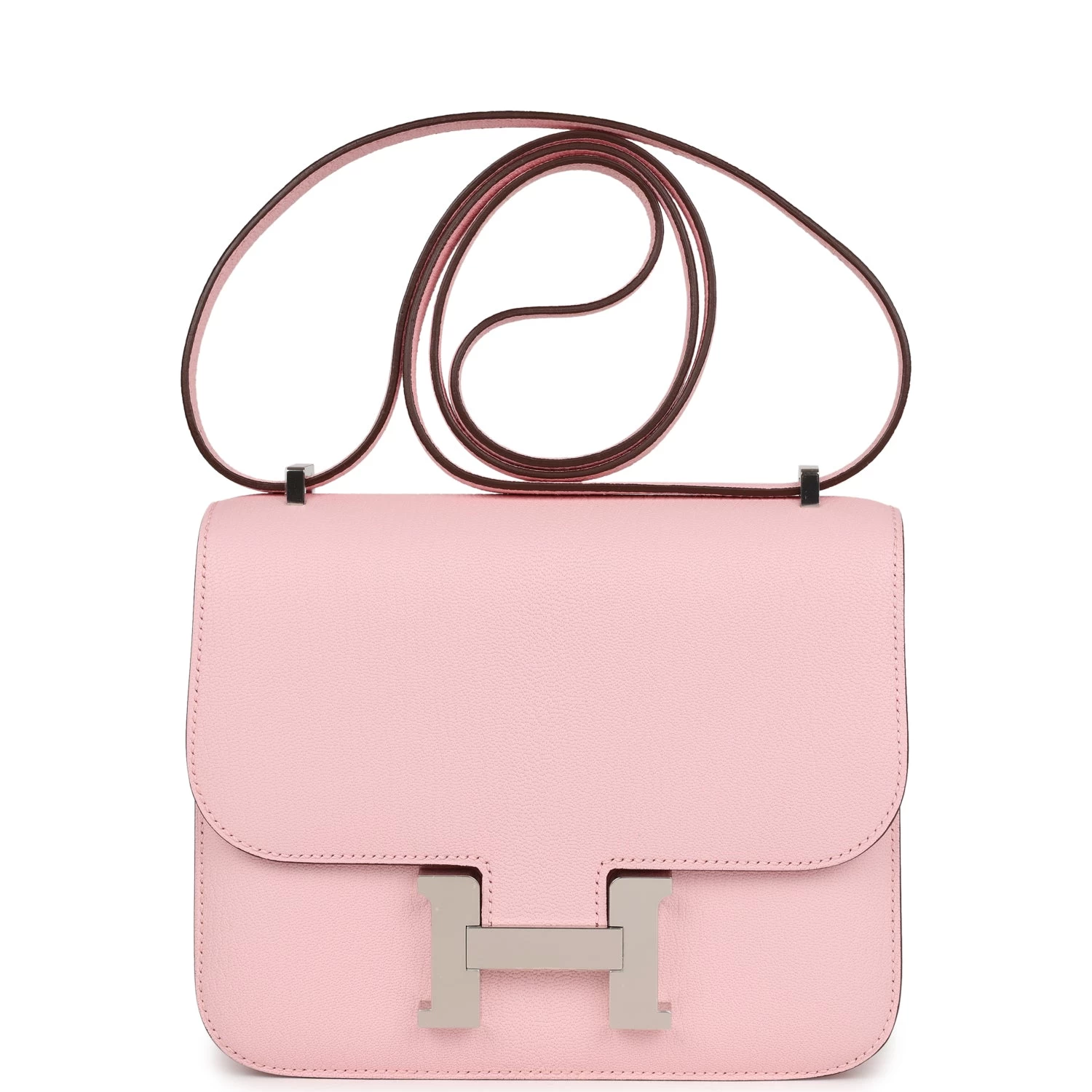 This Constance is in Rose Sakura chevre leather with palladium hardware and has tonal stitching, a metal “H” snap lock closure and adjustable shoulder strap.