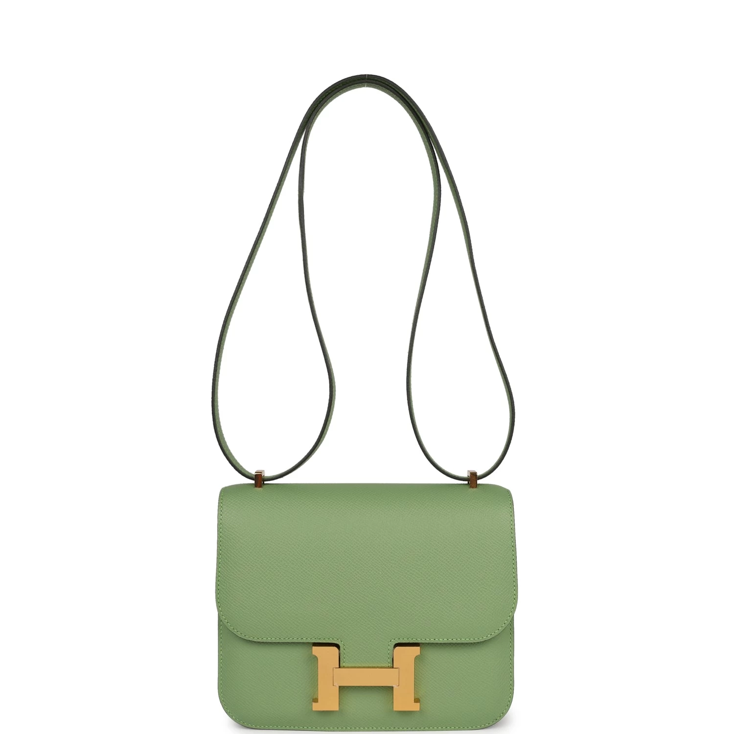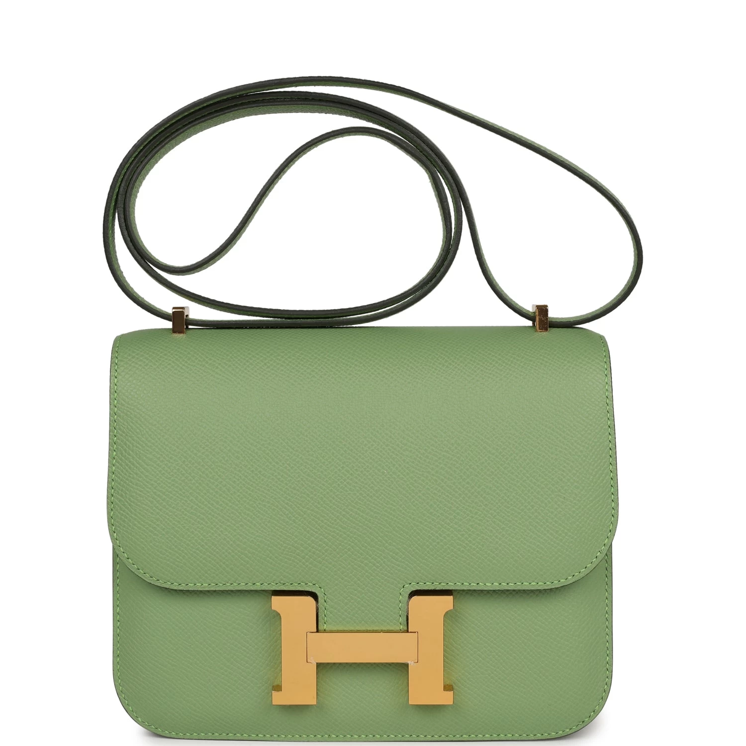 This Constance is in Vert Criquet epsom leather with gold hardware, has tonal stitching, a metal “H” snap lock closure, and an adjustable shoulder strap.