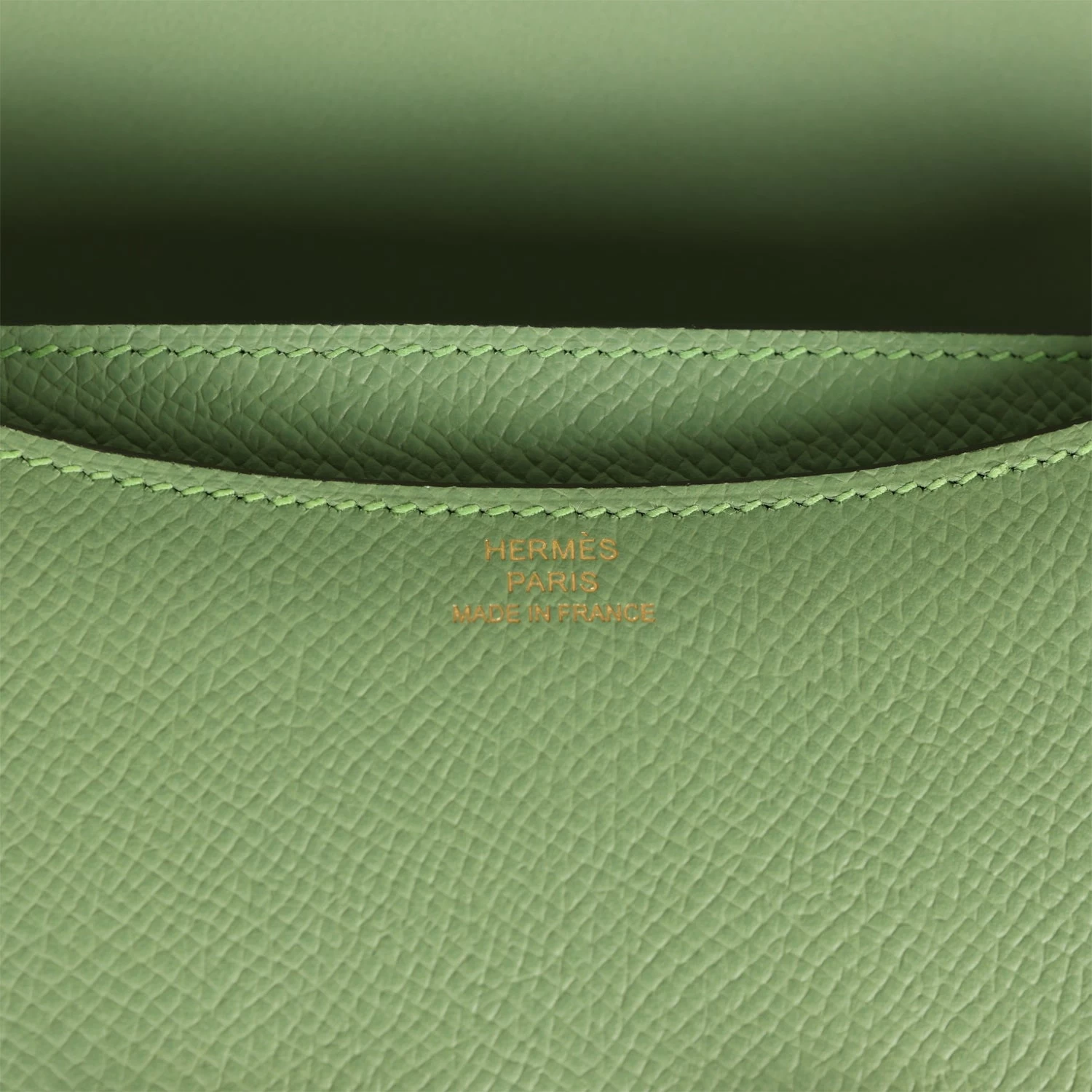 The interior is lined with Vert Criquet lambskin leather and has a zip pocket with an Hermes engraved pull.