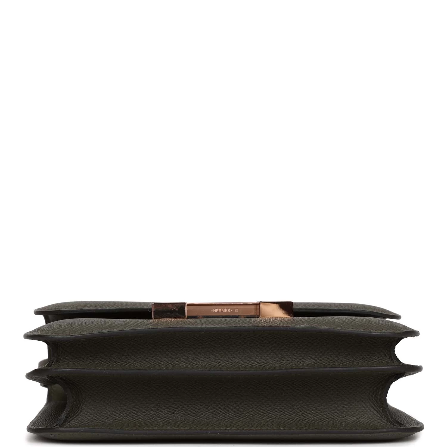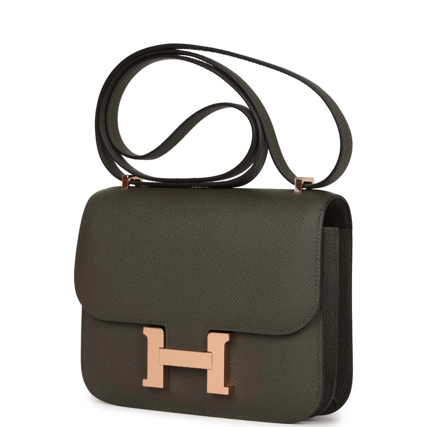 This Constance is in Vert de Gris epsom leather with rose gold hardware, has tonal stitching, a metal “H” snap lock closure, and an adjustable shoulder strap.