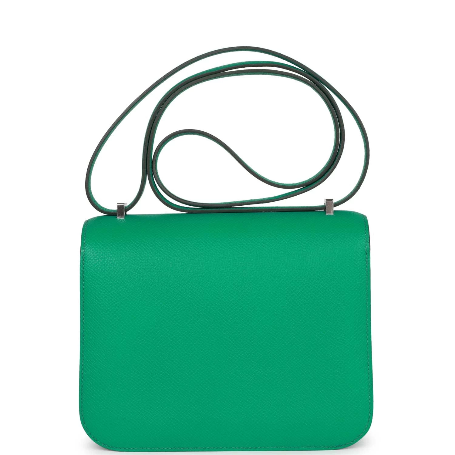 This Constance is in Vert Jade epsom leather with palladium hardware, has tonal stitching, a metal “H” snap lock closure and adjustable shoulder strap.