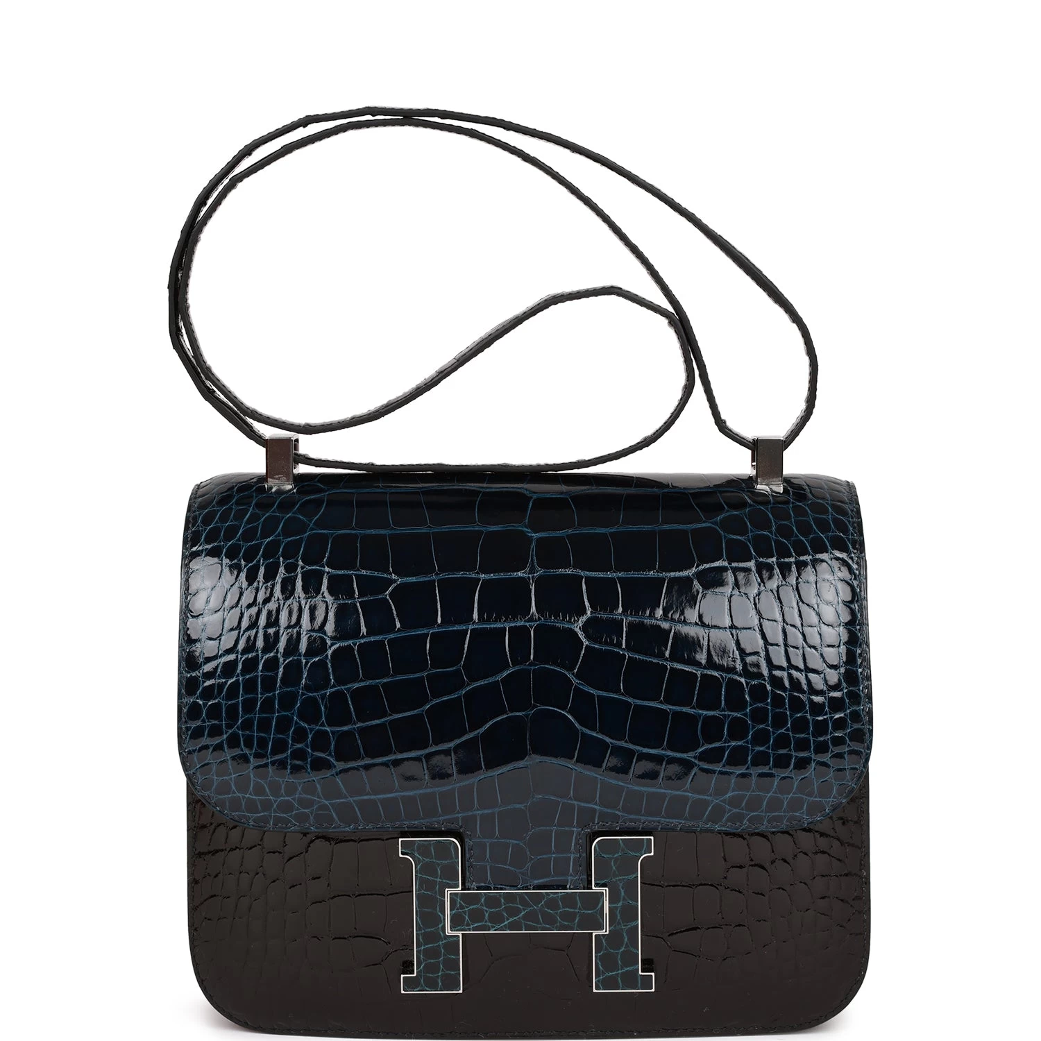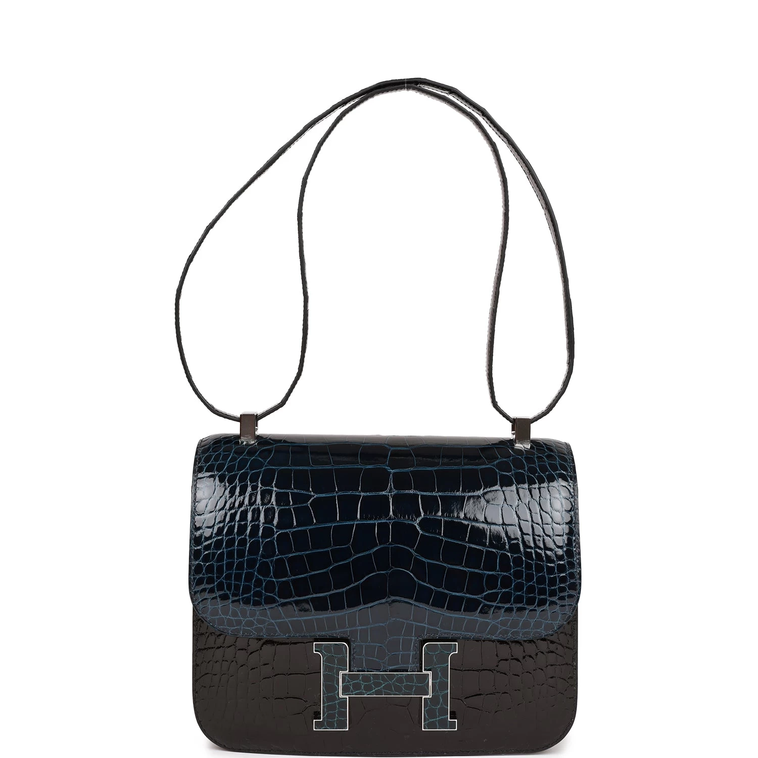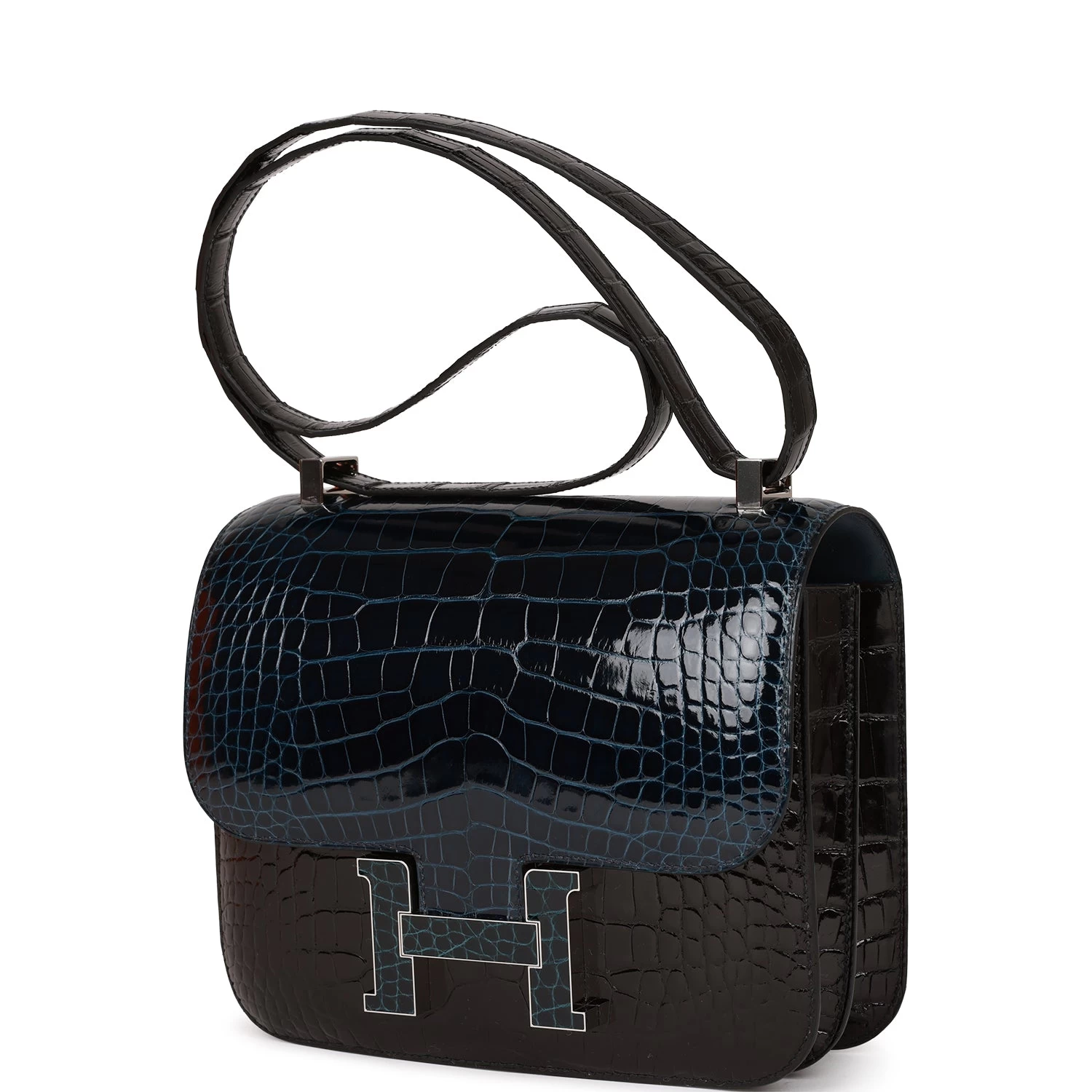 This Rare Constance is of Black, Bleu Baltique and Vert Rousseau shiny alligator with palladium hardware and features tonal stitching, a “H” snap lock closure, and an adjustable shoulder strap.